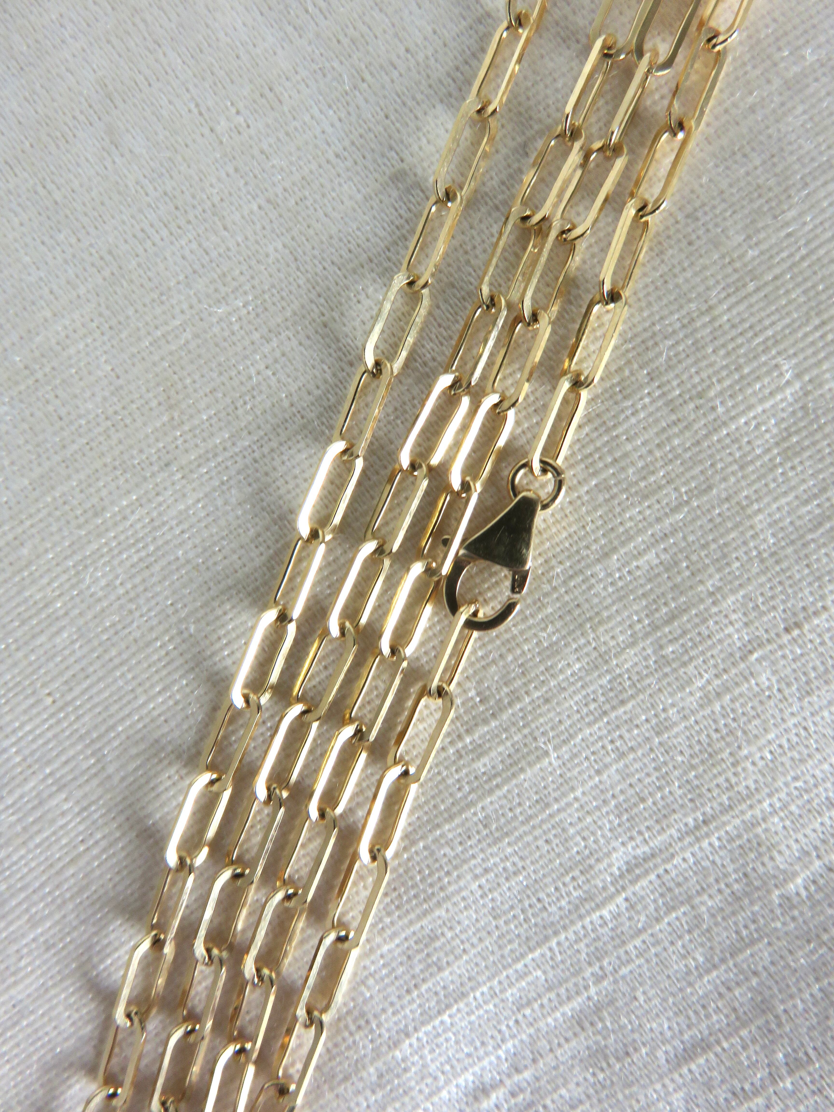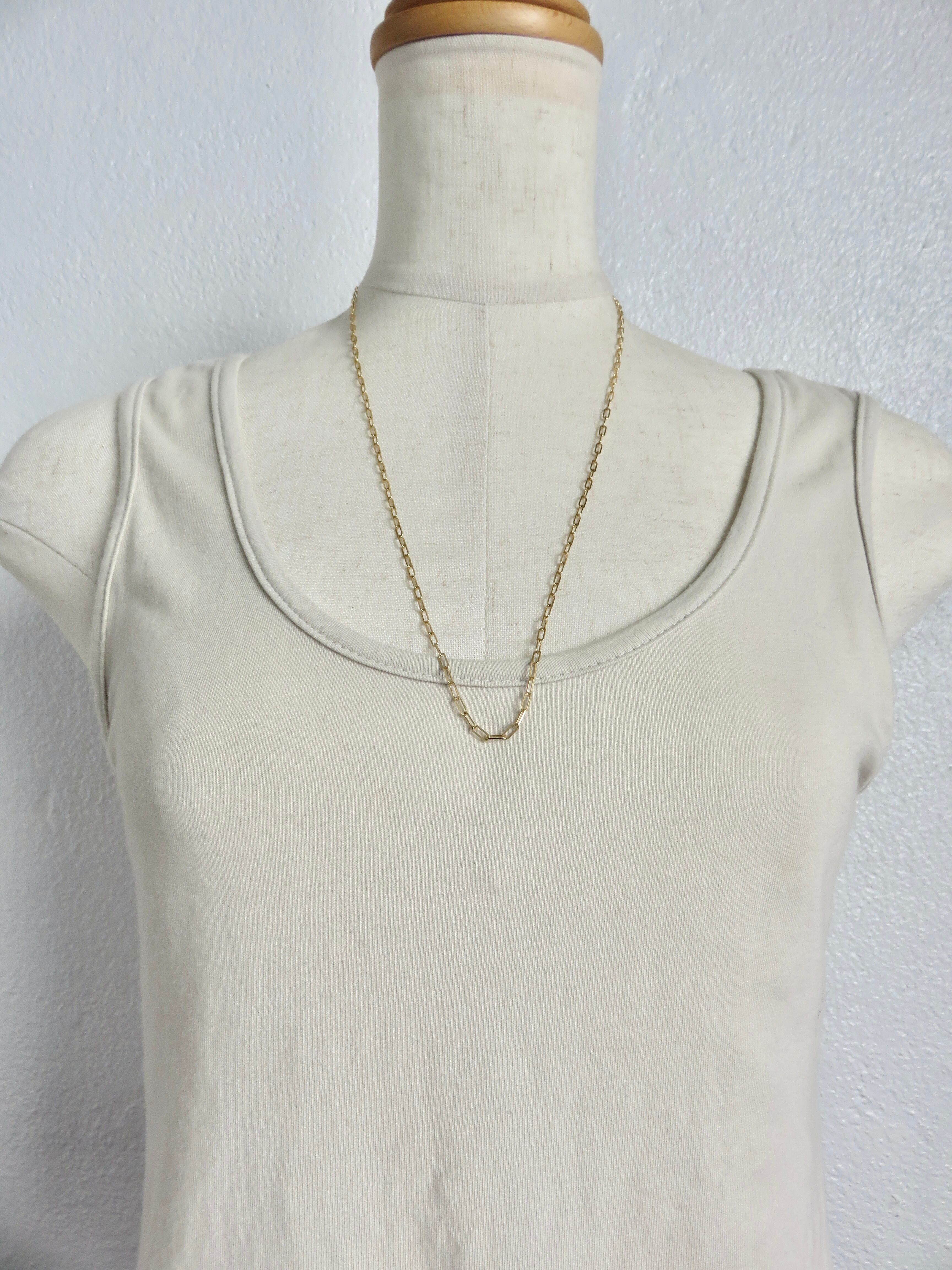 「コミチの石」オリジナル仕様でデザインした、シンプルなK18製ロングチェーンです。チェーンの輪っかの形がソリッドで以前のタイプより少しクールな印象の新デザインで、こちらの方がボリュームもあります。