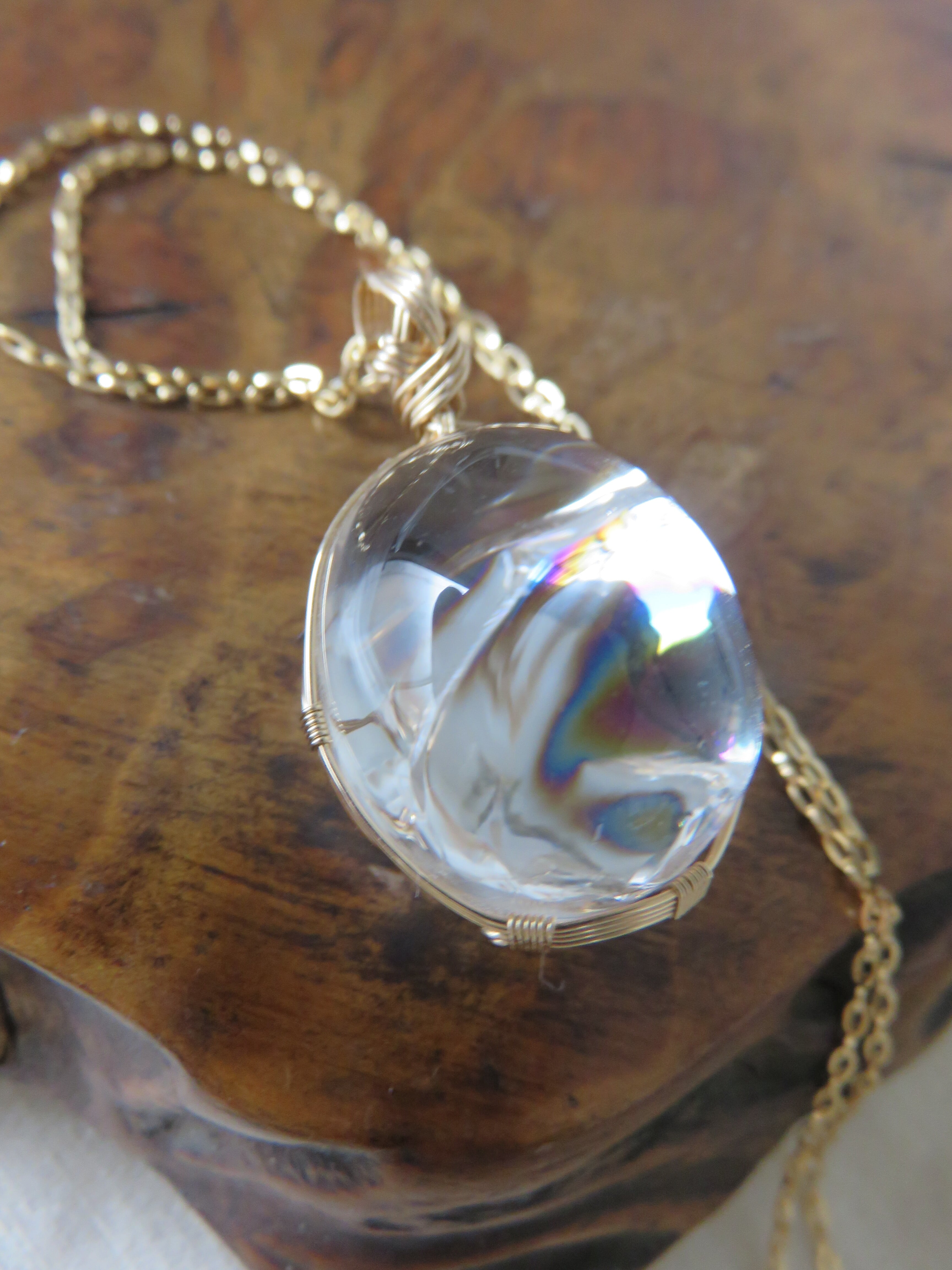 シンプルな女神巻きが非常に映える石で、暗い色の服に合わせていただくと虹がくっきり見え、明るい色の服では爽やかな透明感が生きてどんな服装でも映えていつでも身につけてご愛用いただけます。