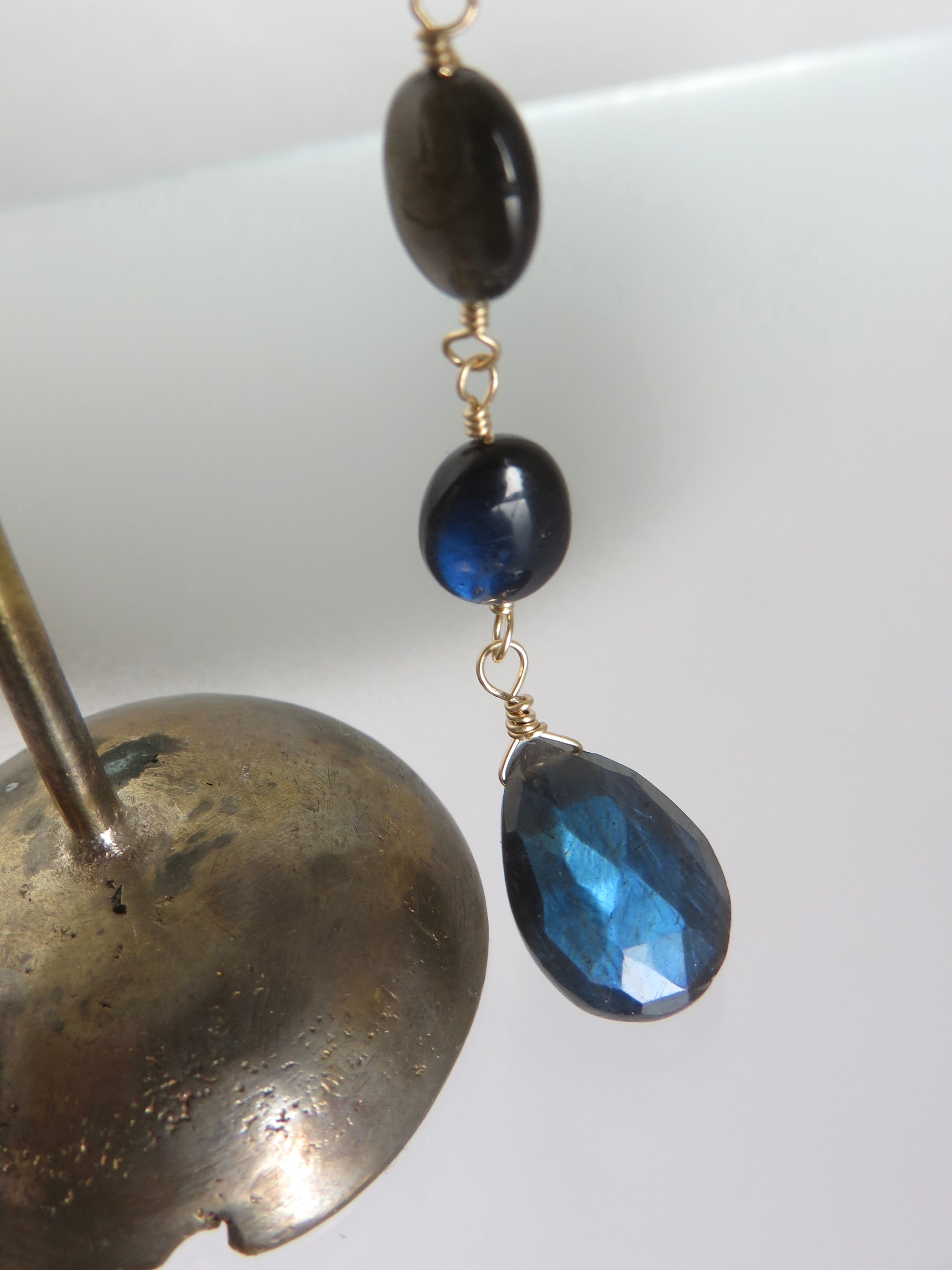 カットの入ったペアシェイプとつるんとしたオーバルシェイプの2種類の形状のラブラドライトを組み合わせた夜のしずくのようなピアス。