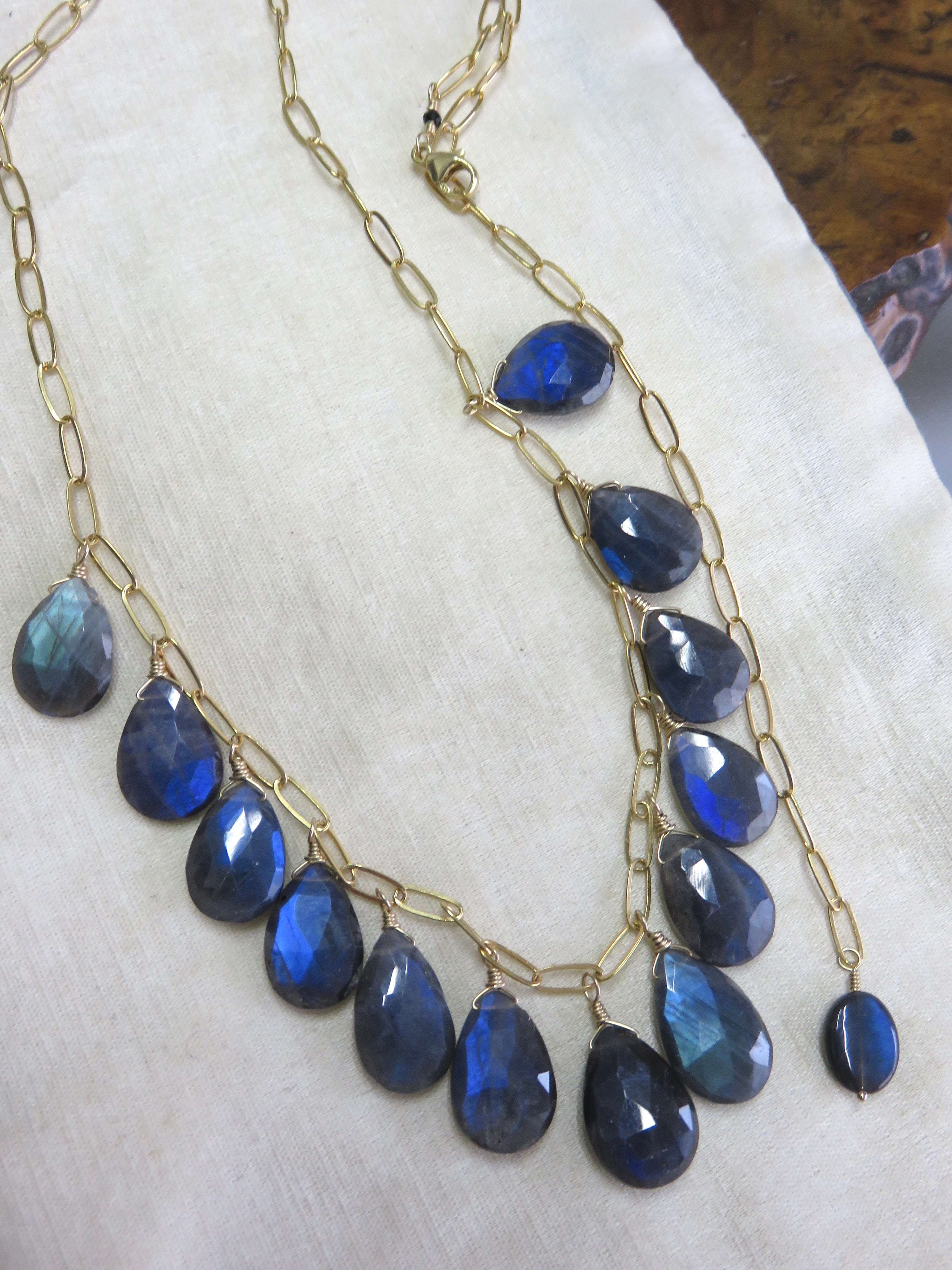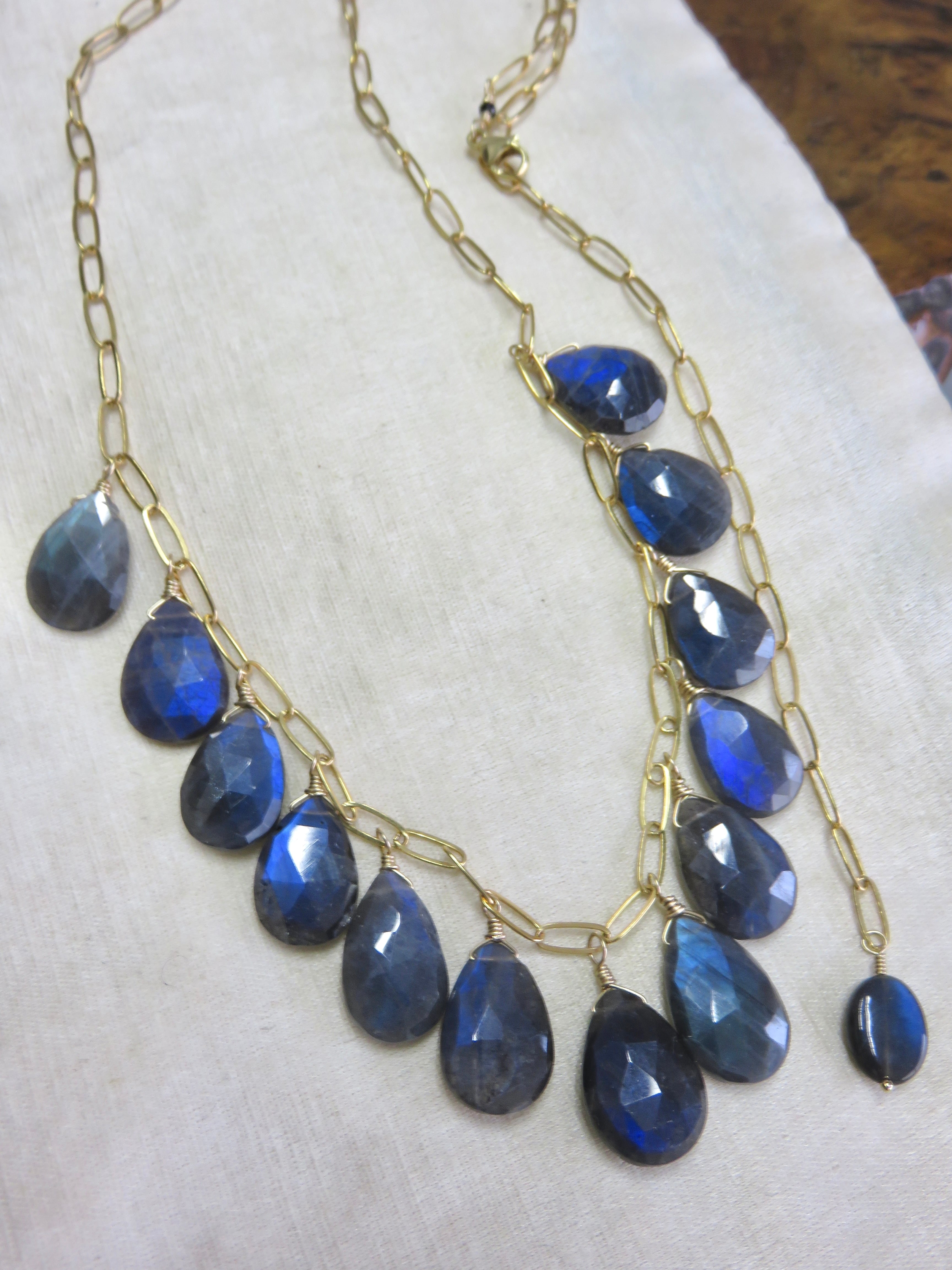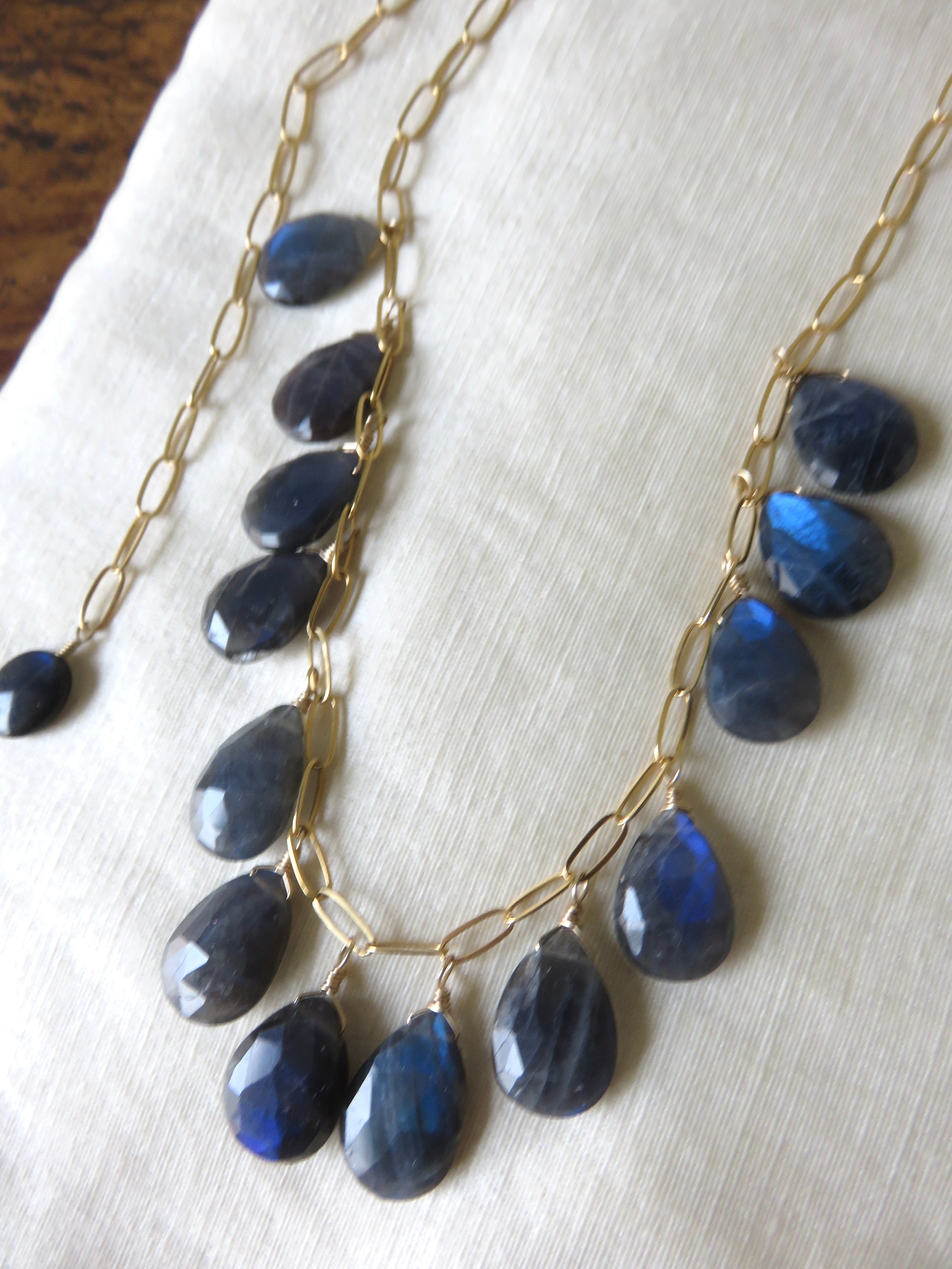 夜のしずくのようなペアシェイプカットのラブラドライトを贅沢に使ったデザインネックレスです。