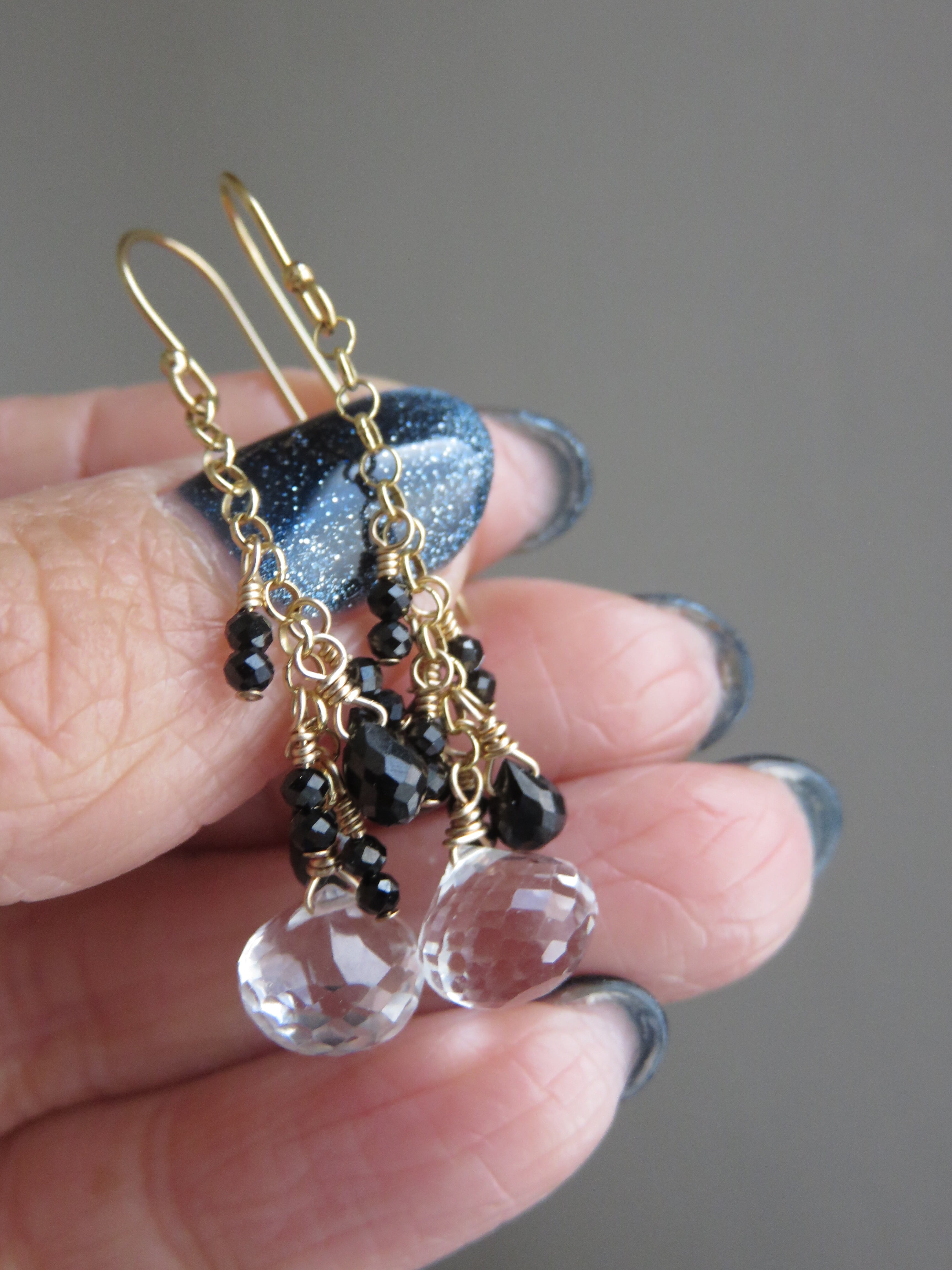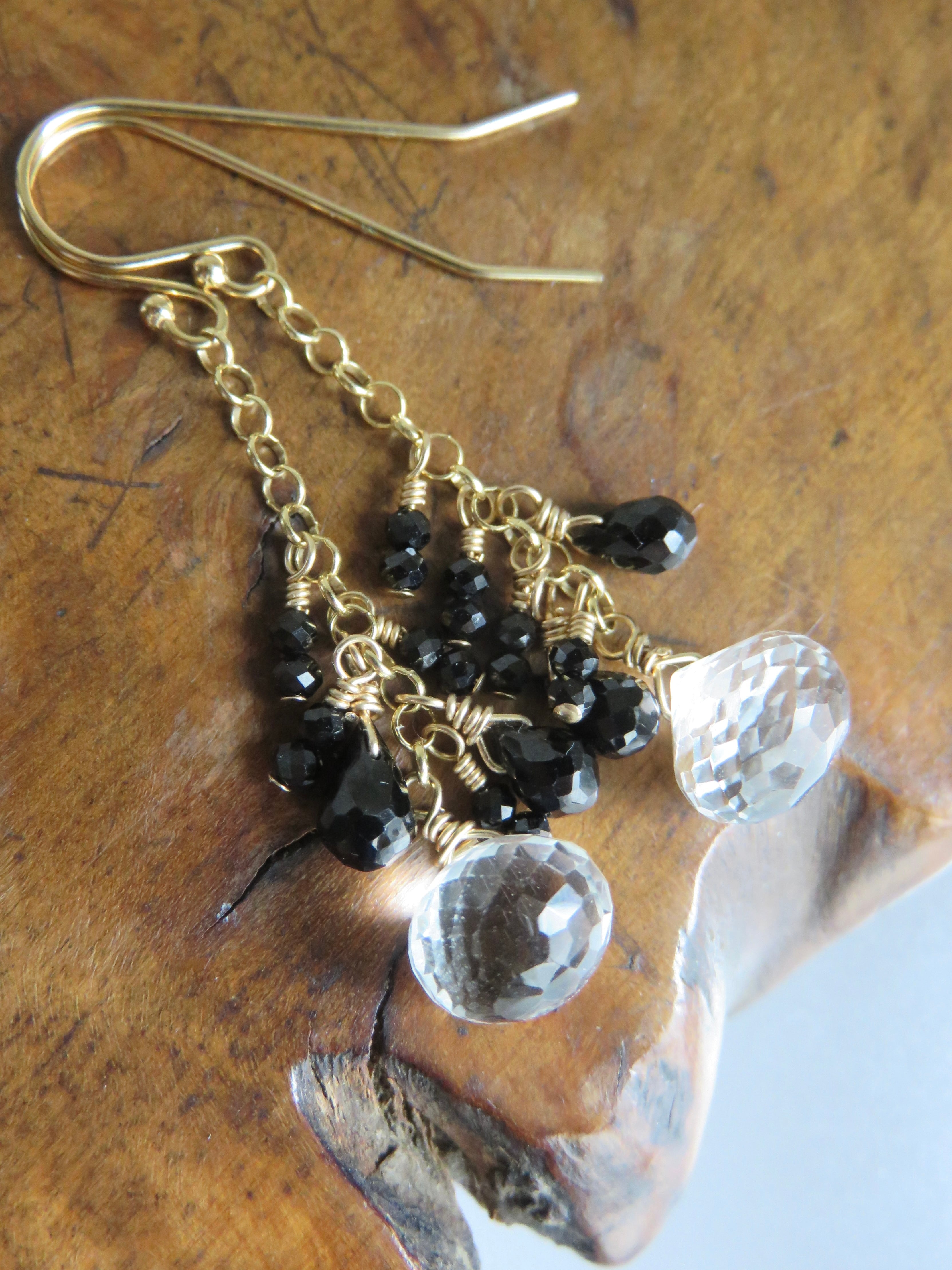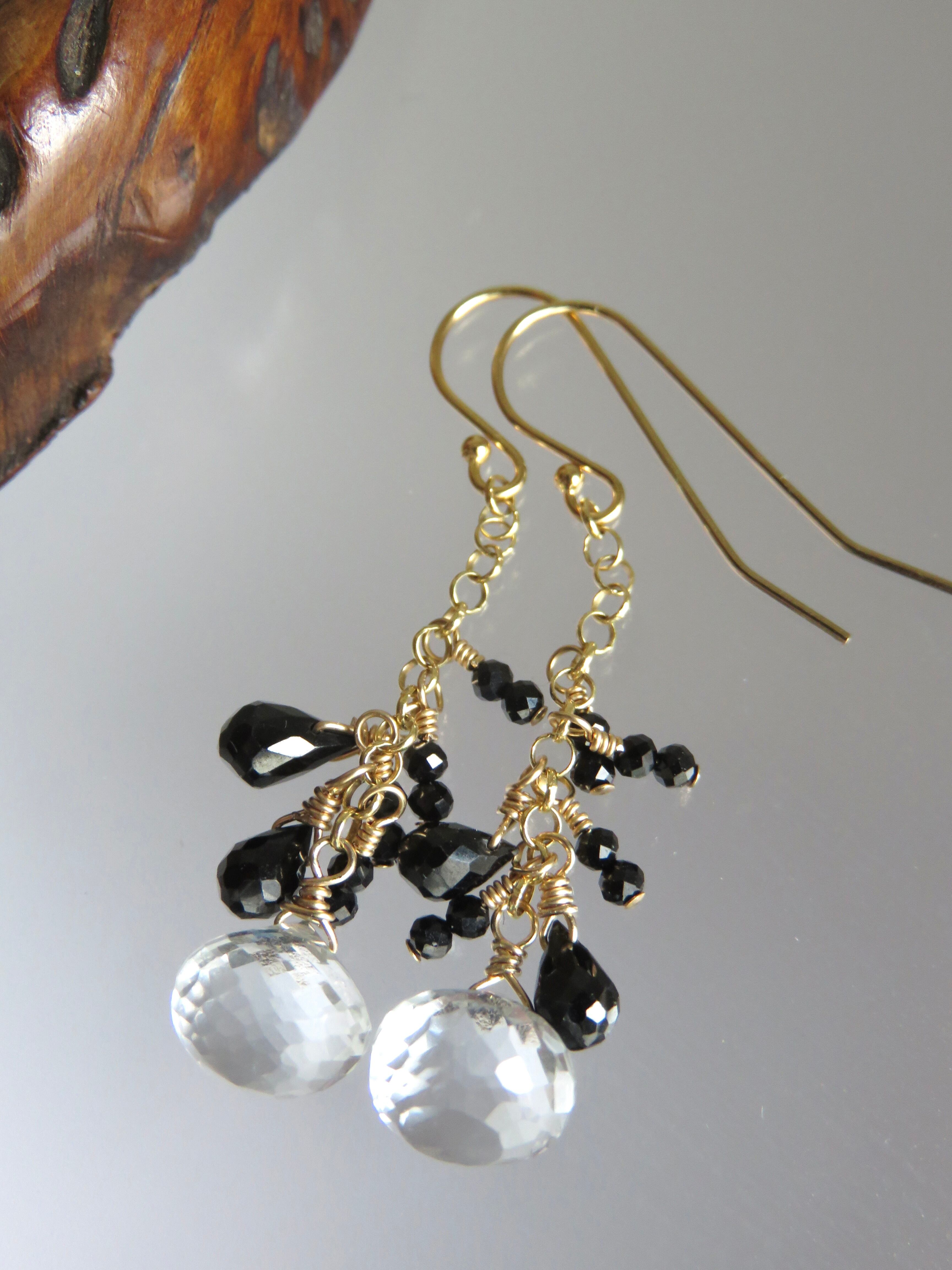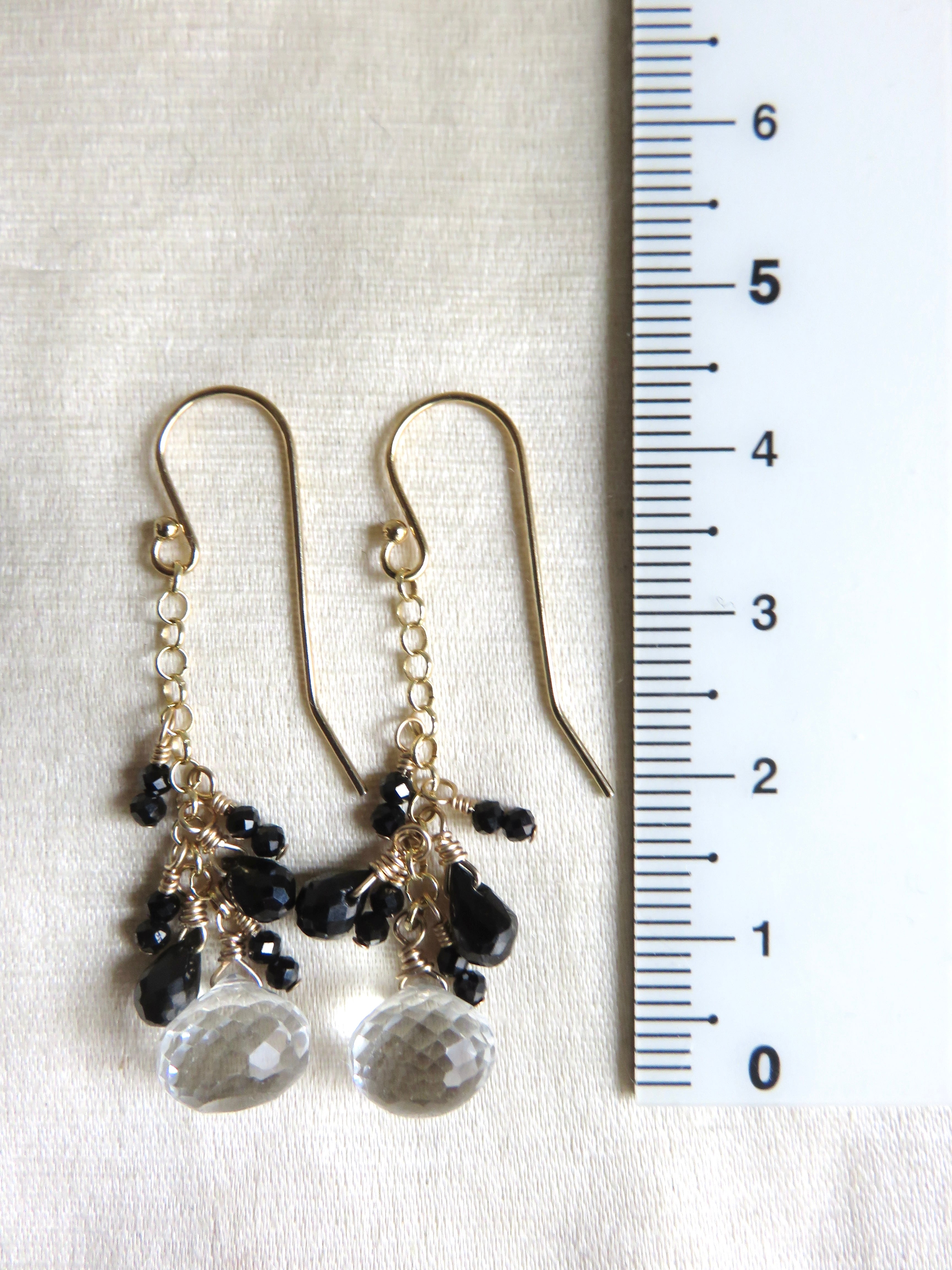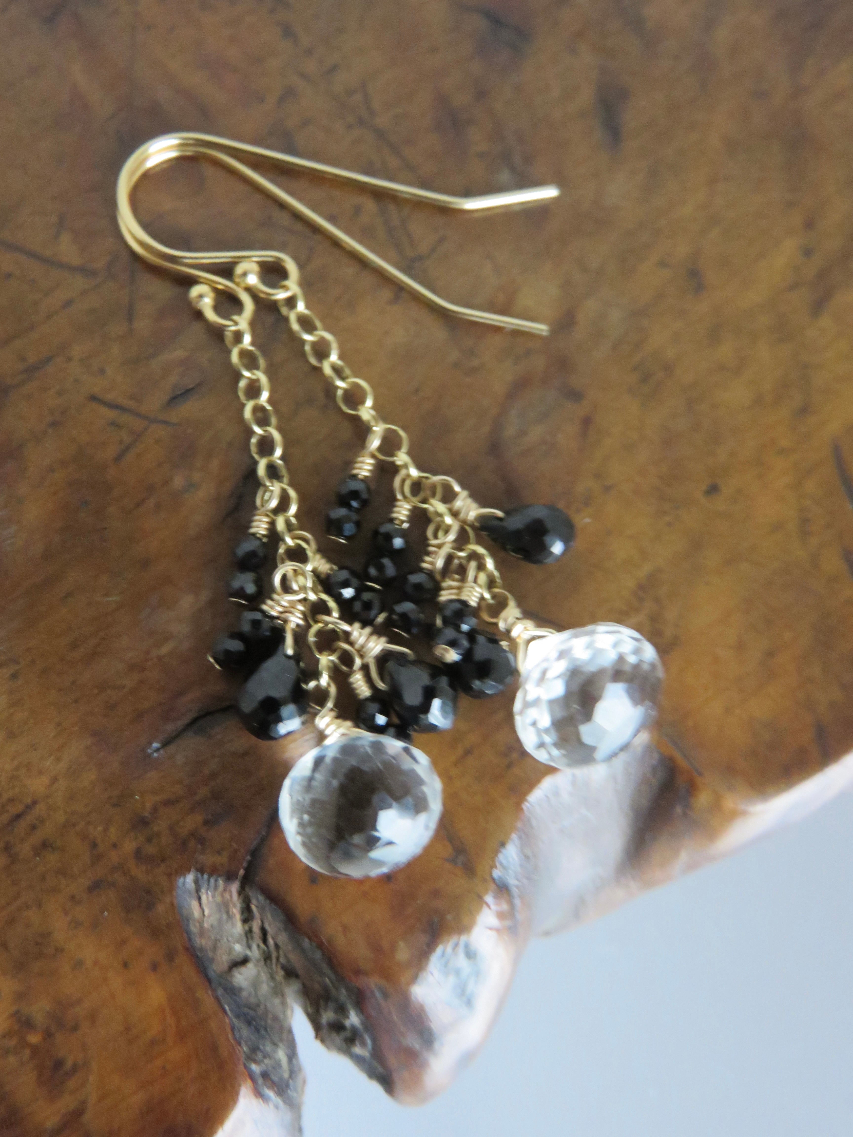 玉ねぎみたいな形のホワイトトパーズは細かいカットがキラキラして揺れるたびに輝きます。同じくキラキラのブラックスピネルと合わせてモノトーンでちょっと辛口のエレガントなデザインになっています。