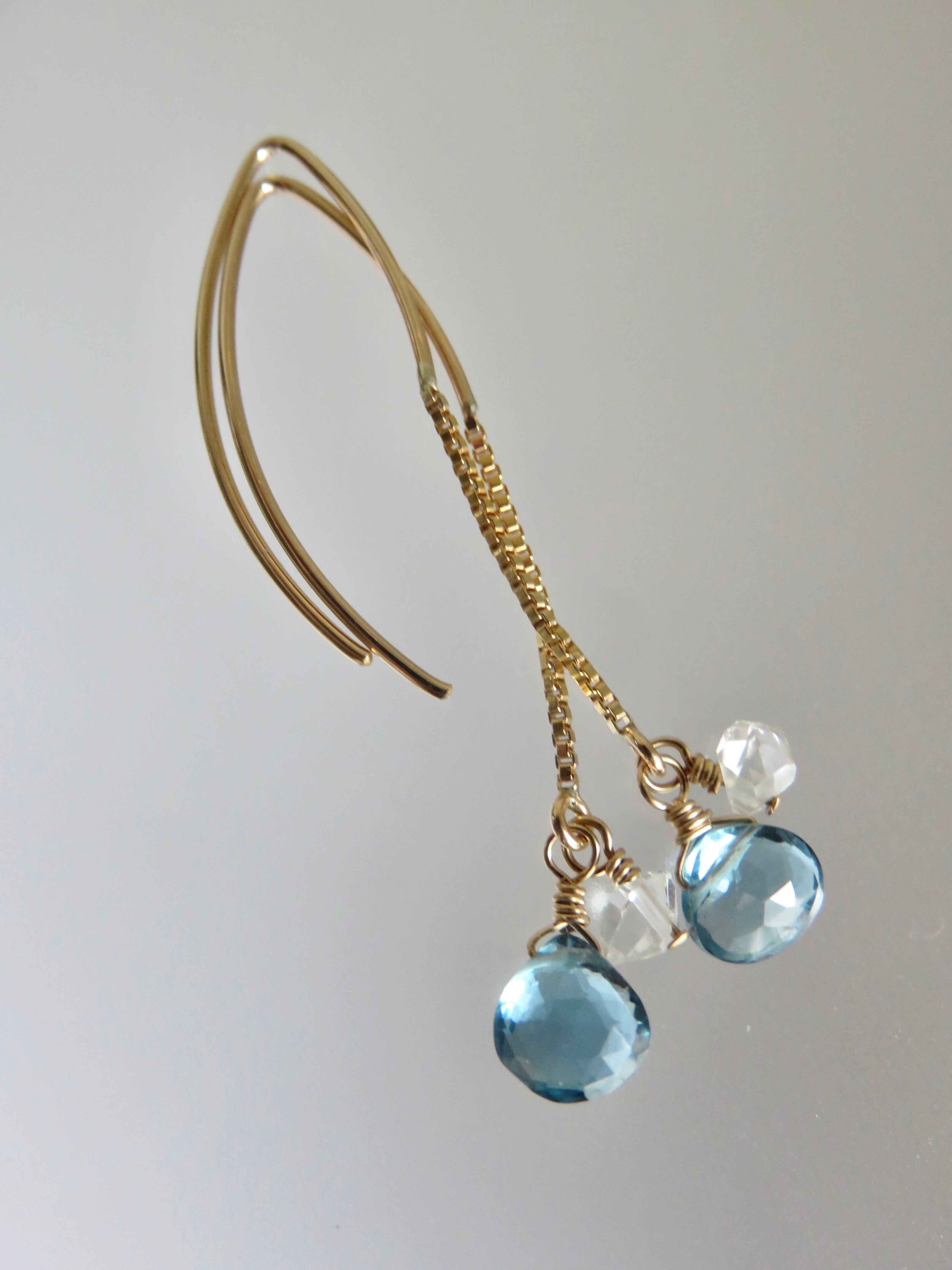 トパーズらしい澄んだ輝きと色味に、小さなハーキマーダイヤ(ハーキマー地区産の輝きの強い水晶)のピュアな輝きを添えて、縦長のロングフックでスタイリッシュな印象のキラキラ揺れるピアスに仕立てました。