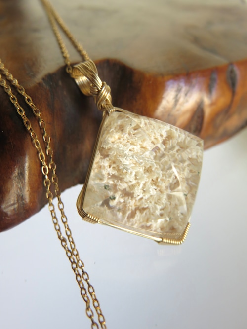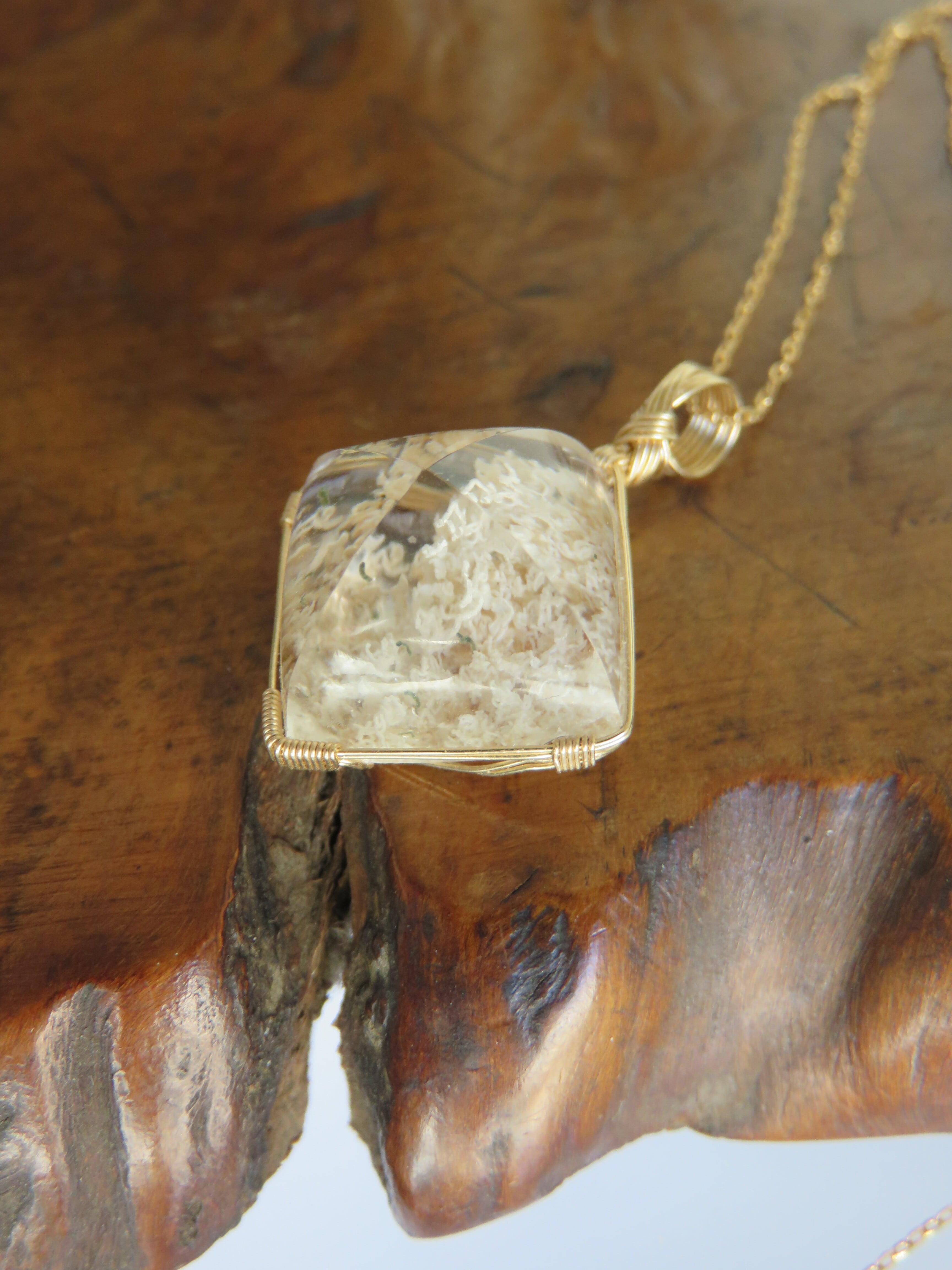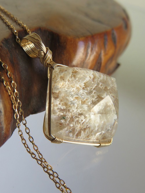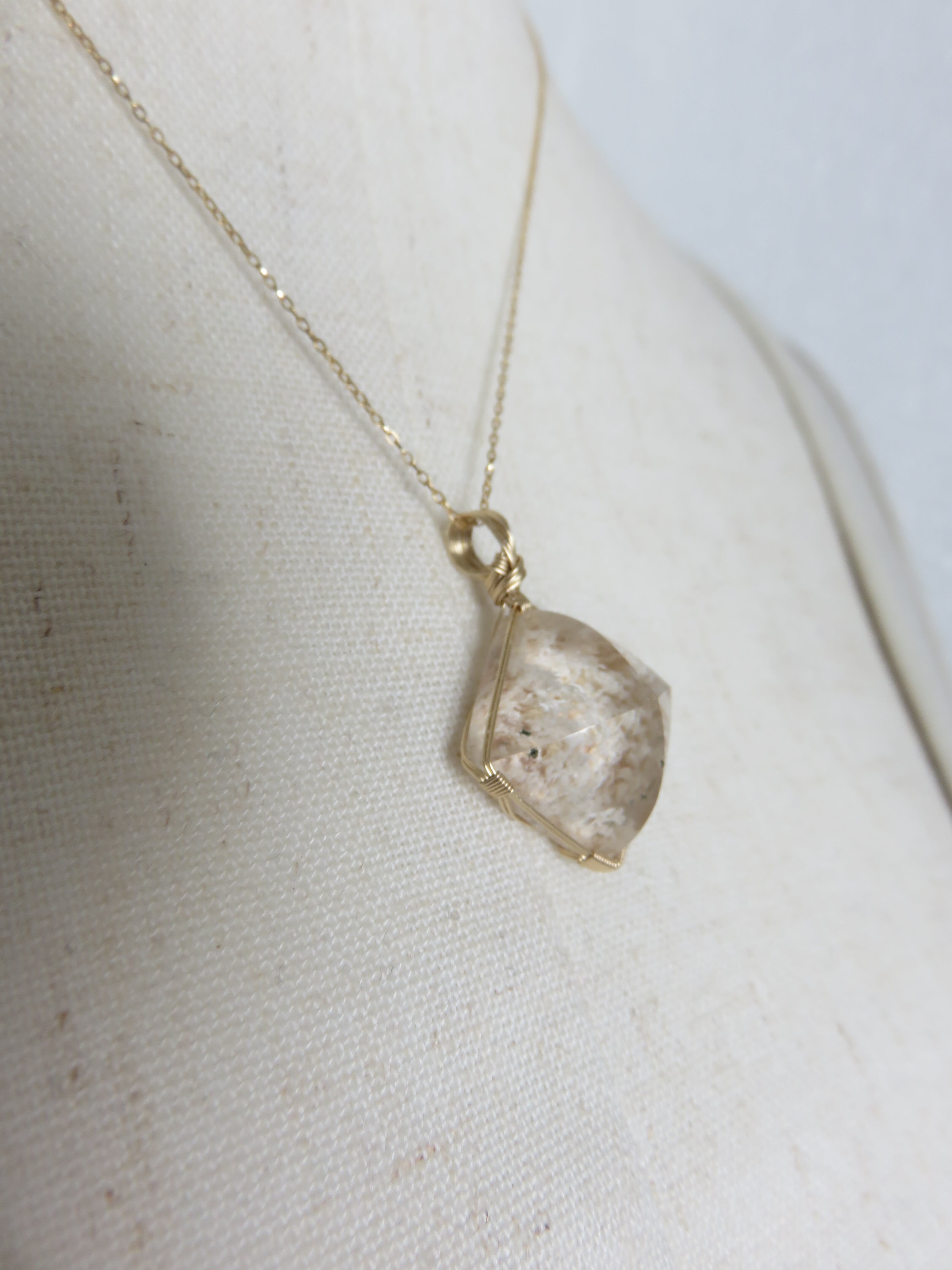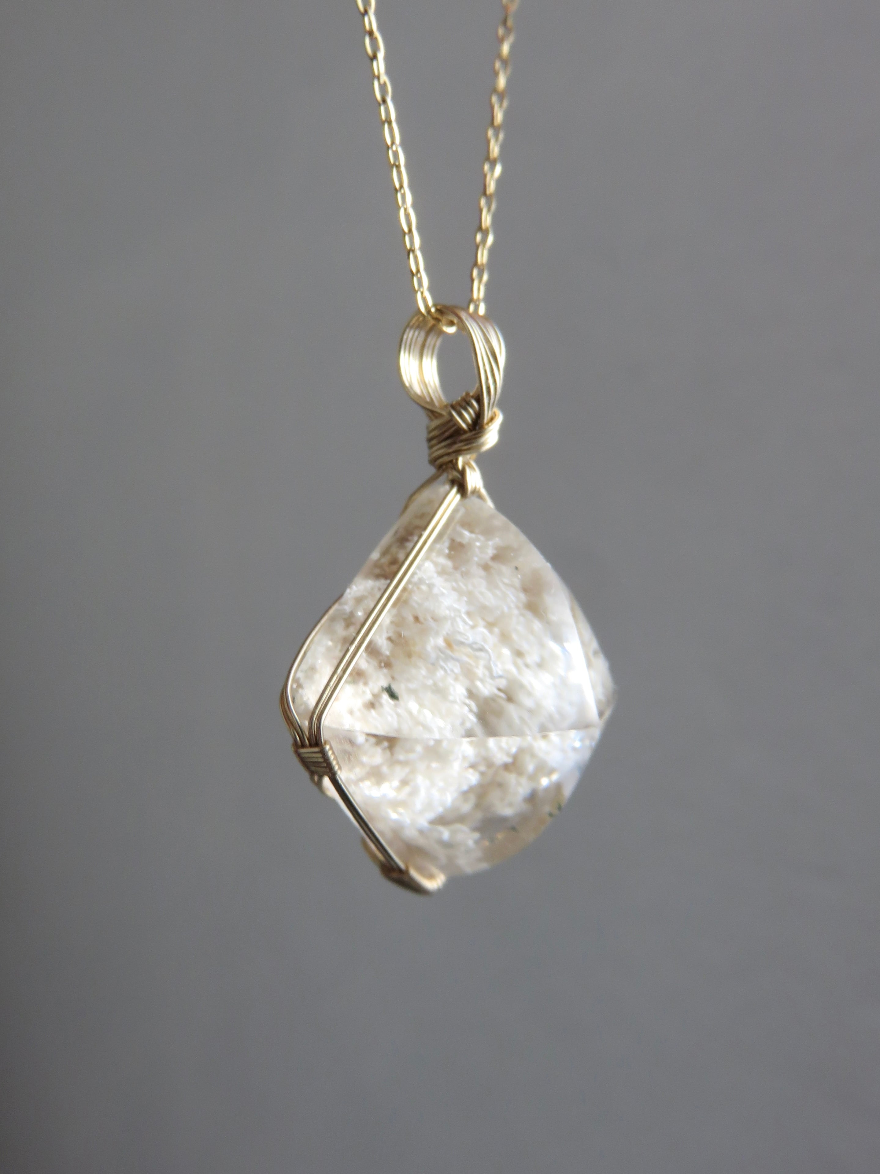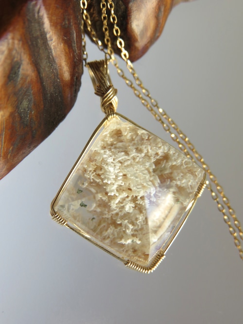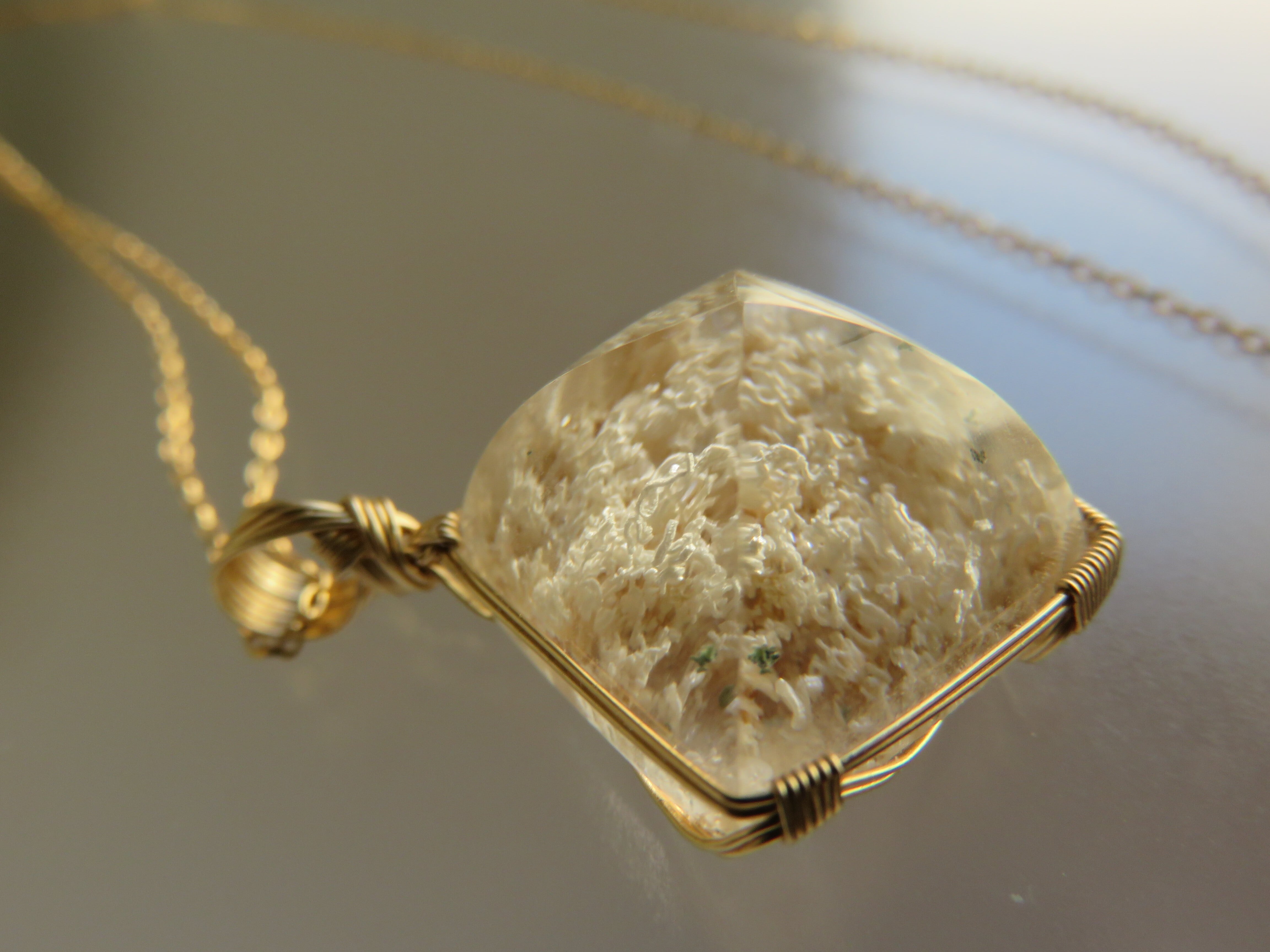 アンティークコットンのレースのような、ふわふわの白いインクルージョンが入ったブラジル産ガーデンクォーツを女神巻きペンダントトップに仕立てました。