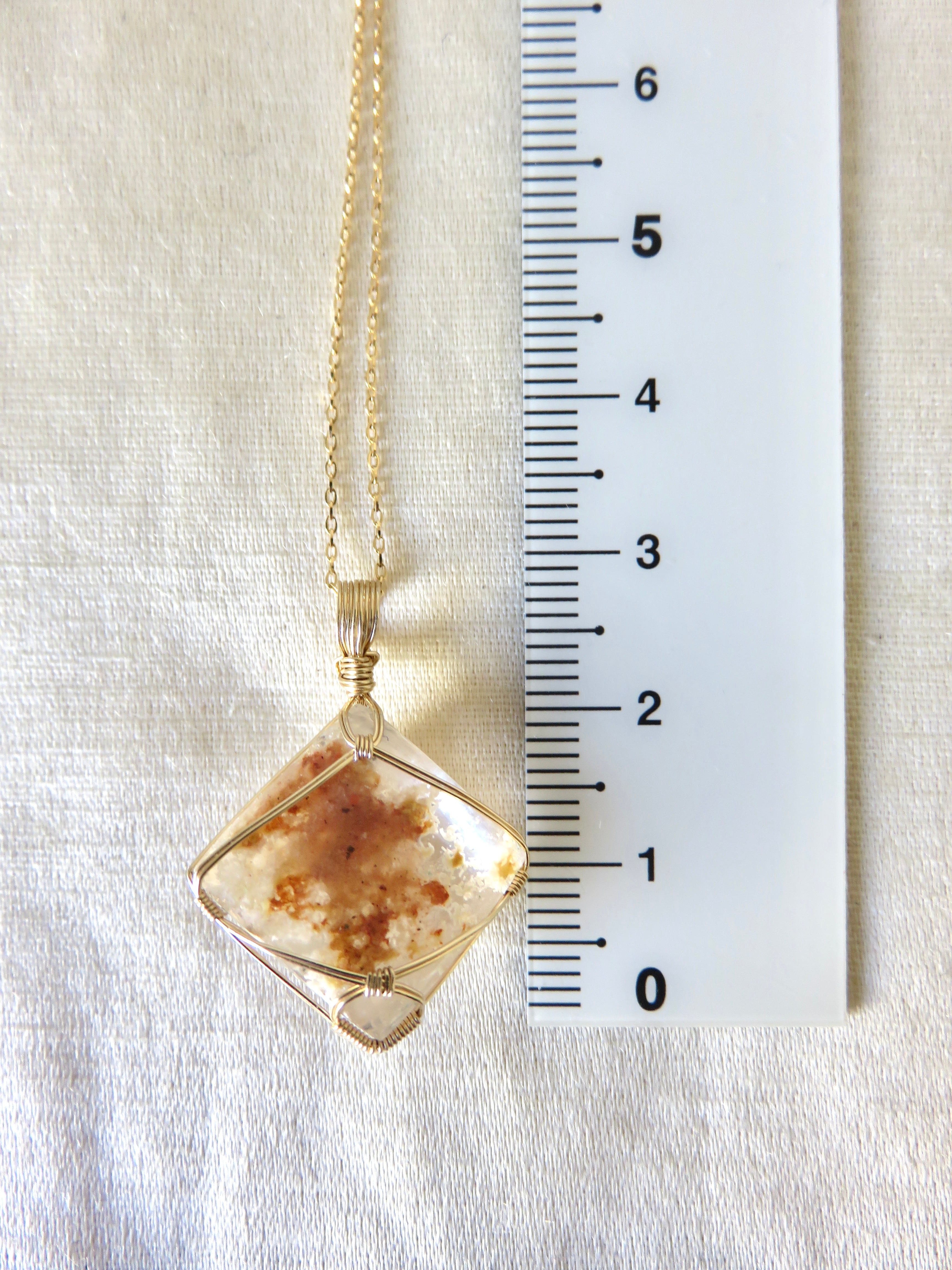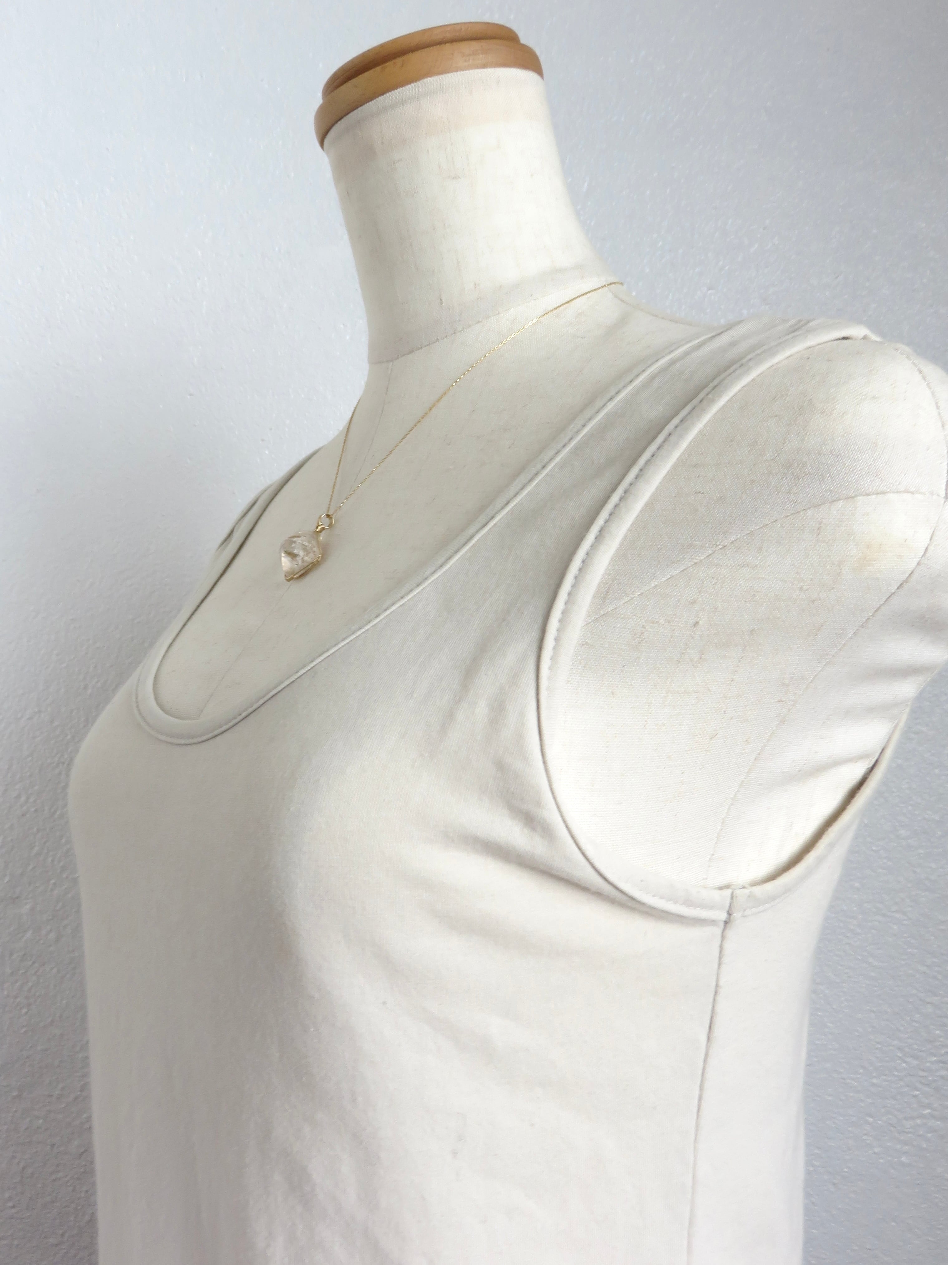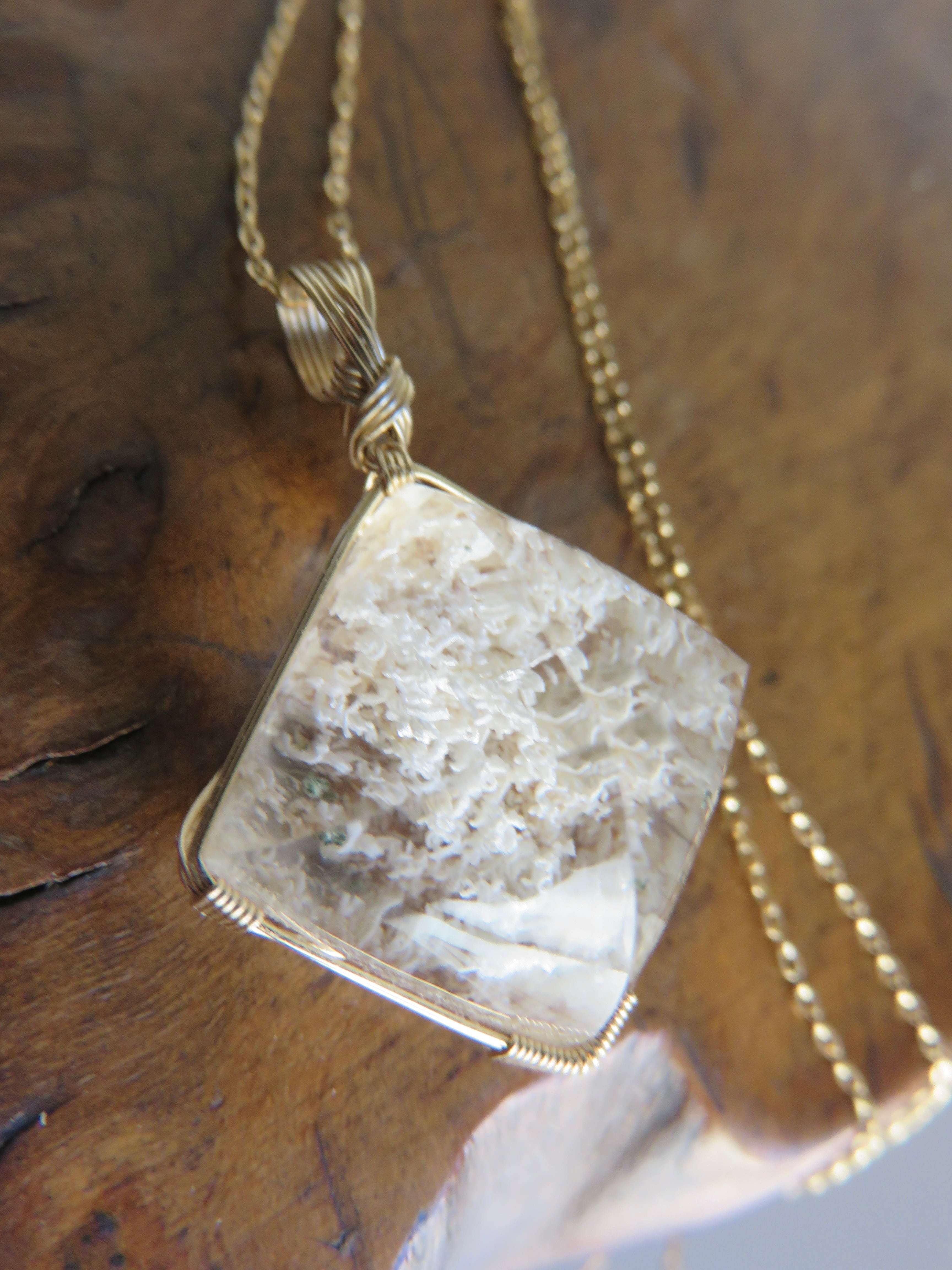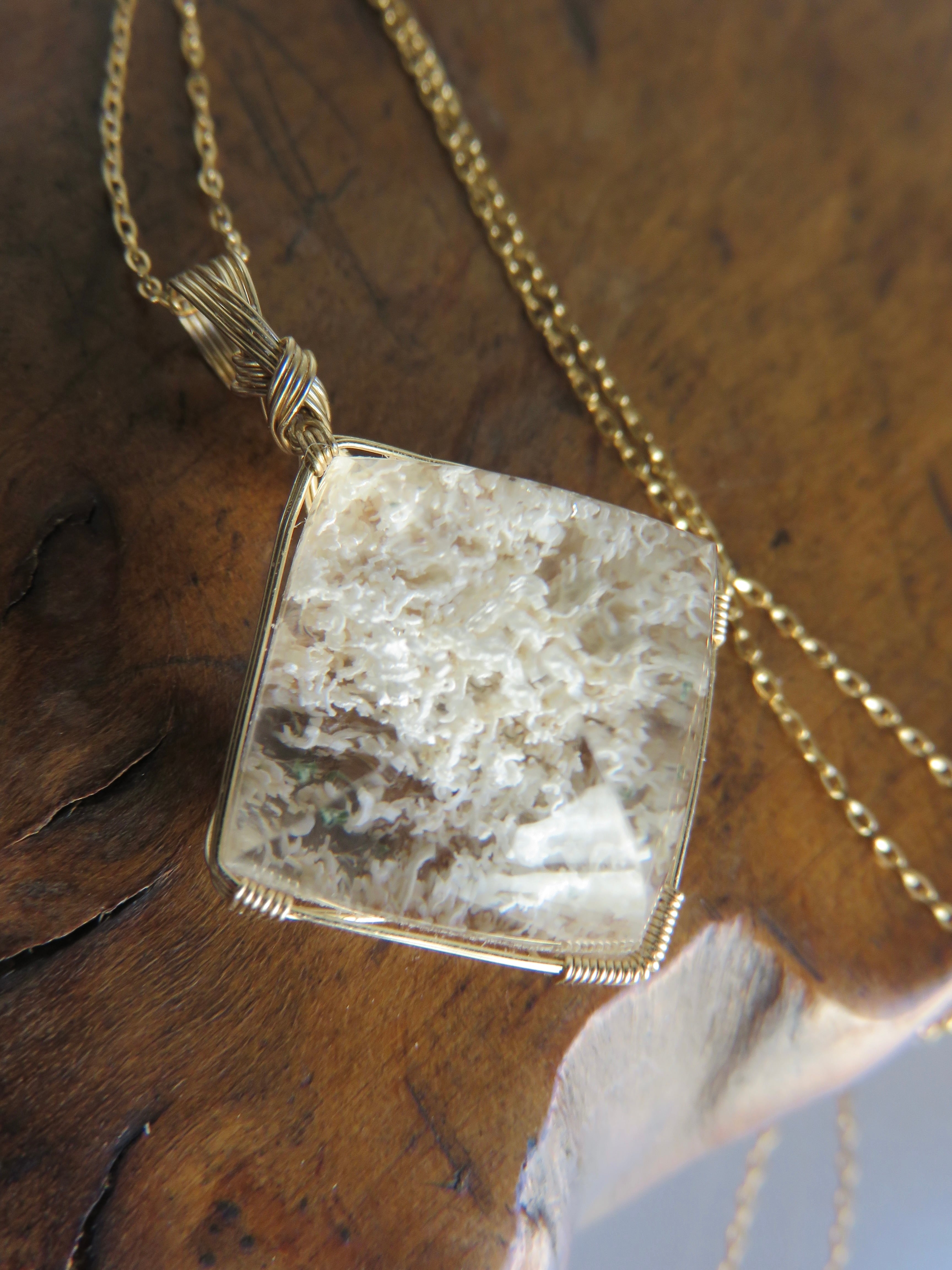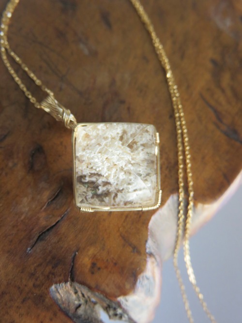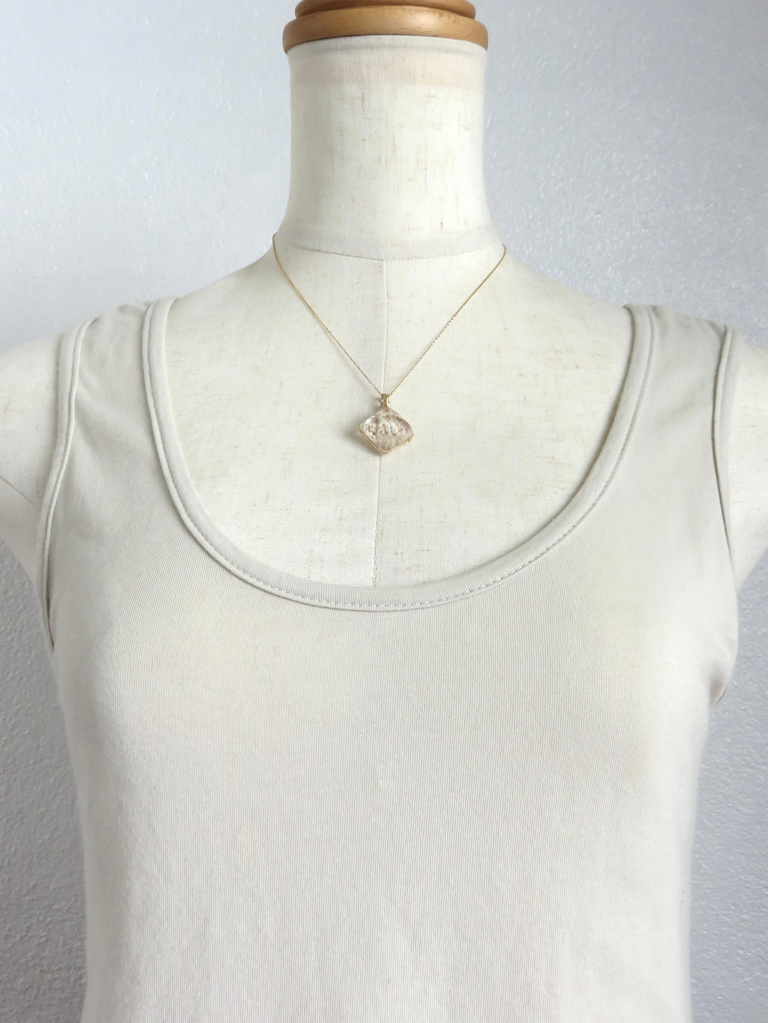 アンティークコットンのレースのような、ふわふわの白いインクルージョンが入ったブラジル産ガーデンクォーツを女神巻きペンダントトップに仕立てました。