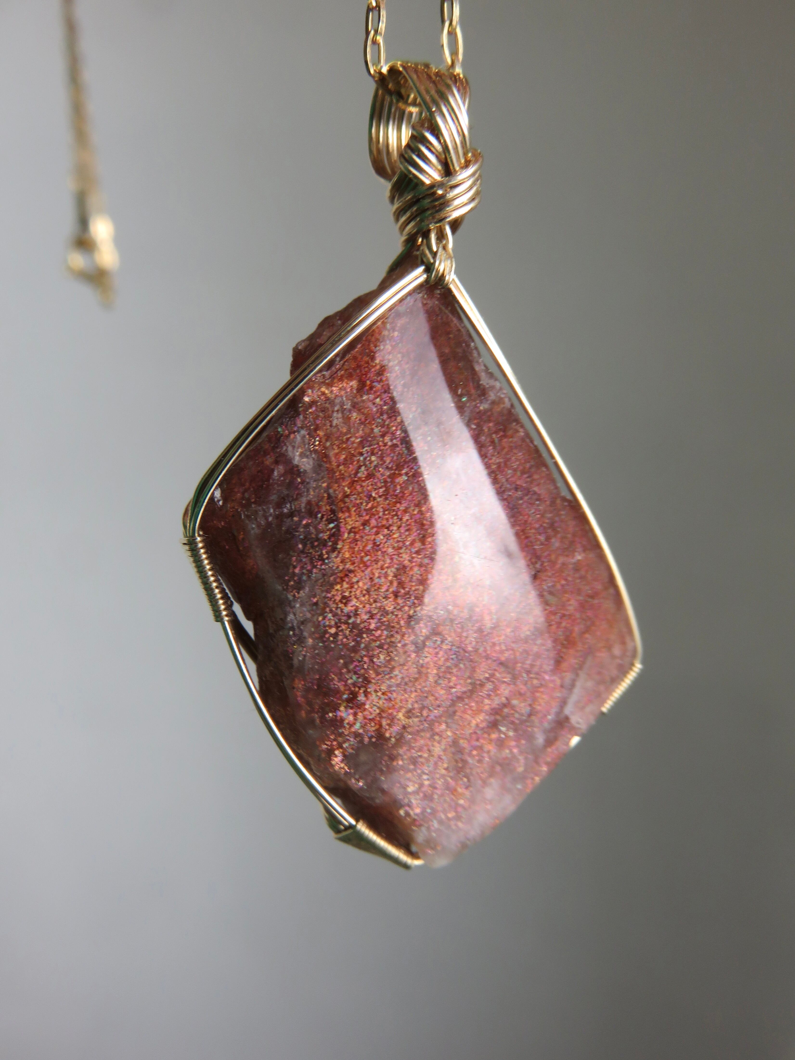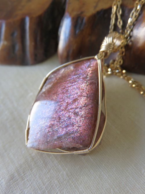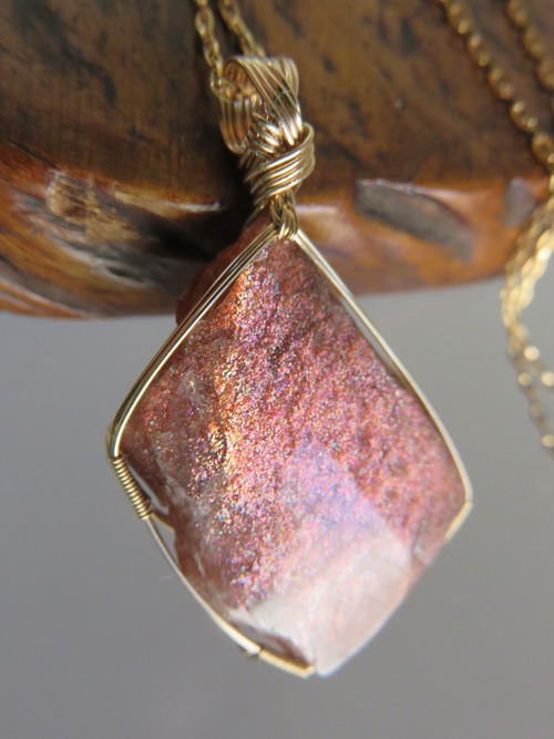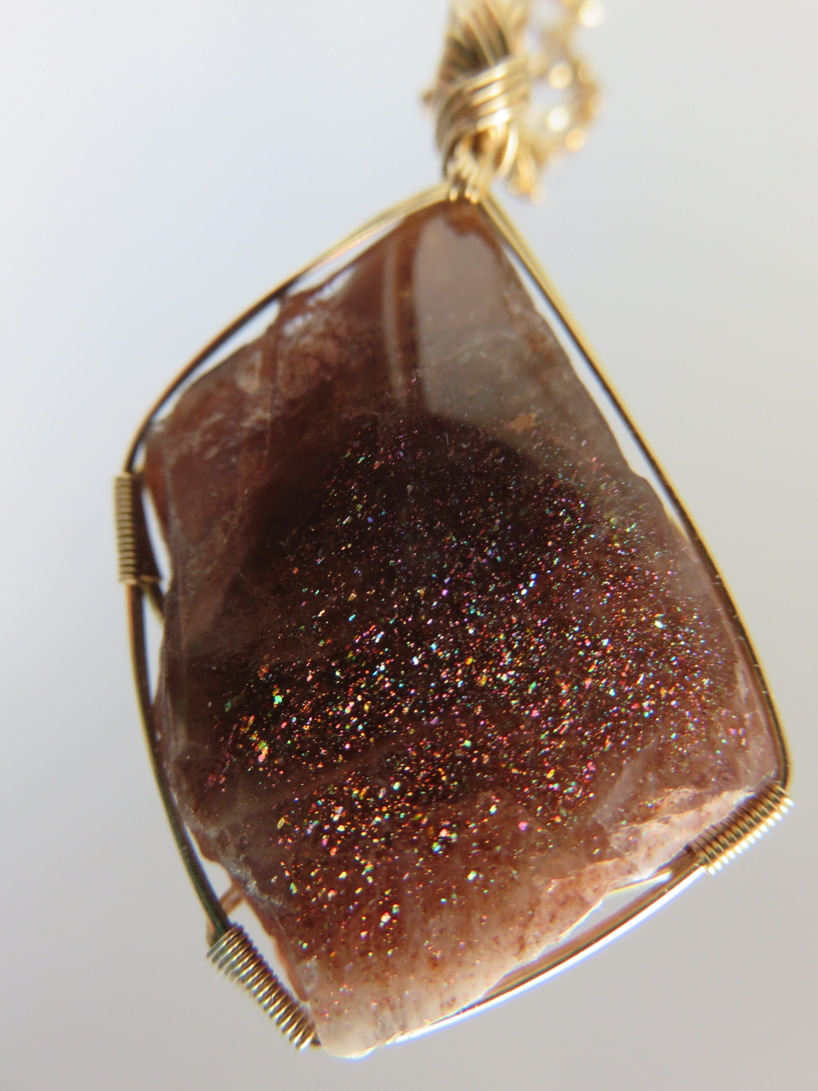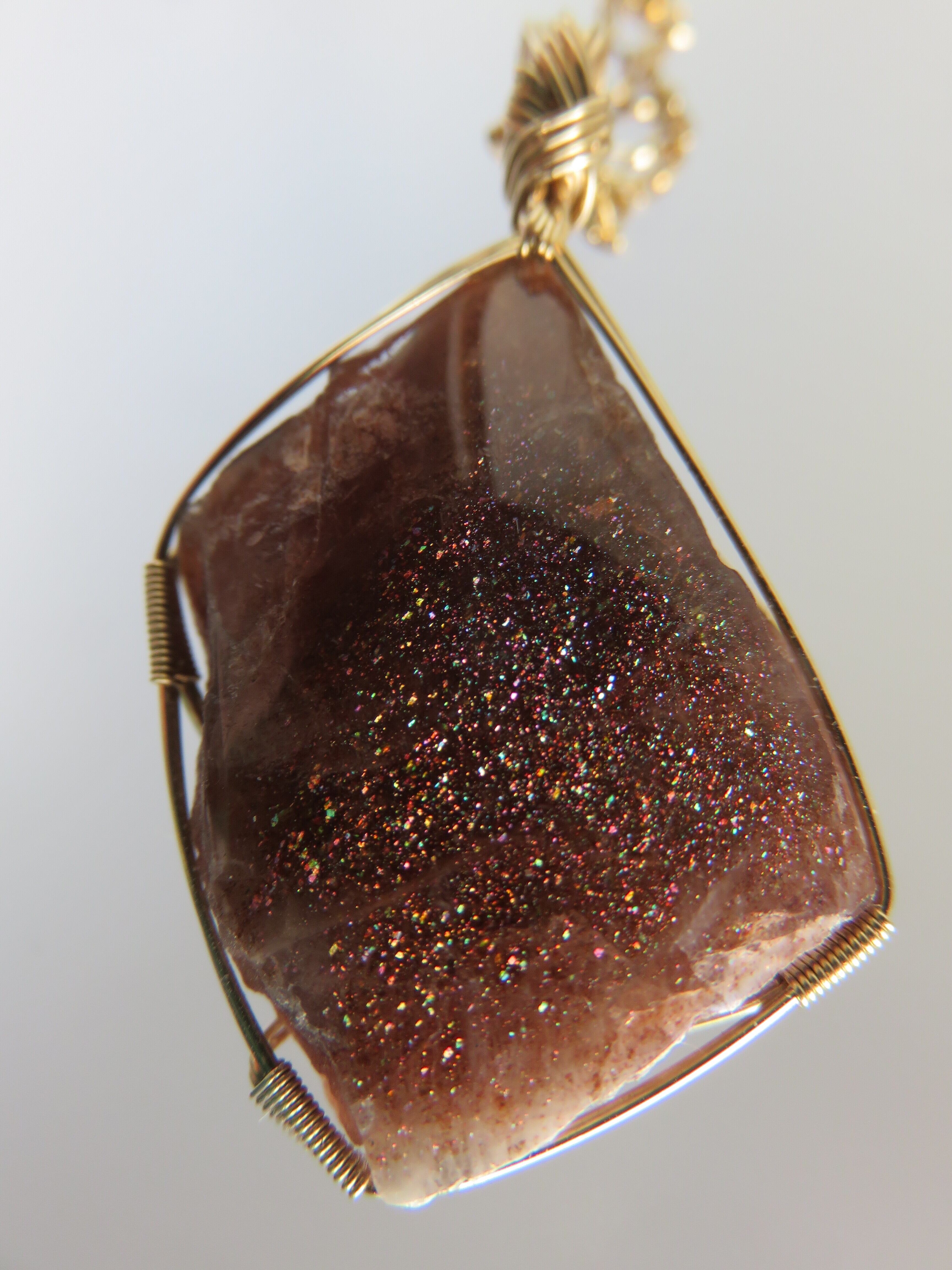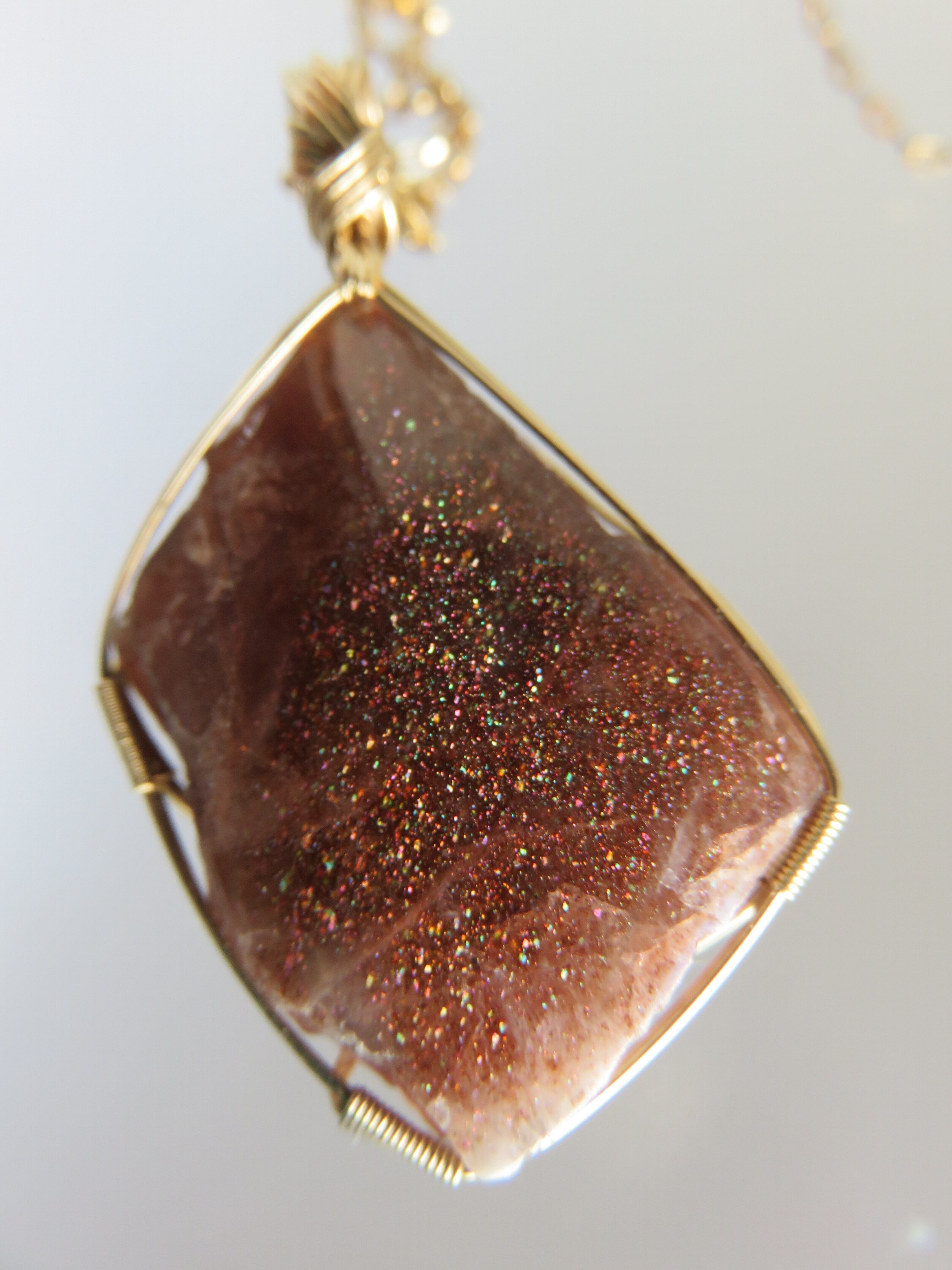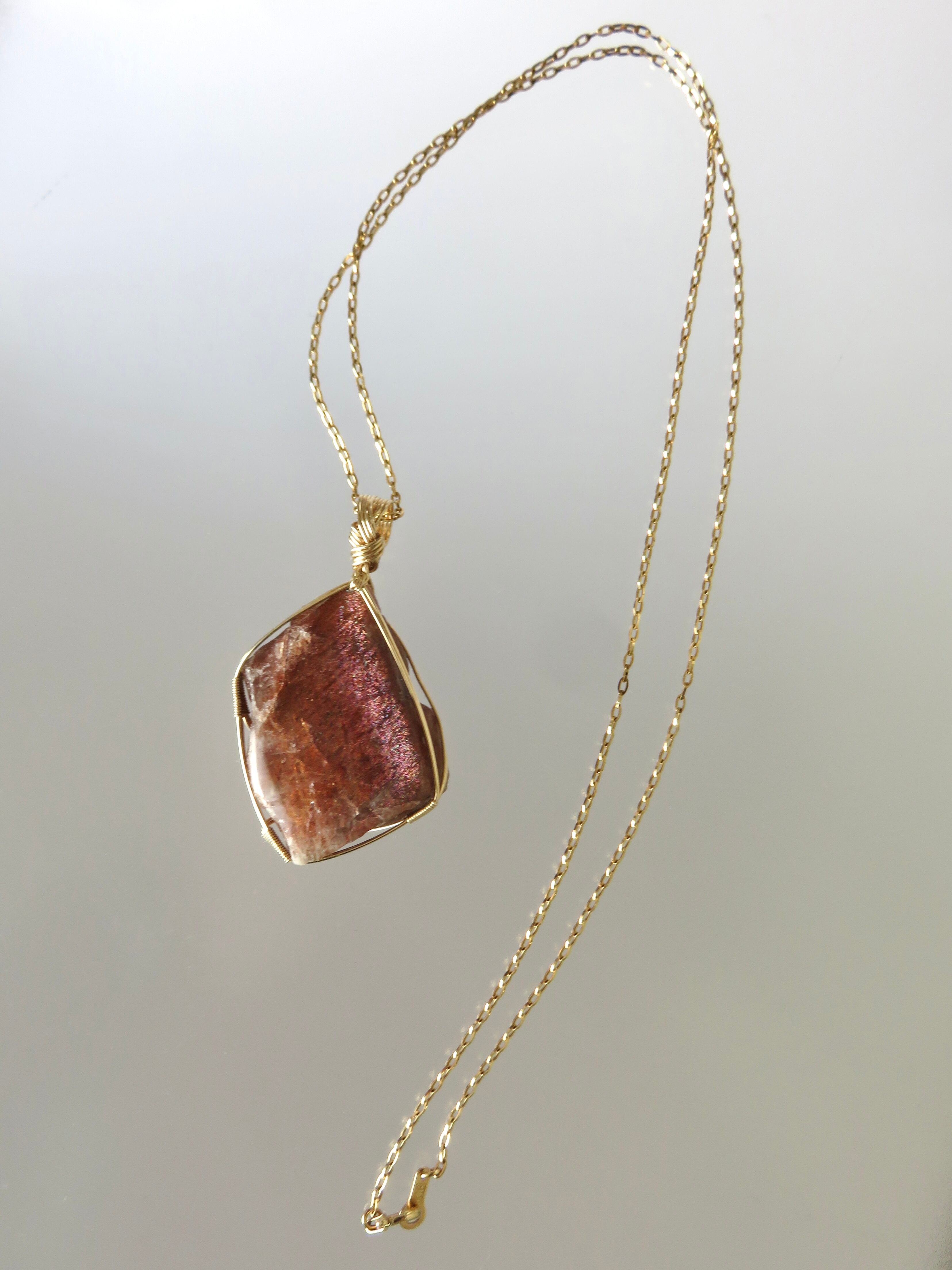 火のエネルギーが大変強いと言われる“丙午”の2026年の最初に、どっしりとした太陽のような、大粒で迫力のあるタンザニア産のサンストーンを女神巻きペンダントトップに仕立てました。キラキラのラメのようなインクルージョンがびっしりと入り、角度によって虹色に見えたり、銅色の強い金属光沢に輝く美しいピースです。