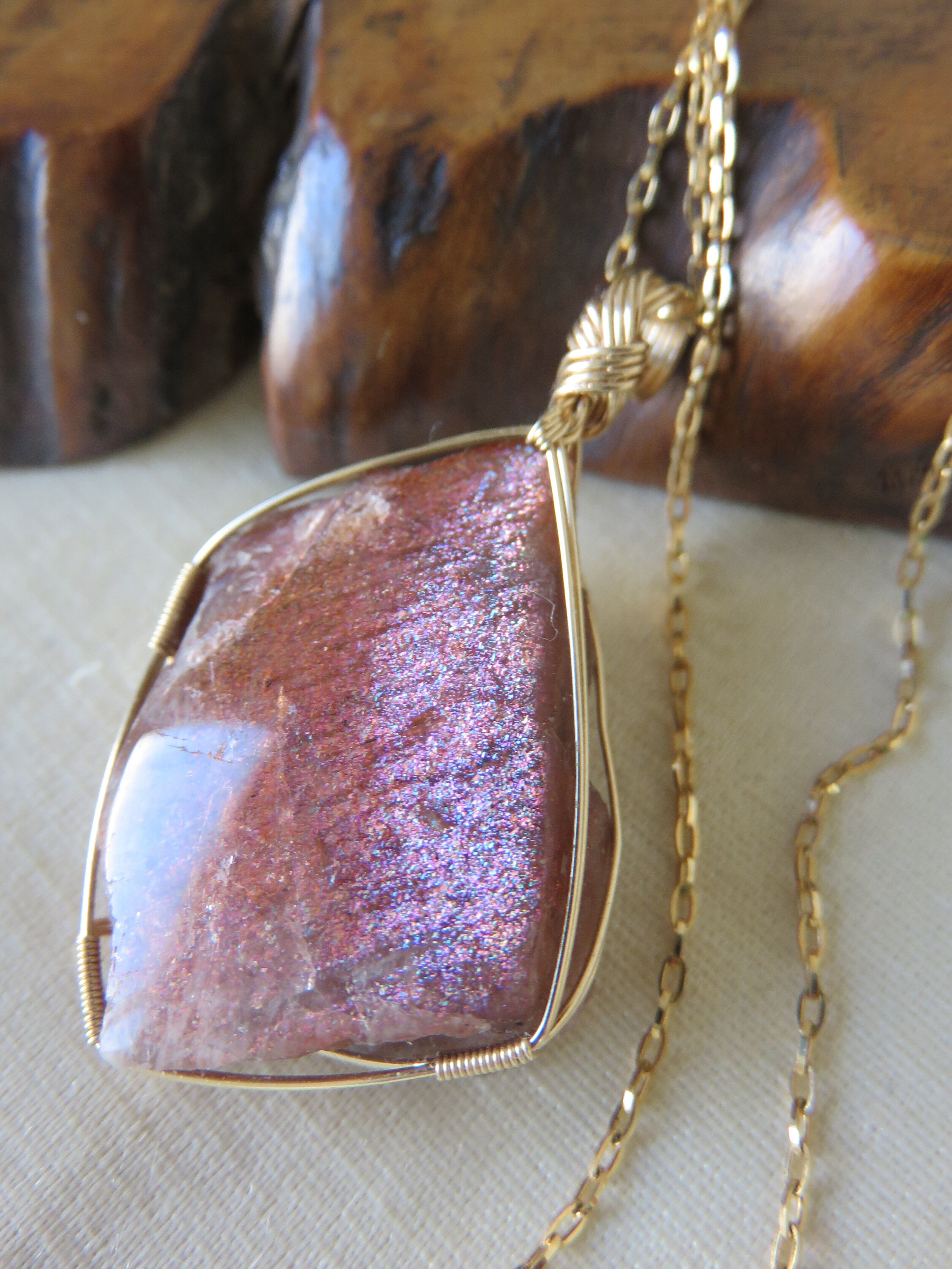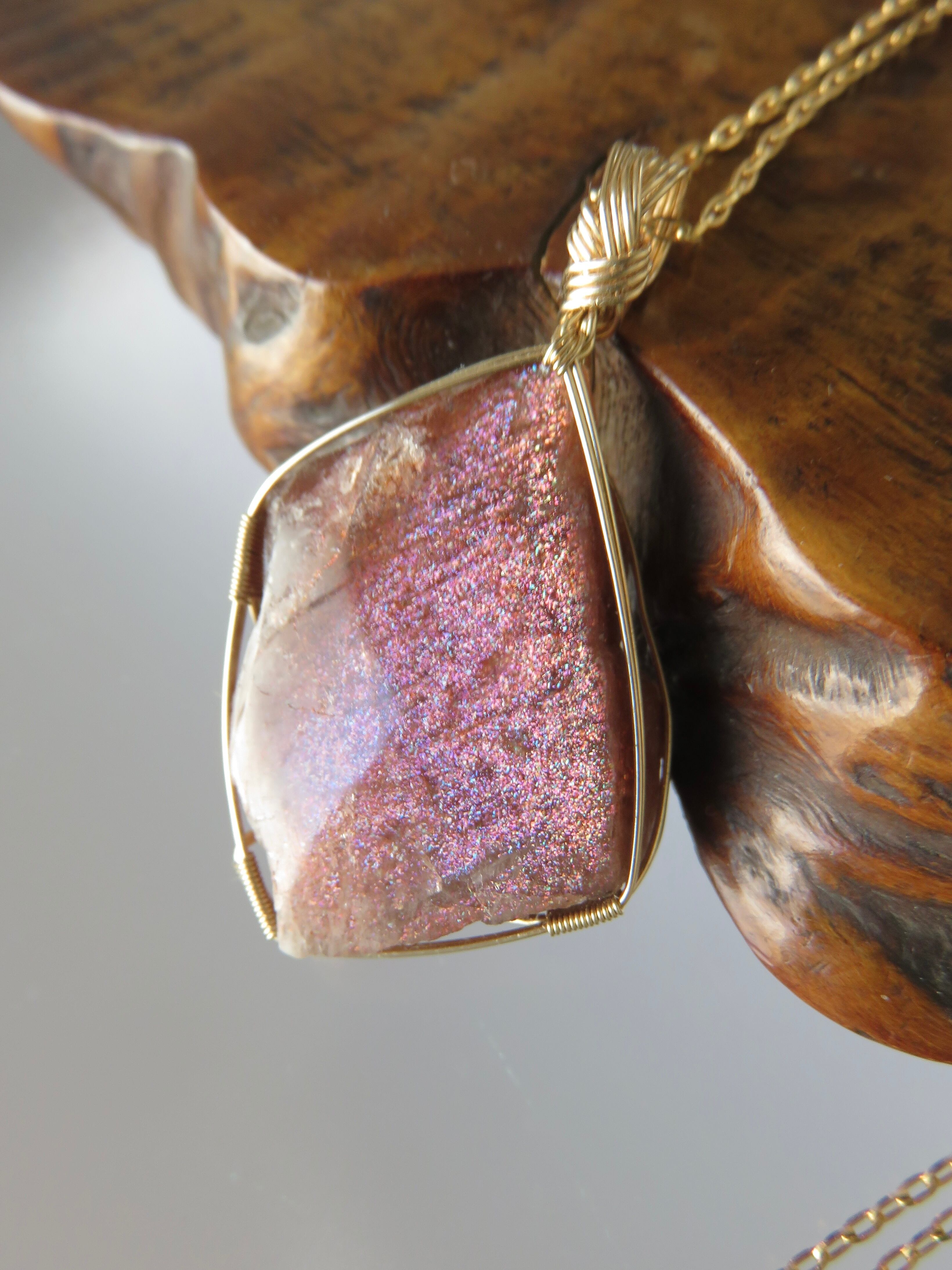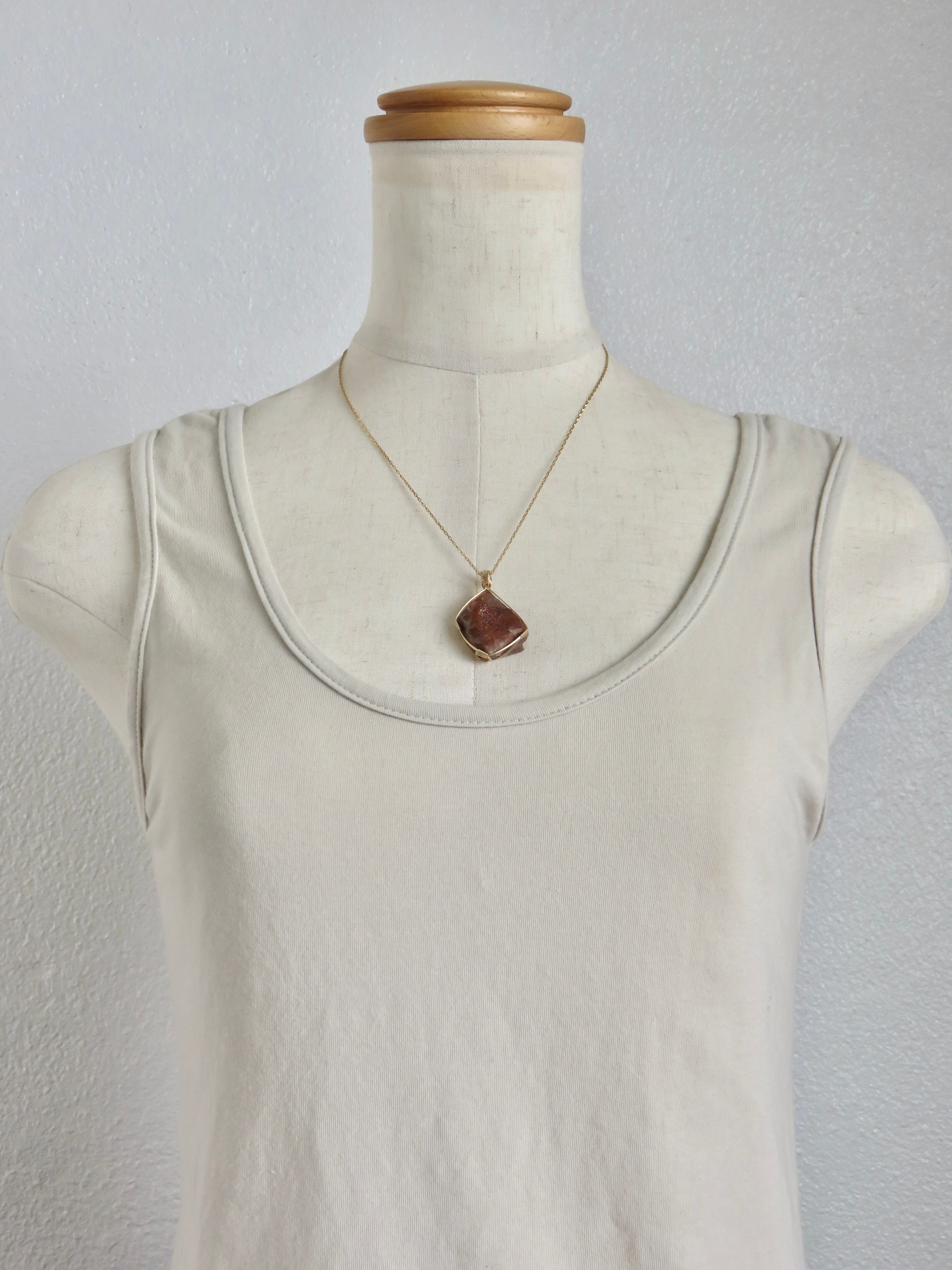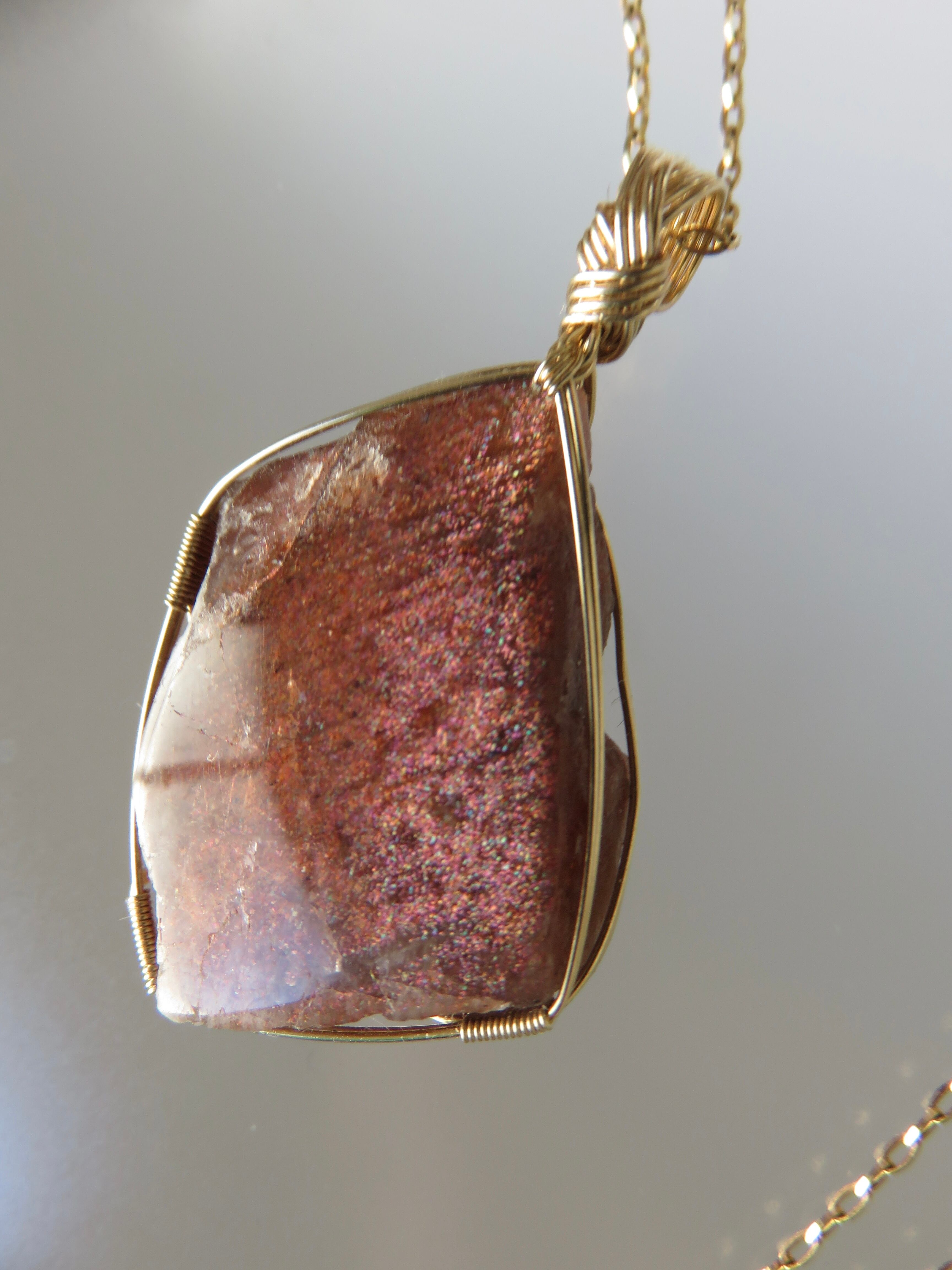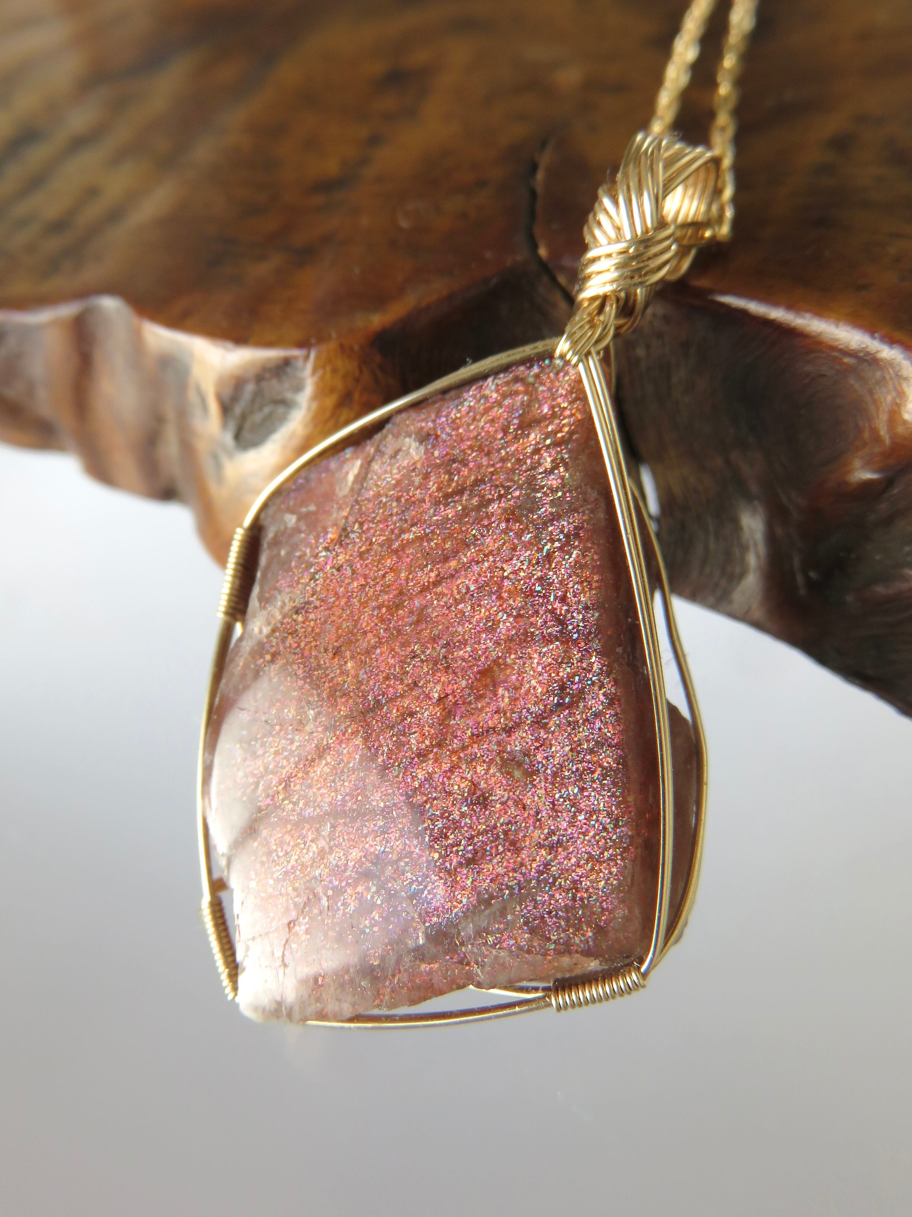 火のエネルギーが大変強いと言われる“丙午”の2026年の最初に、どっしりとした太陽のような、大粒で迫力のあるタンザニア産のサンストーンを女神巻きペンダントトップに仕立てました。キラキラのラメのようなインクルージョンがびっしりと入り、角度によって虹色に見えたり、銅色の強い金属光沢に輝く美しいピースです。