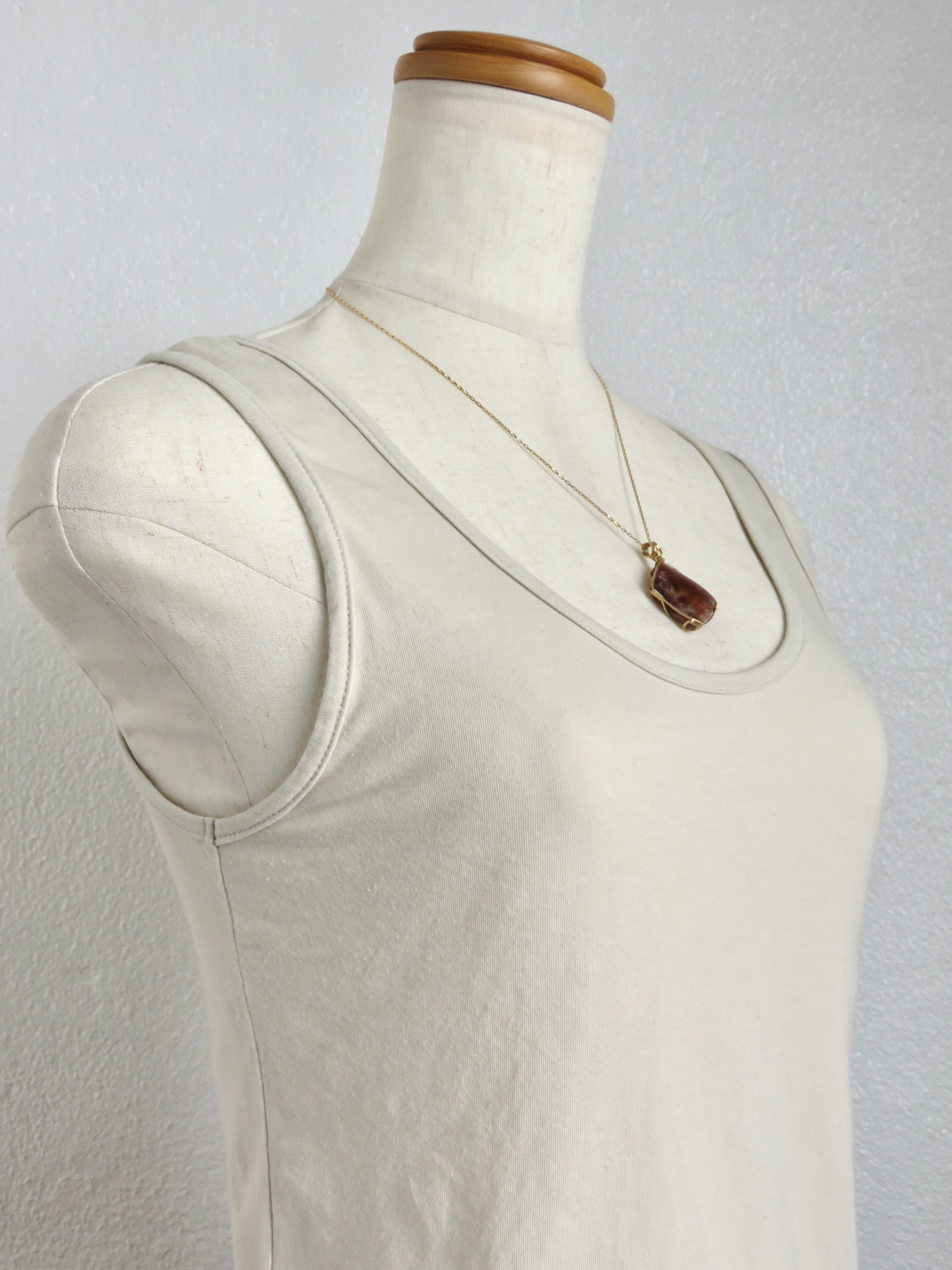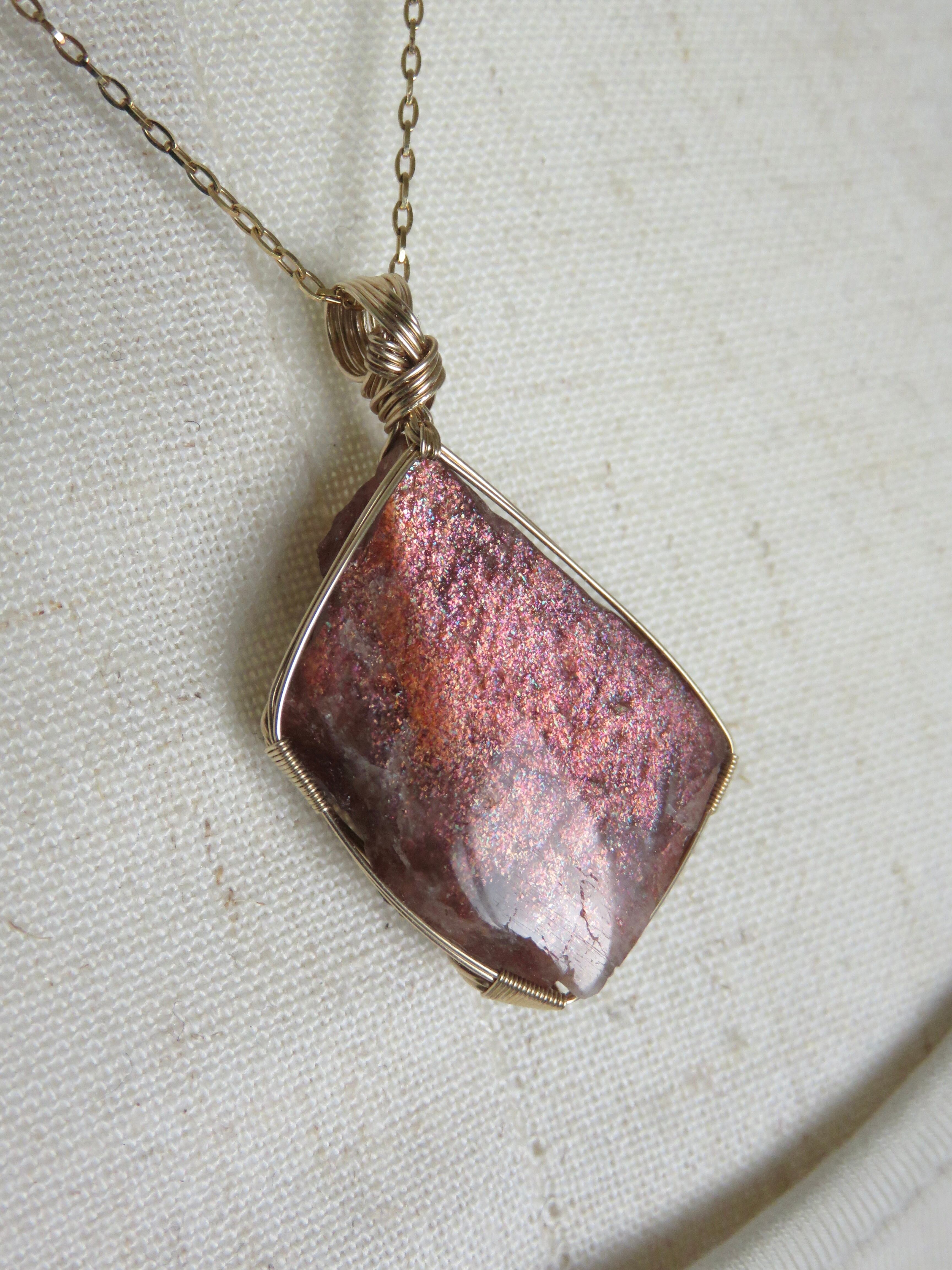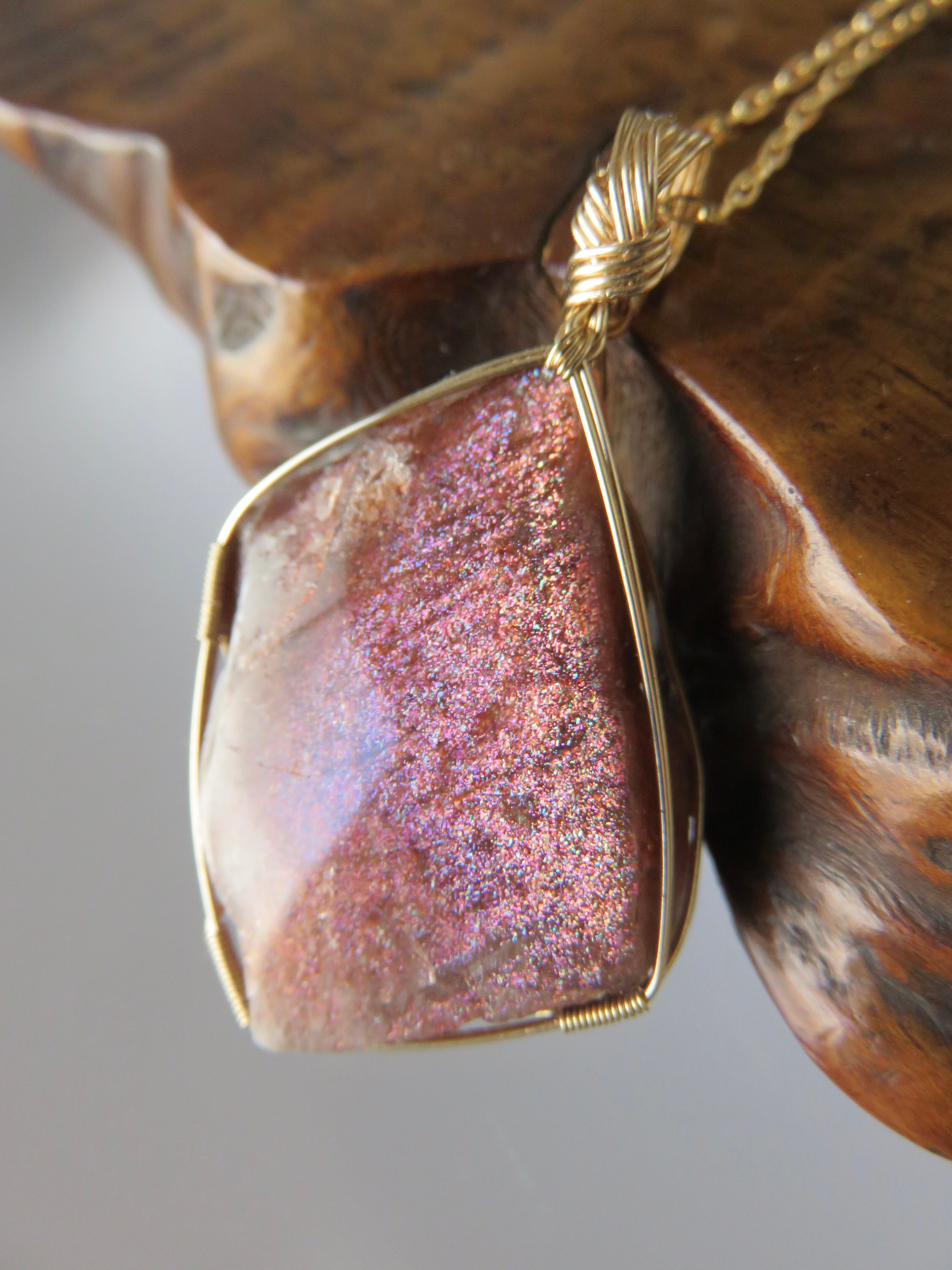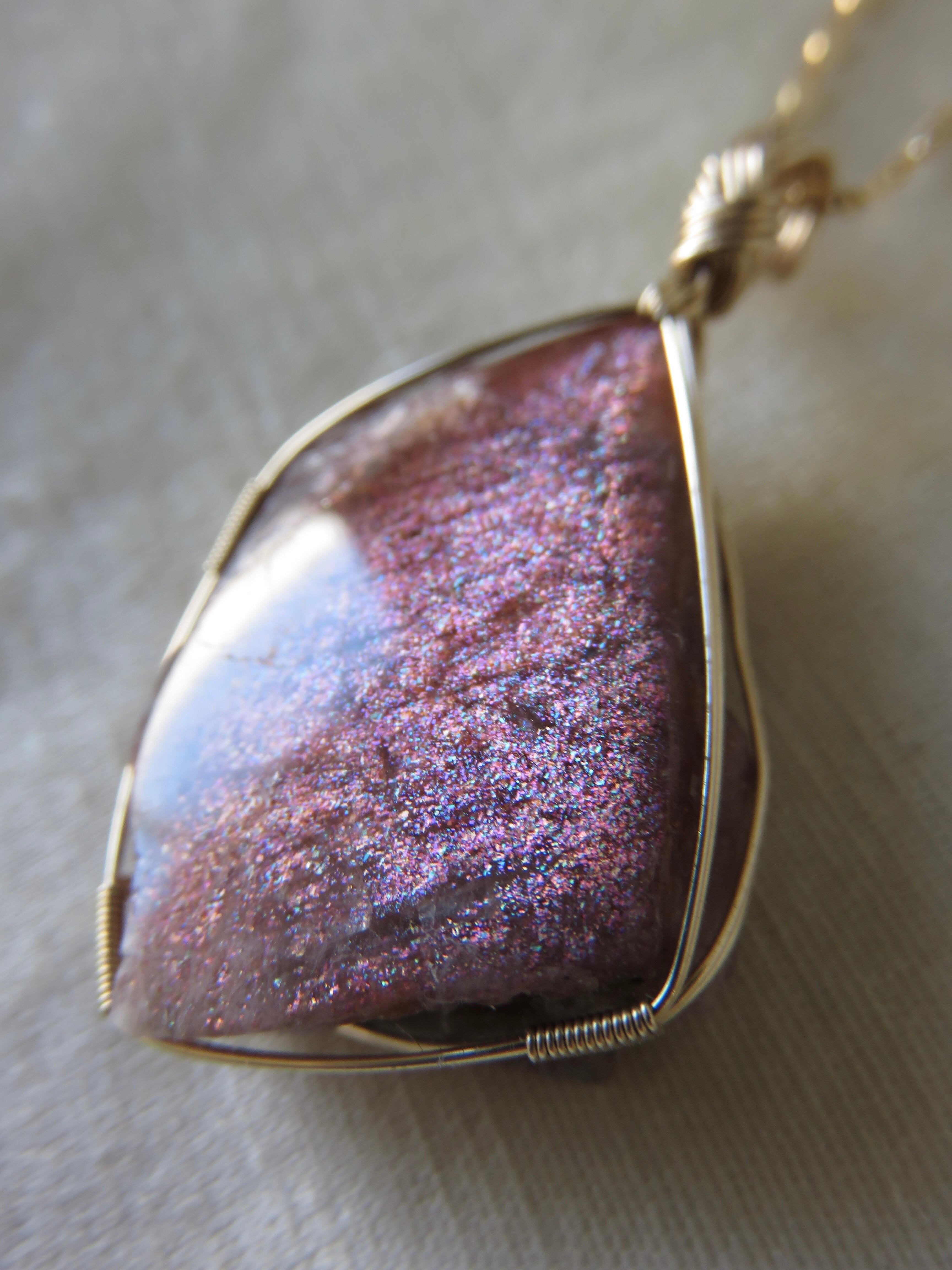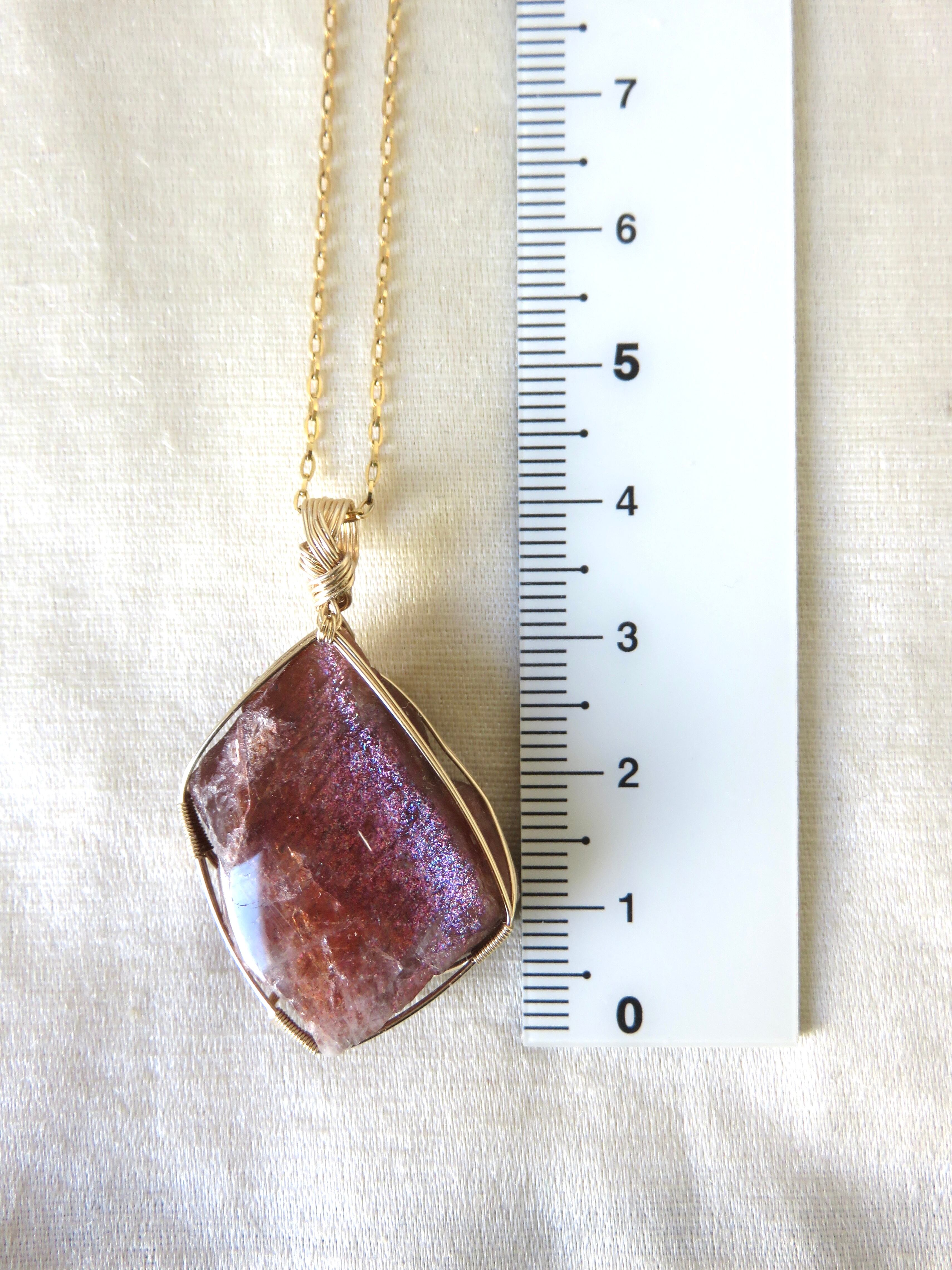 火のエネルギーが大変強いと言われる“丙午”の2026年の最初に、どっしりとした太陽のような、大粒で迫力のあるタンザニア産のサンストーンを女神巻きペンダントトップに仕立てました。キラキラのラメのようなインクルージョンがびっしりと入り、角度によって虹色に見えたり、銅色の強い金属光沢に輝く美しいピースです。