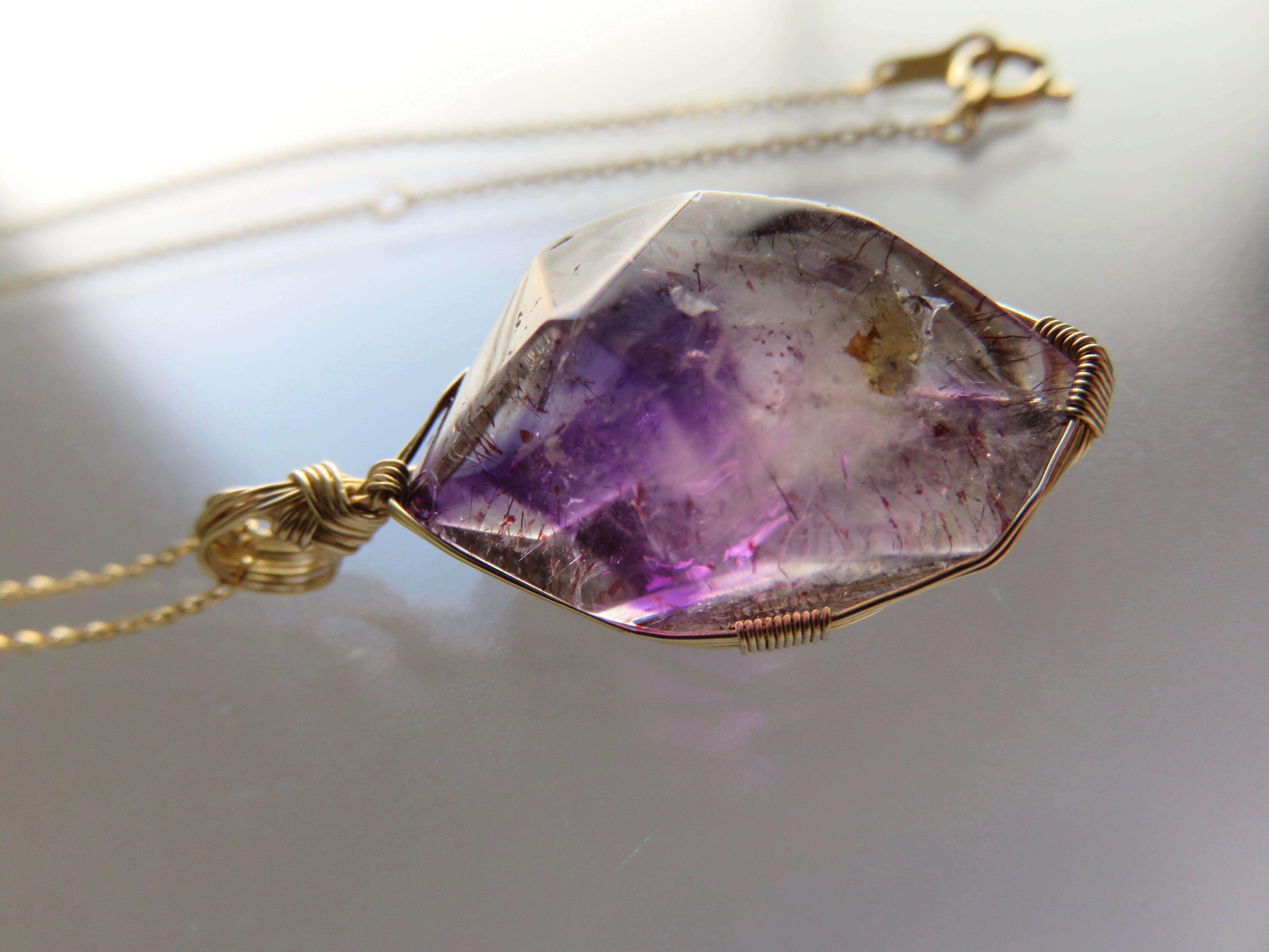 クリアな水晶の中に、クッキリとした紫色の山型のアメジストの成長痕、そさて赤いラメのようなレピドクロサイトが入った個性的で可愛らしいエレスチャルクォーツの女神巻きペンダントトップです。