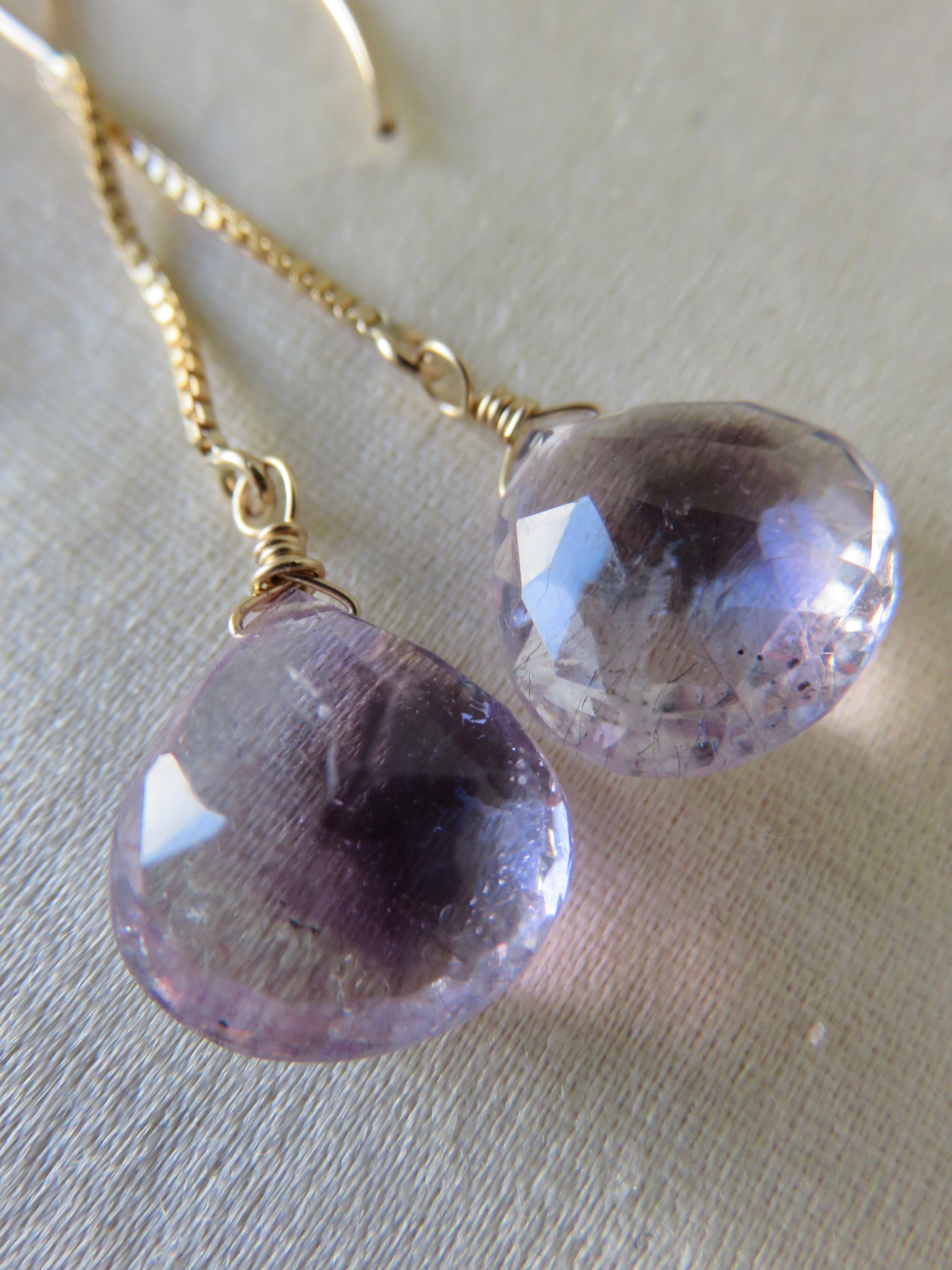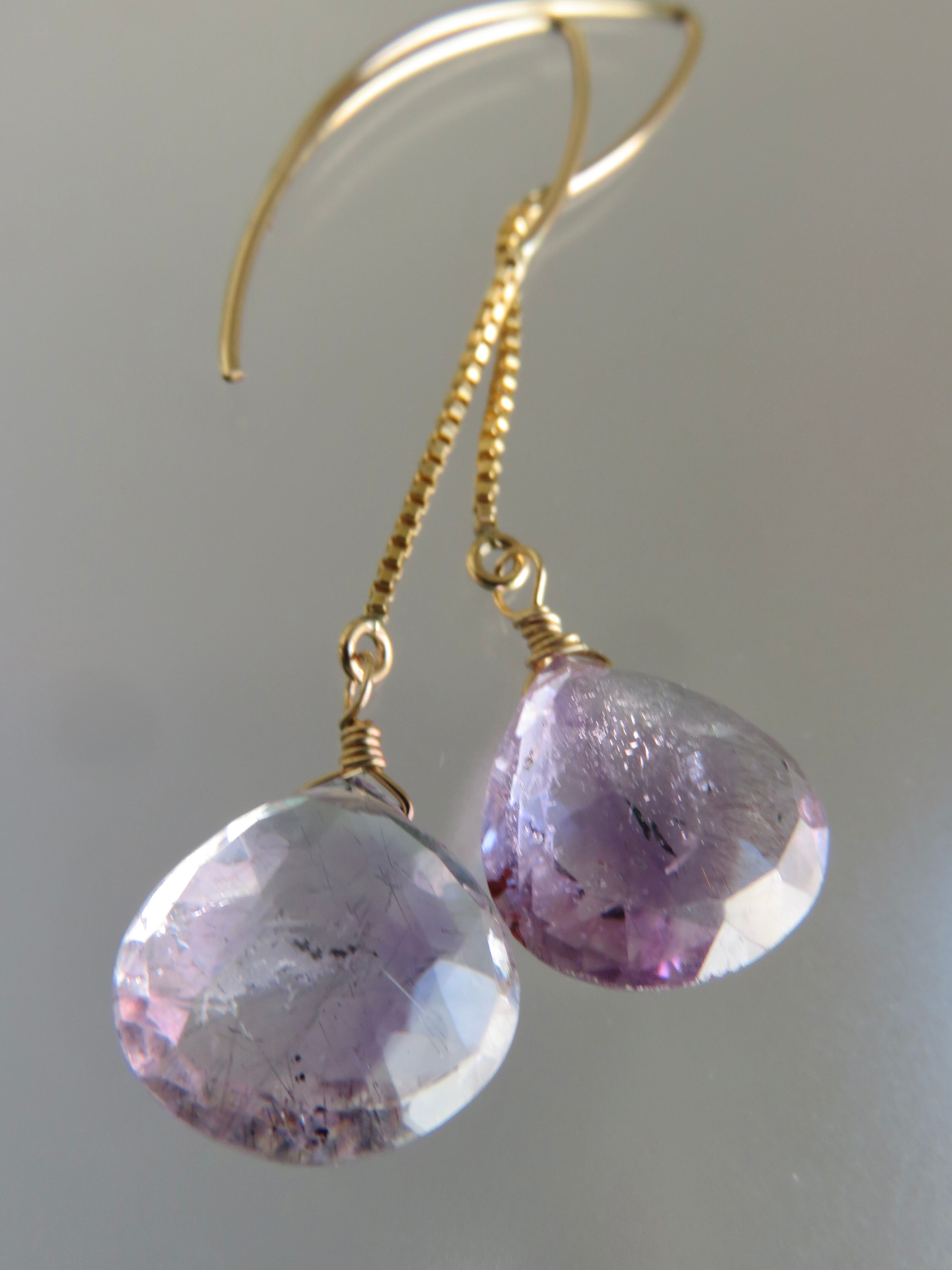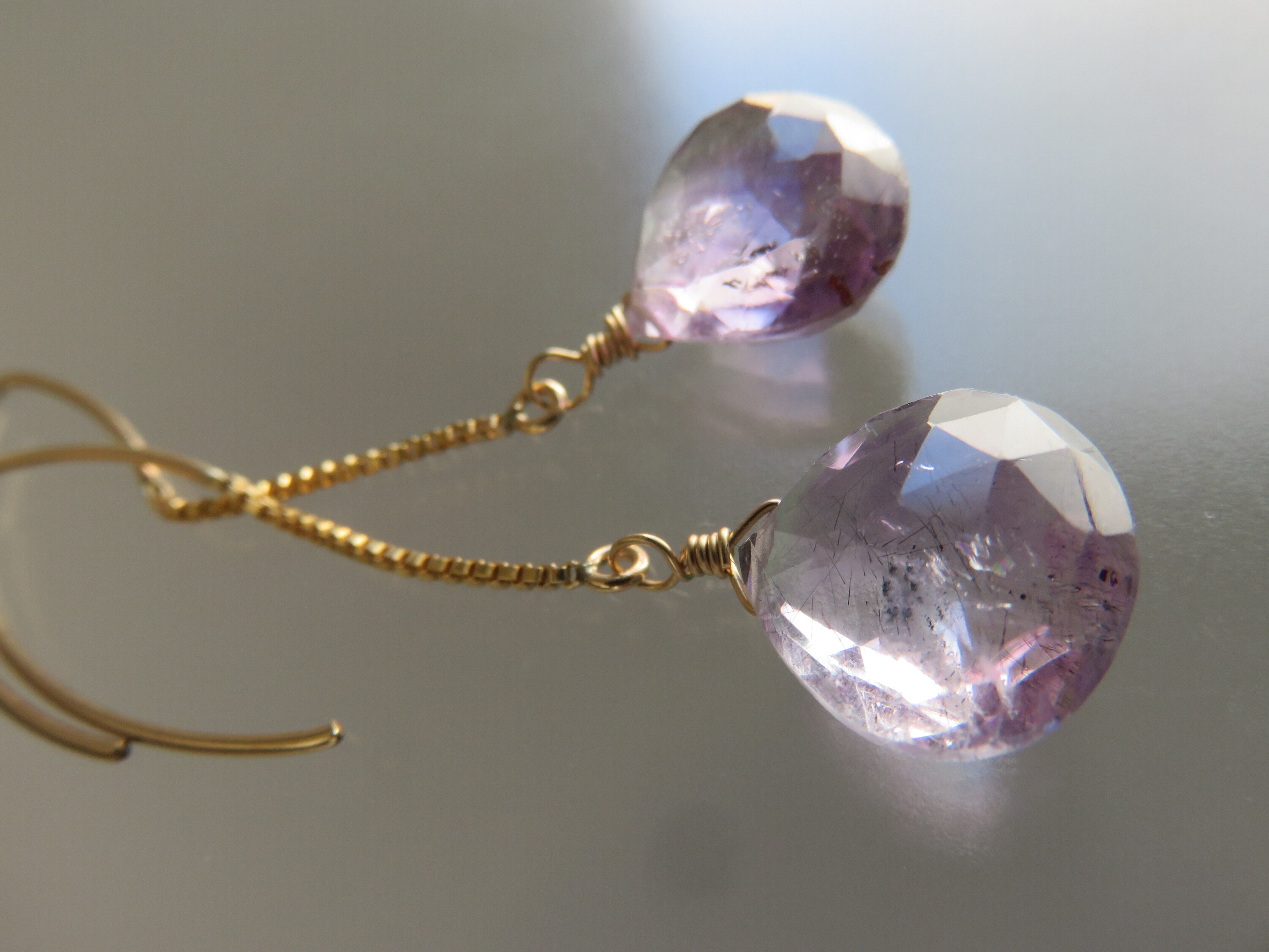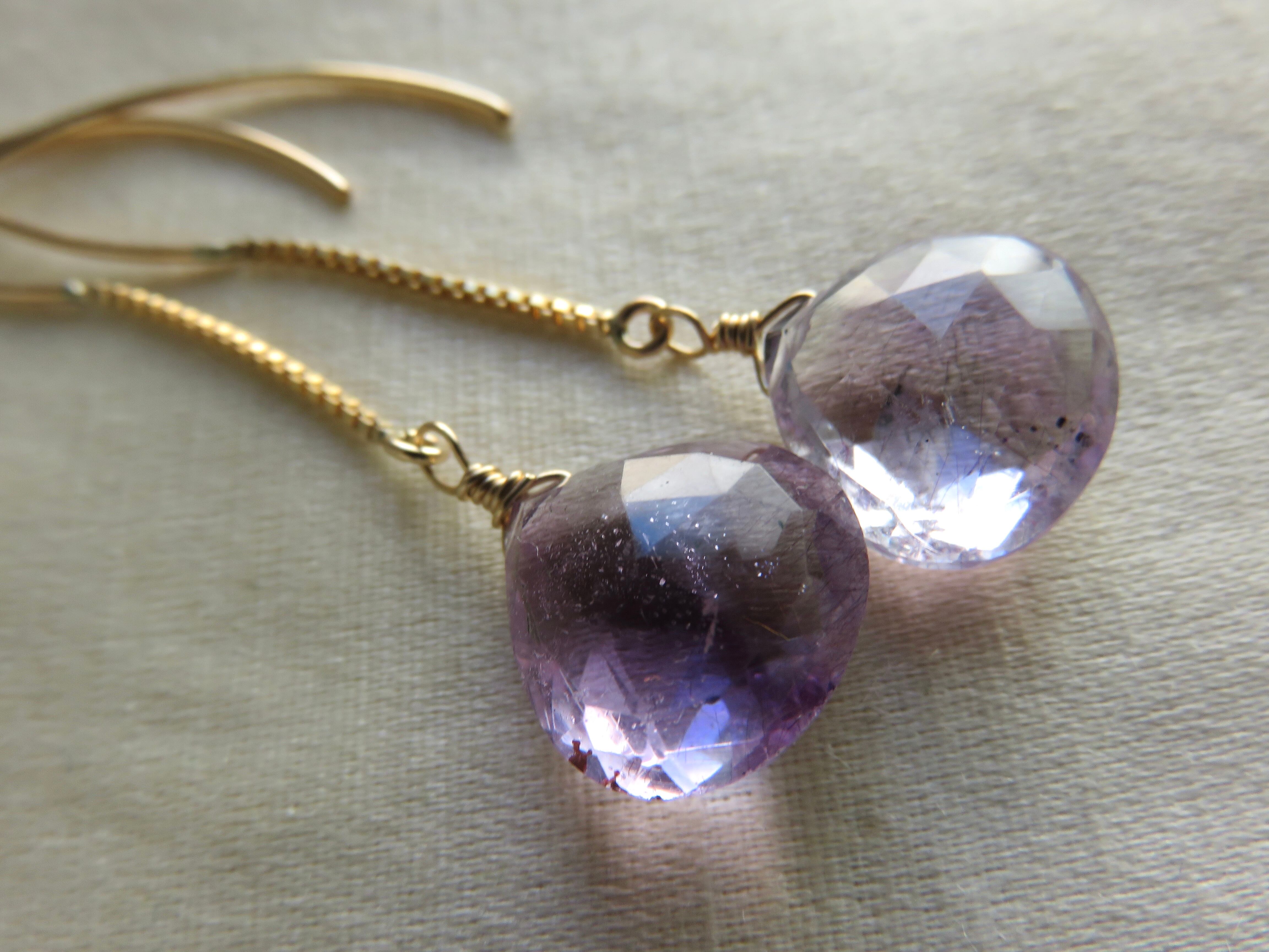 ボリュームのあるキラキラのマロンカットのエレスチャルアメジストのロングピアスです。