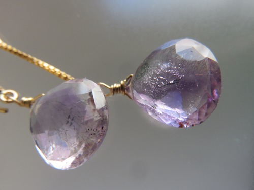 透明度が高いキラキラの水晶の中にアメジストの層と赤いレピドクロサイトやゲーサイトの結晶が見え、エレスチャルクォーツならではの澄んだ瑞々しい輝きがカットによって引き出され、シンプルだけどとっても存在感のあるピアスです。