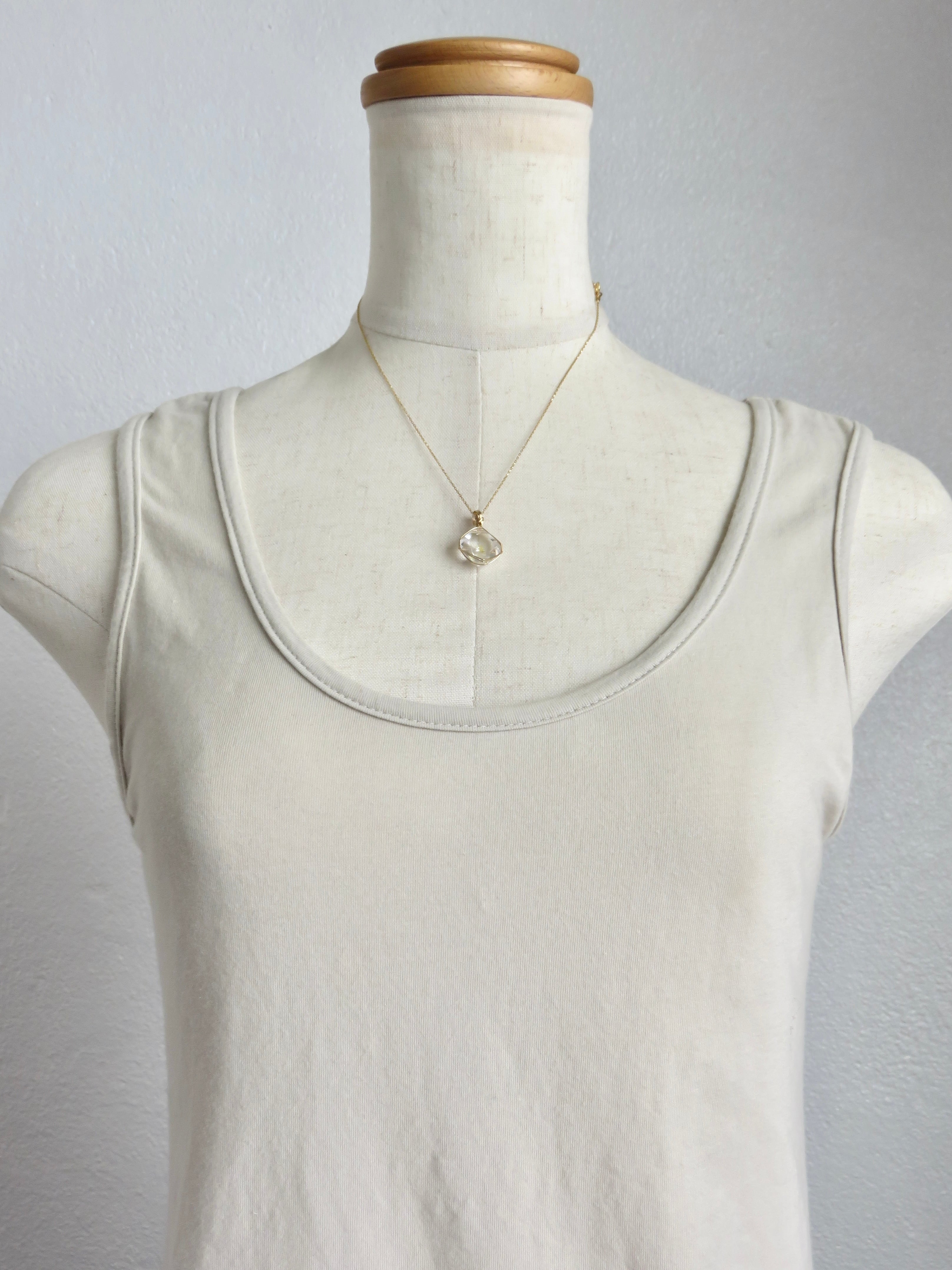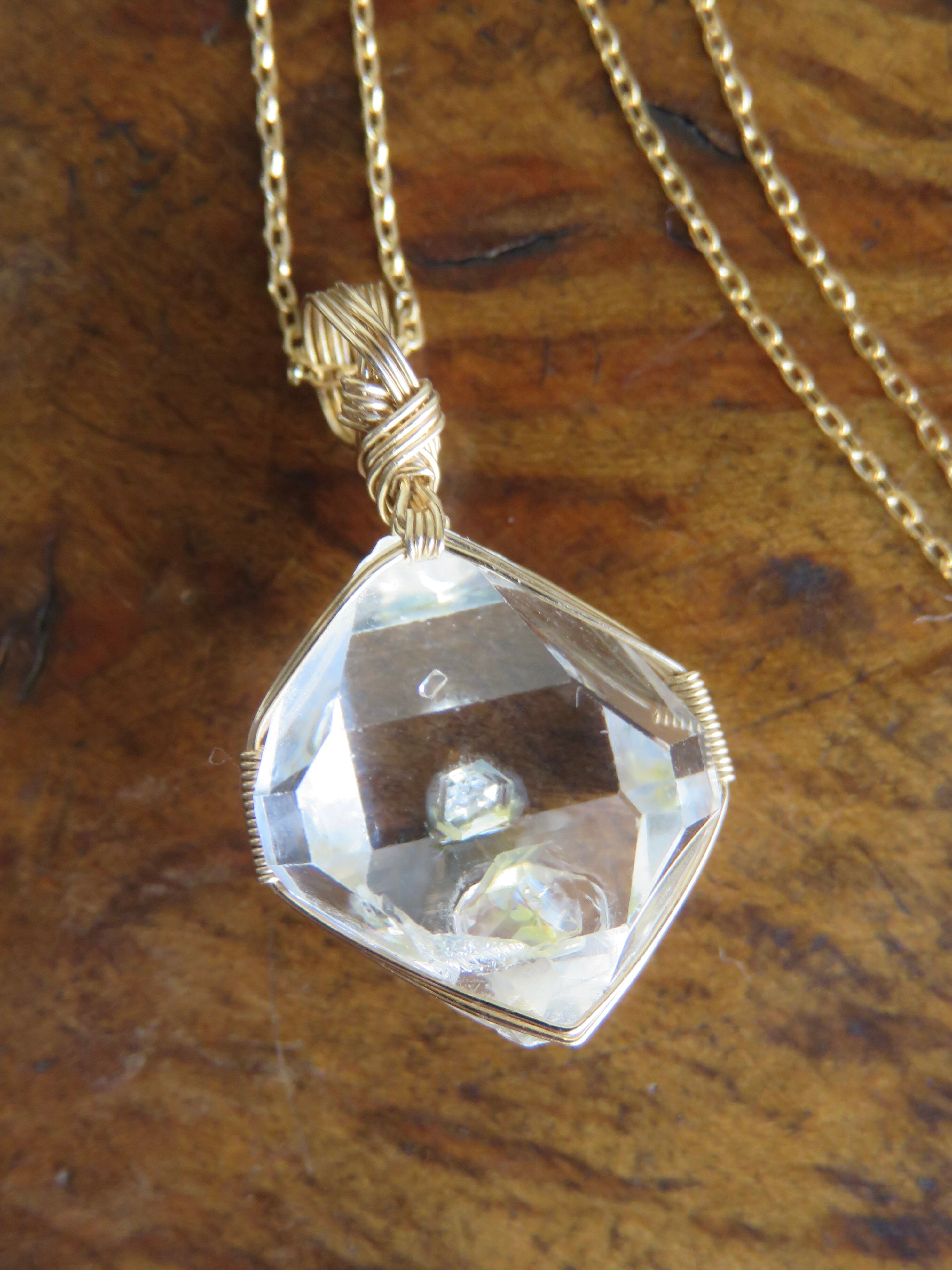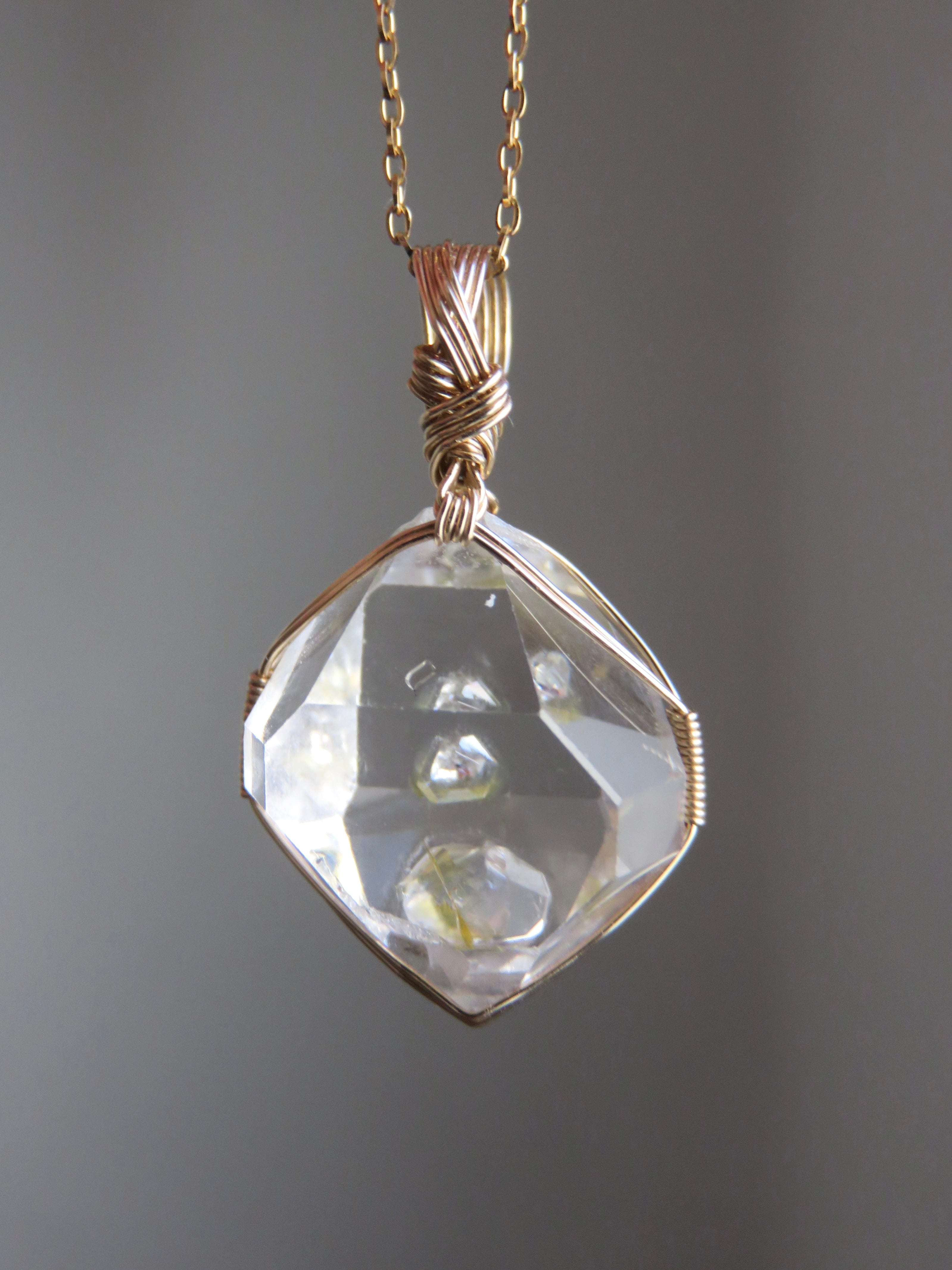 こちらのピースは小さめでバランスの取れた形に小さめの結晶がくっついているのですが、そちらが裏側になるように仕立てたので、正面からはハーキマーダイヤモンドの中に小さなダイヤが浮いているように見える、まるで小さな宝物をそっと隠し持っているような、ちょっと特別感のあるとっても可愛らしいペンダントトップに仕上がっています。