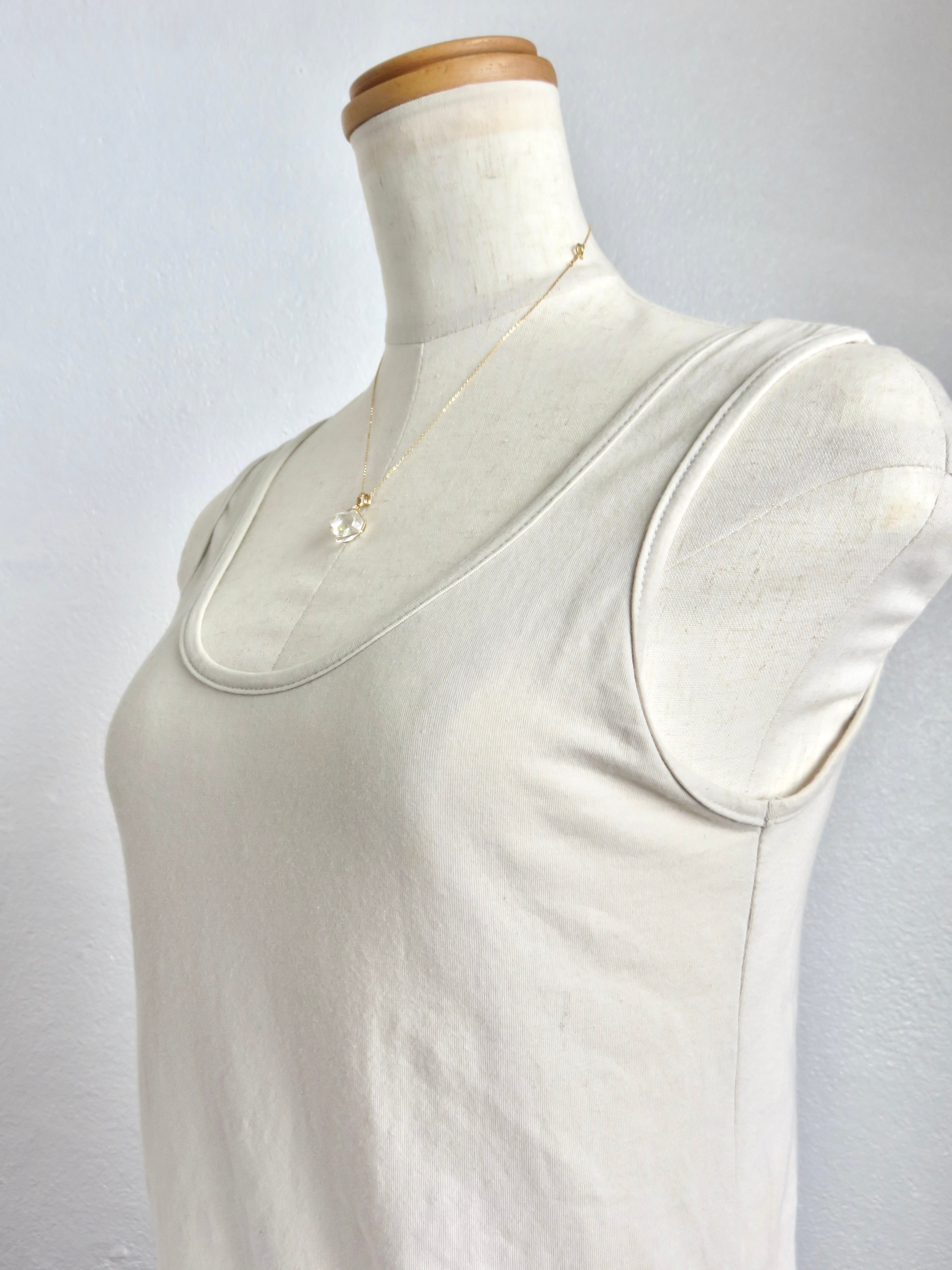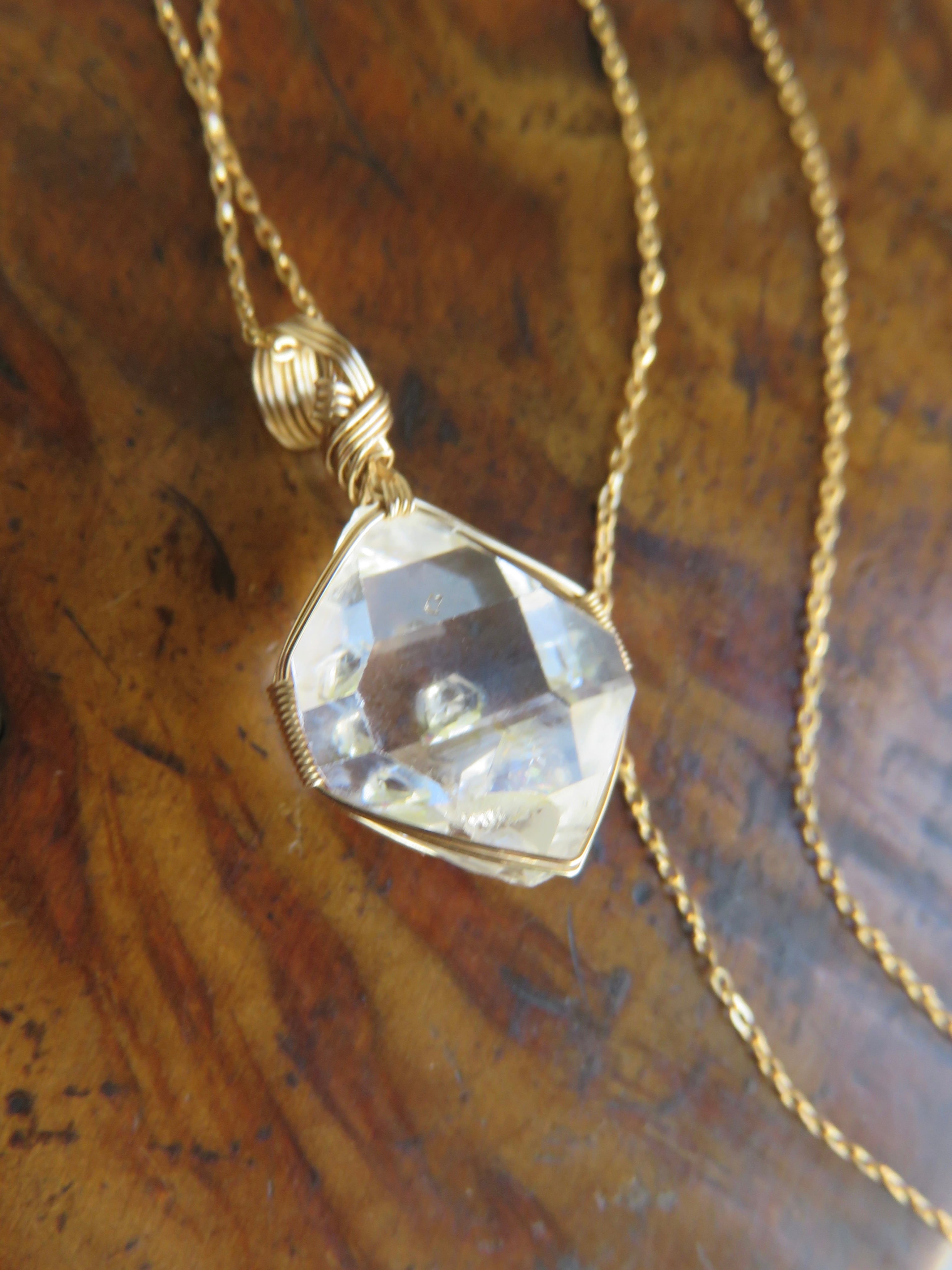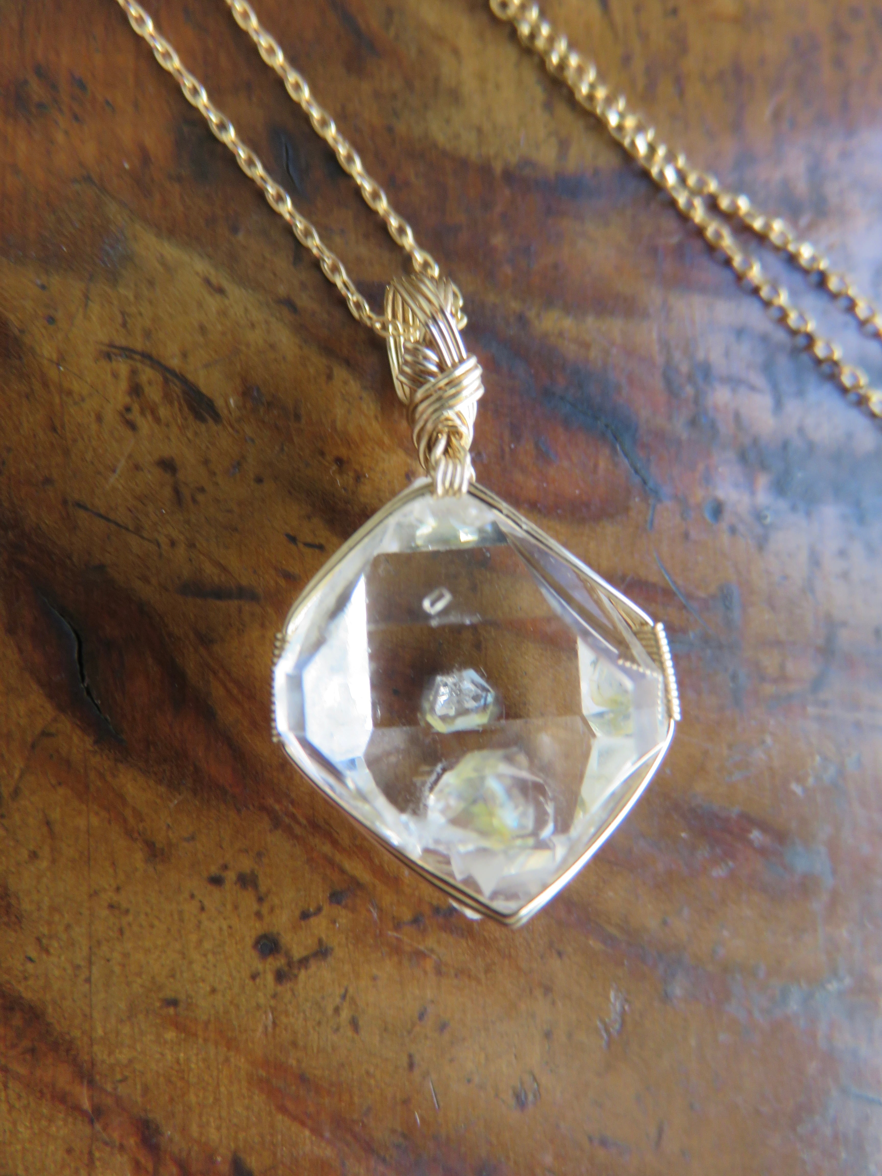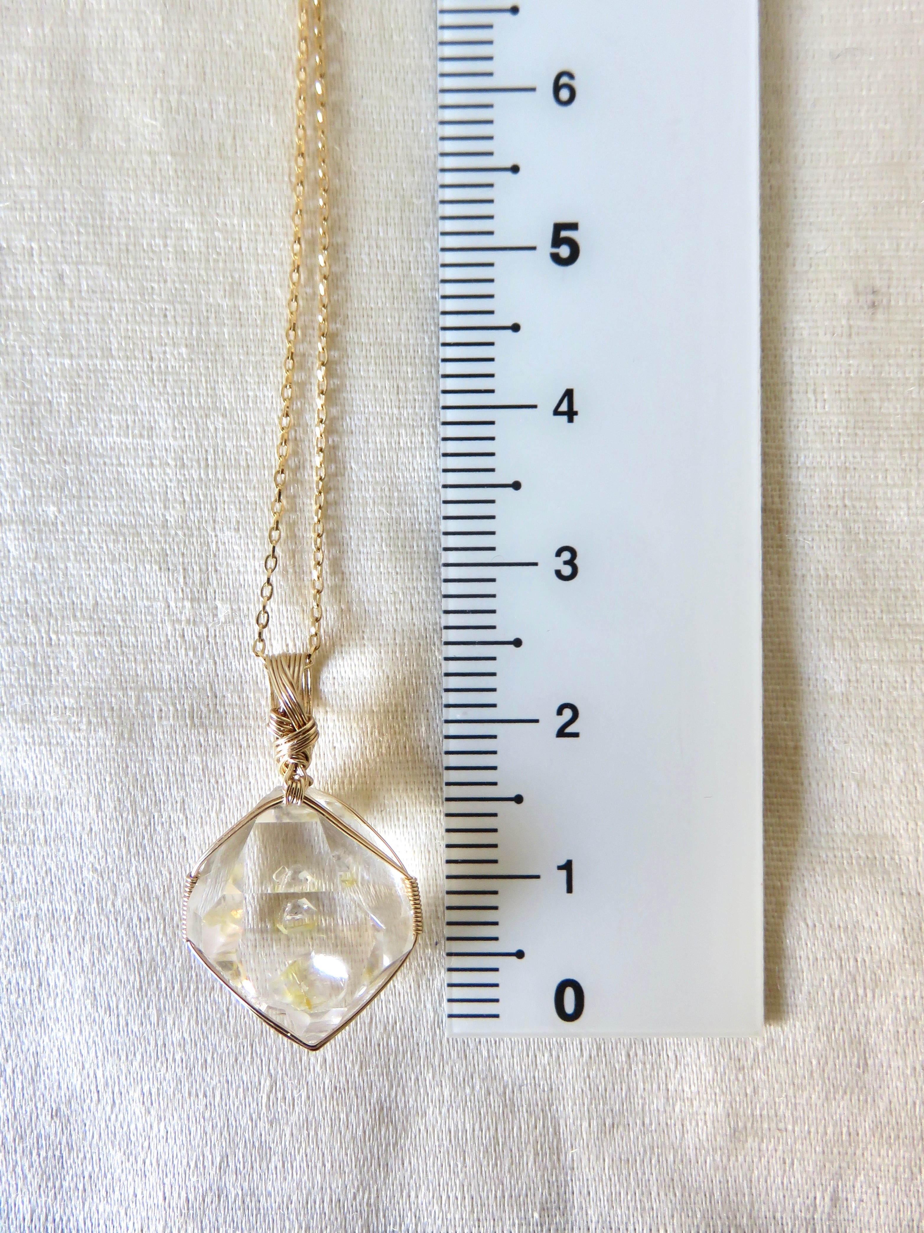 こちらのピースは小さめでバランスの取れた形に小さめの結晶がくっついているのですが、そちらが裏側になるように仕立てたので、正面からはハーキマーダイヤモンドの中に小さなダイヤが浮いているように見える、まるで小さな宝物をそっと隠し持っているような、ちょっと特別感のあるとっても可愛らしいペンダントトップに仕上がっています。