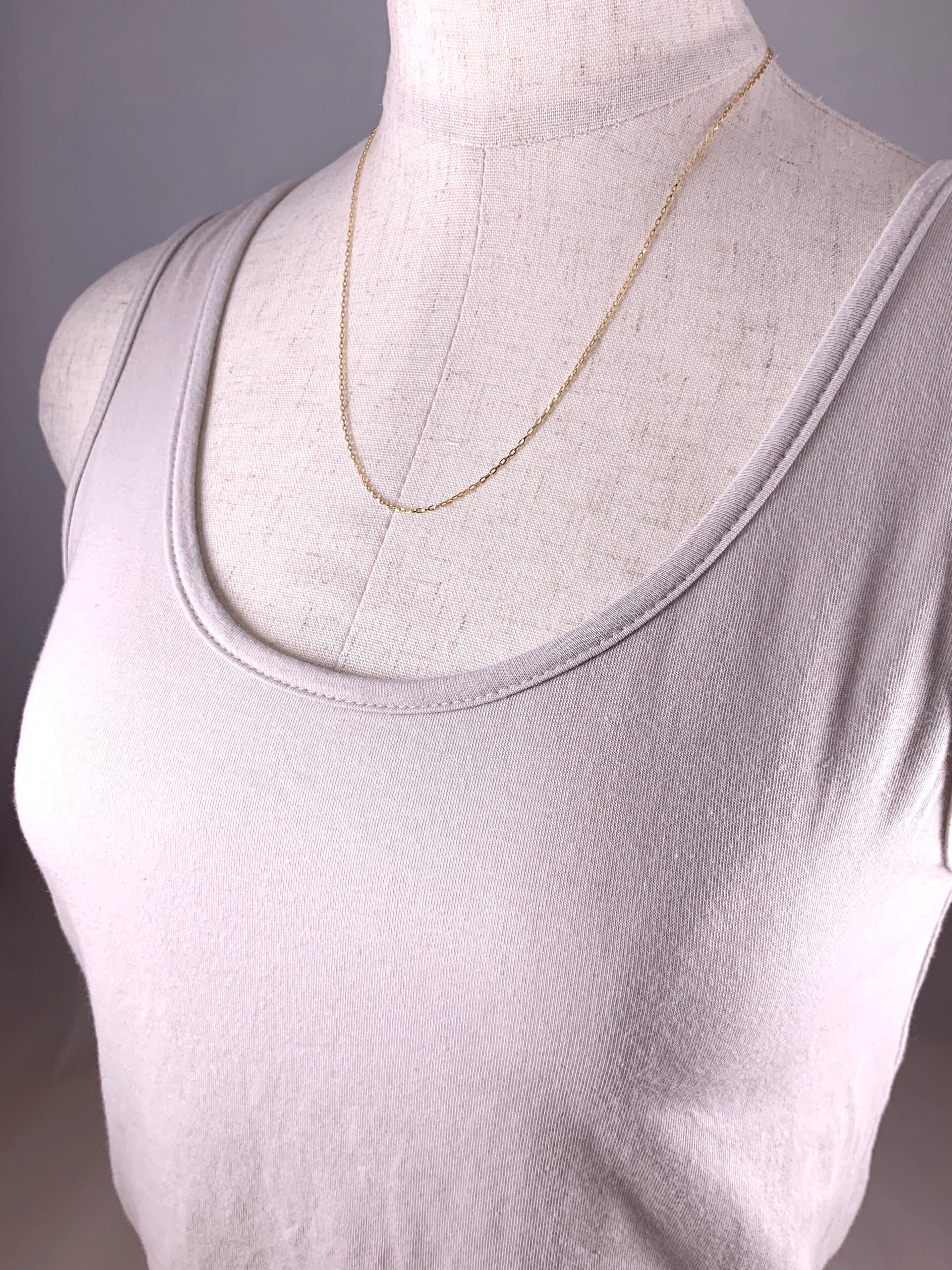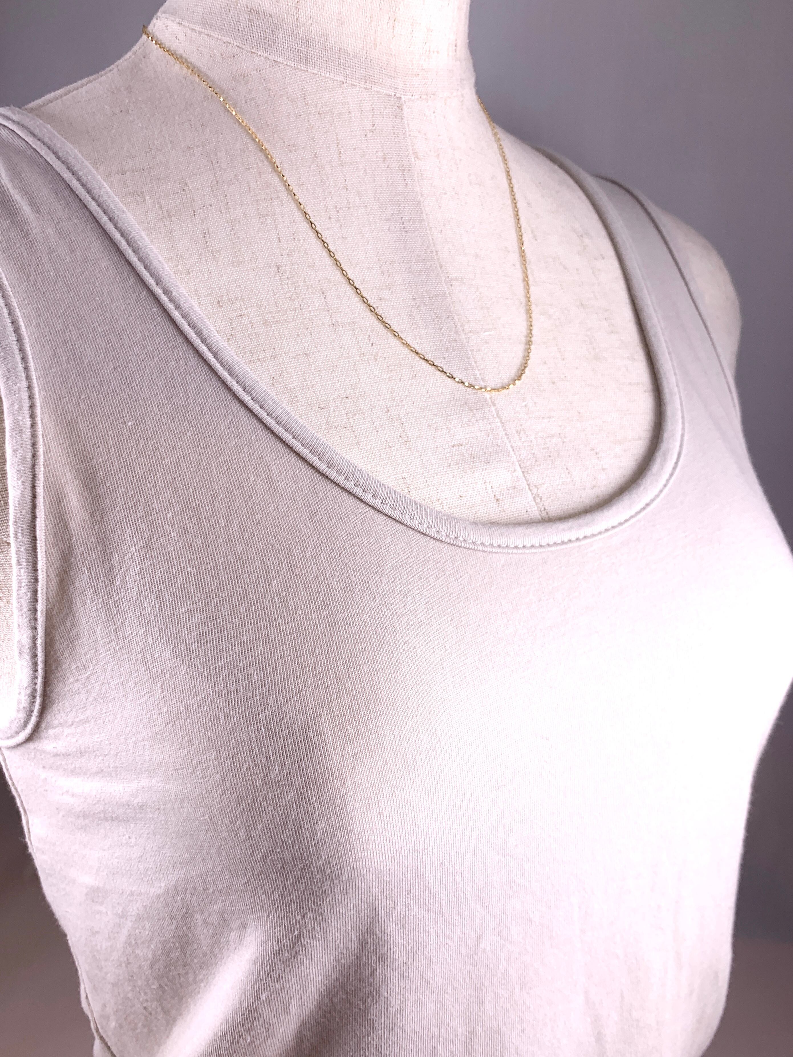 少し大きめのペンダントトップに合わせたり、毎日のように身につけていただく場合でも安心してつけられるしっかりとした太さ、大きめのトップが安定しやすい長さに、長さ調整カンやアジャスターをつけずに最もシンプルな仕様でお作りしました。