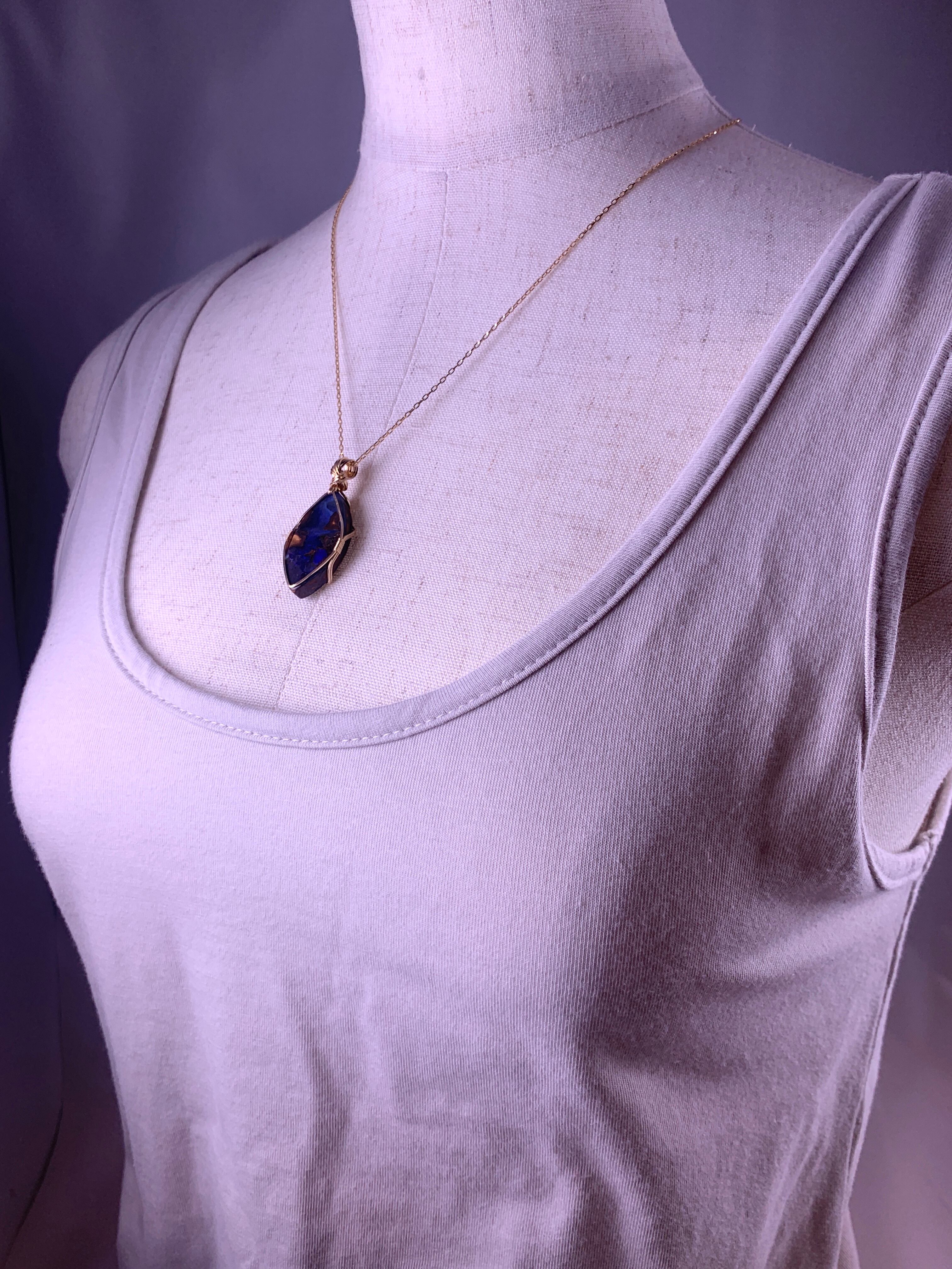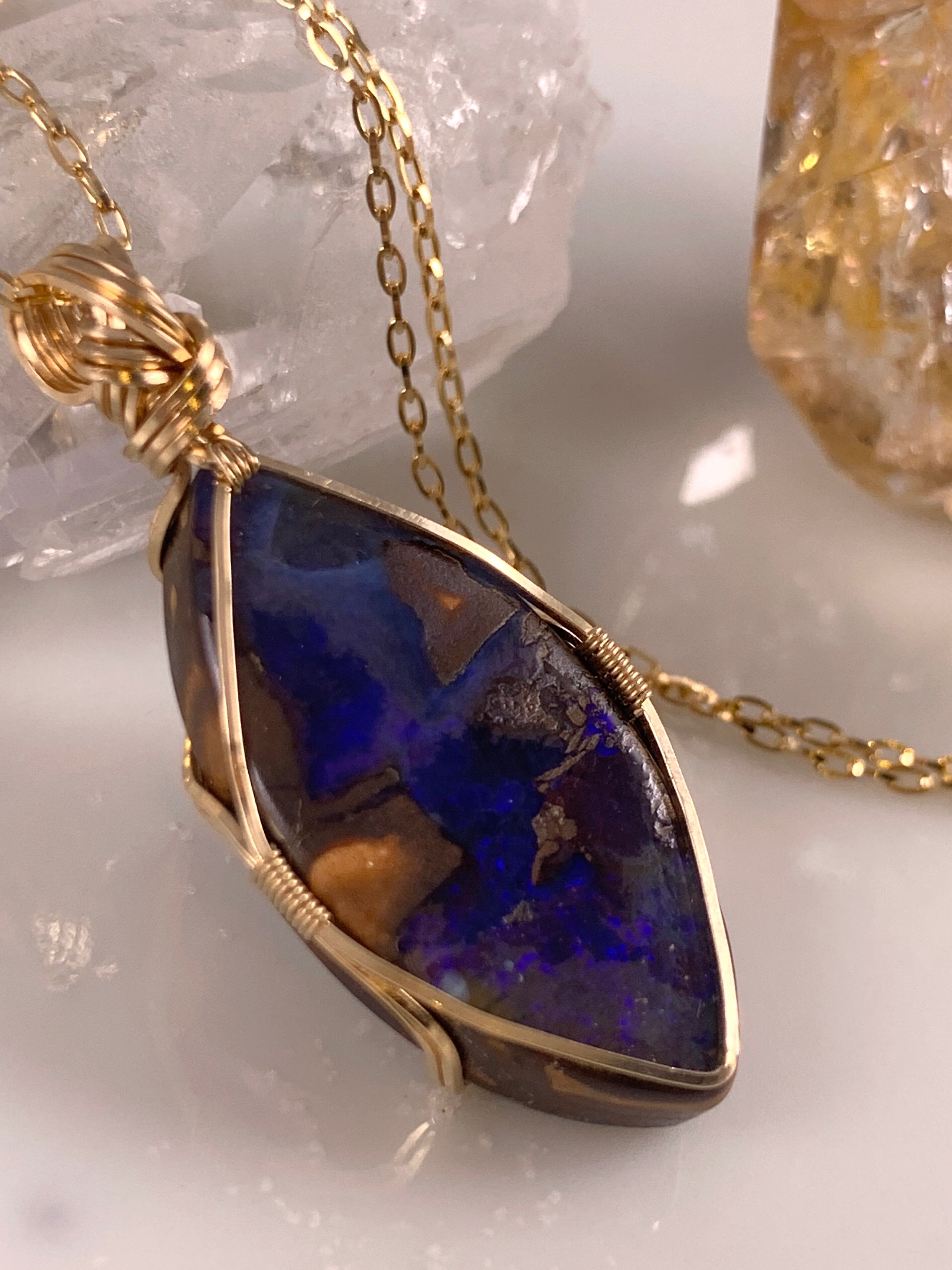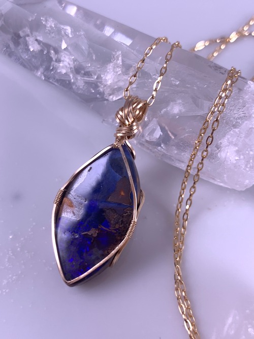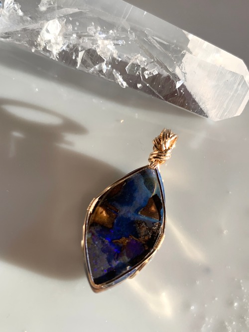 青い遊色が静かに光る、印象的なカットのボルダーオパールを女神巻きペンダントトップに仕立てました。