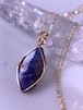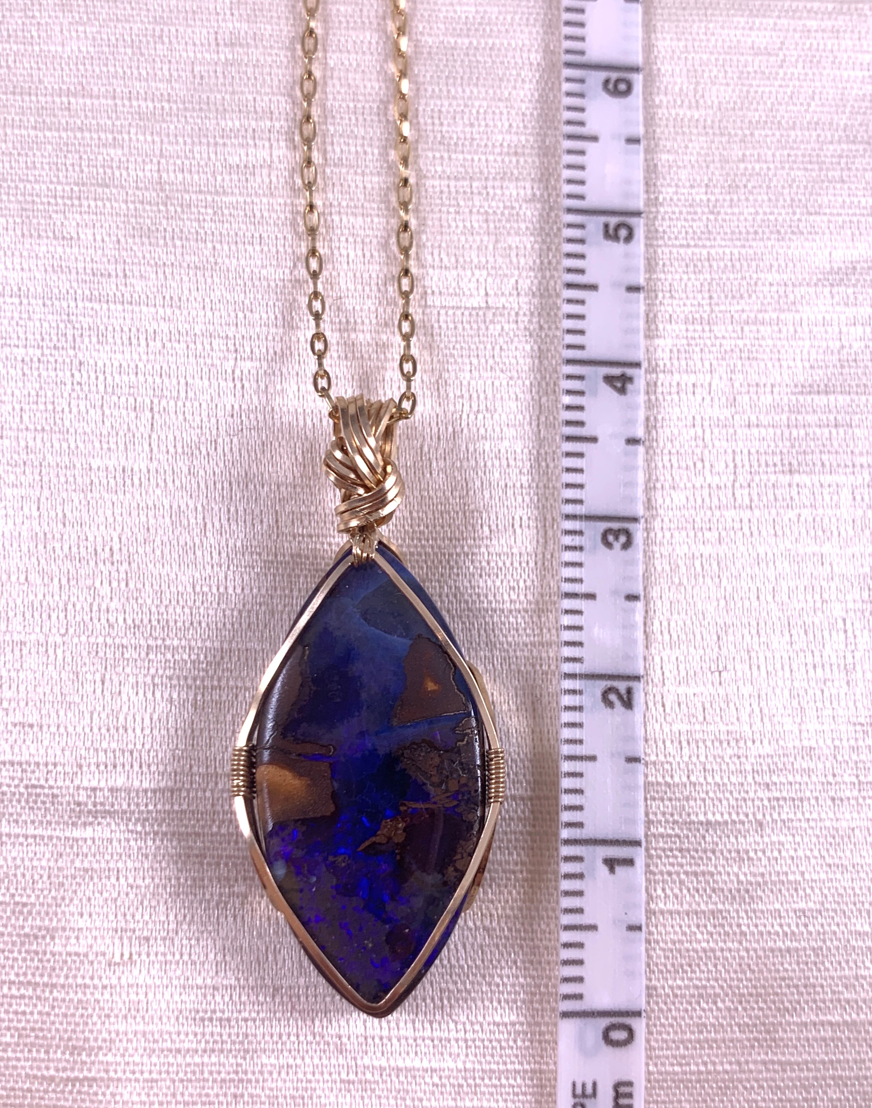 遊色の出方は華やかというほどではありませんが、夜空のような深い青がゆらめくボルダーオパールは、マーキス型のようなカットも印象的でシャープな雰囲気です。母岩とオパール部分の作り出す模様はナチュラルで優しさと安定感も感じさせ、神秘的な魅力を持ったボルダーオパールです。