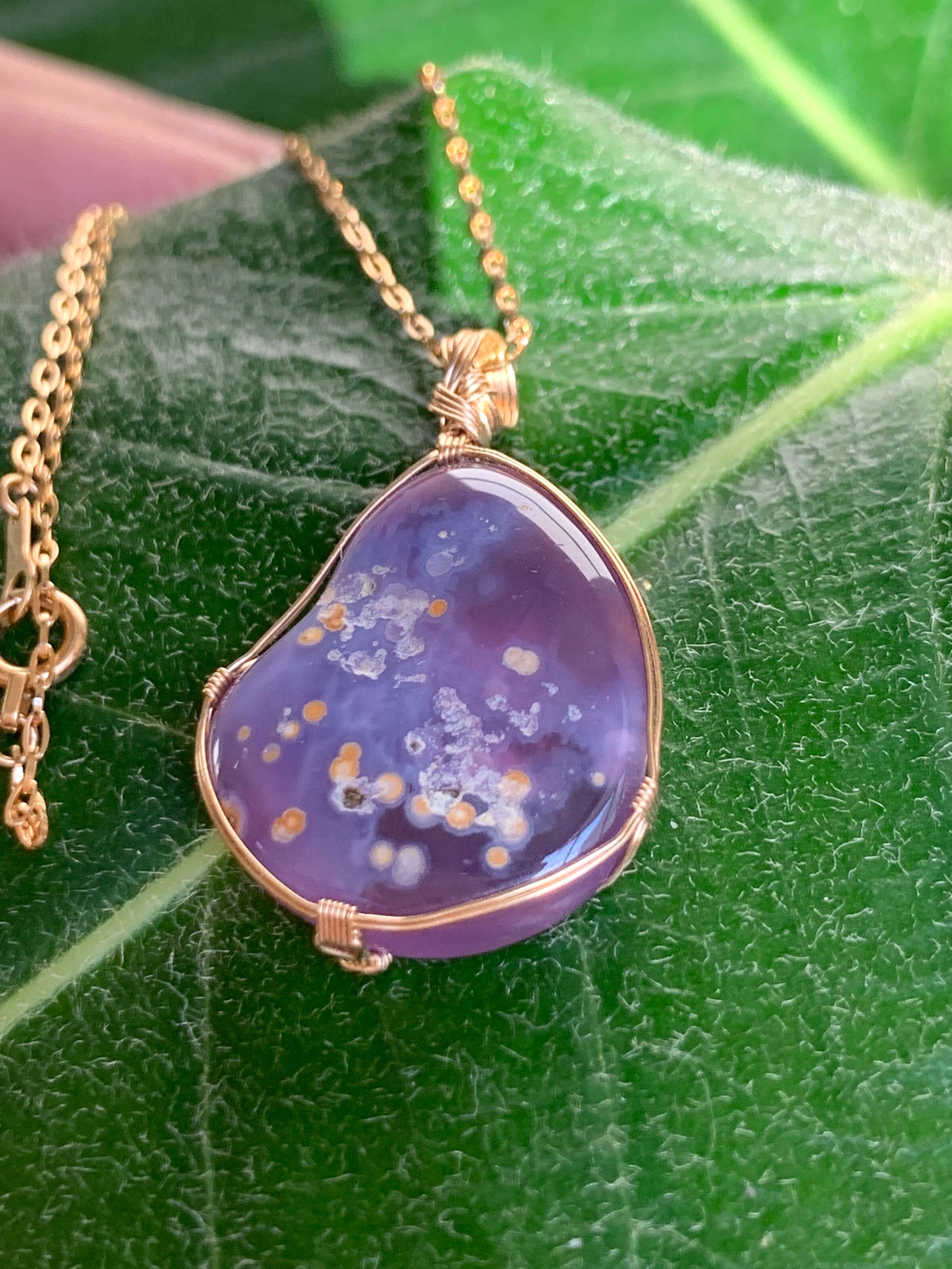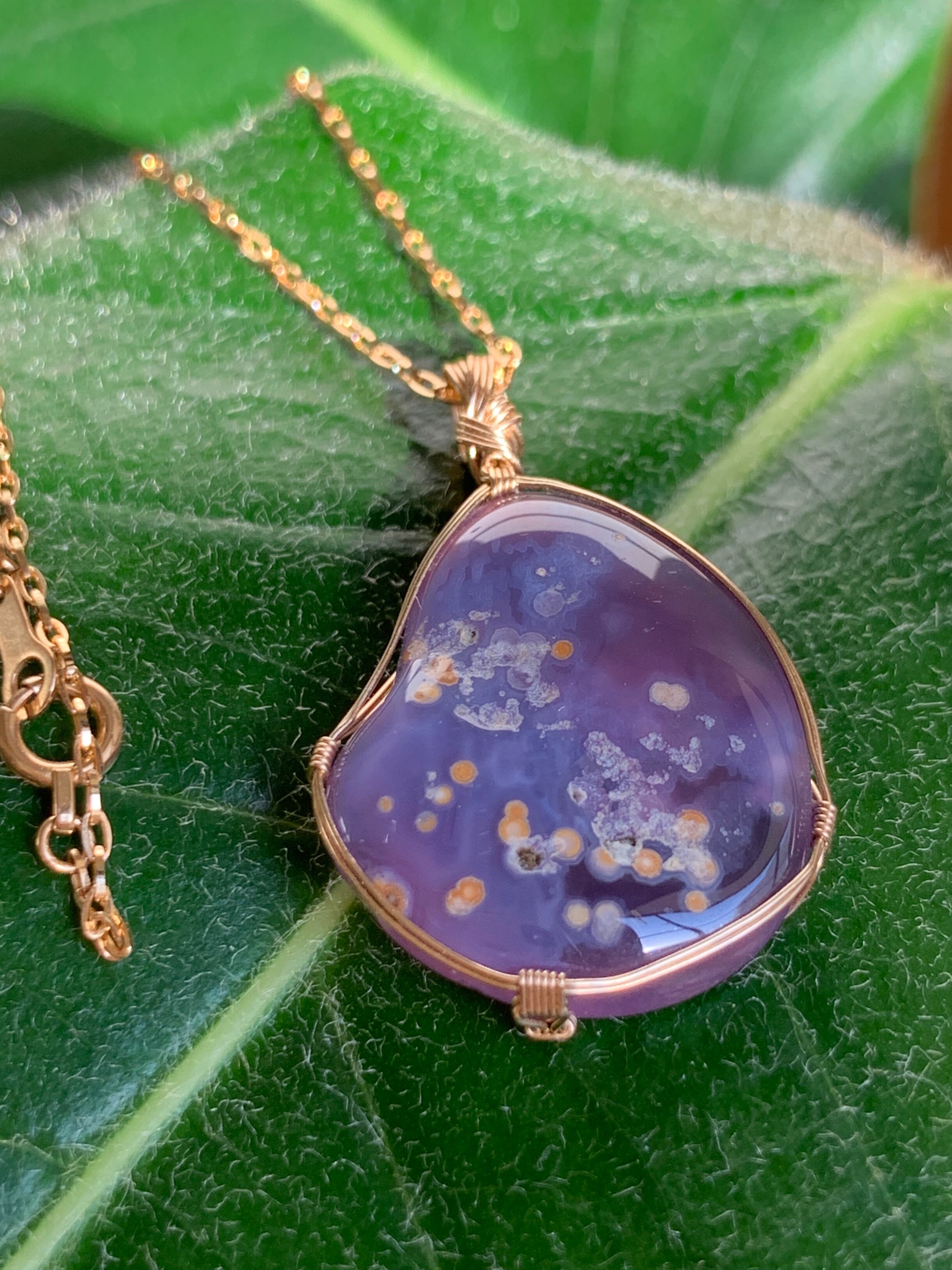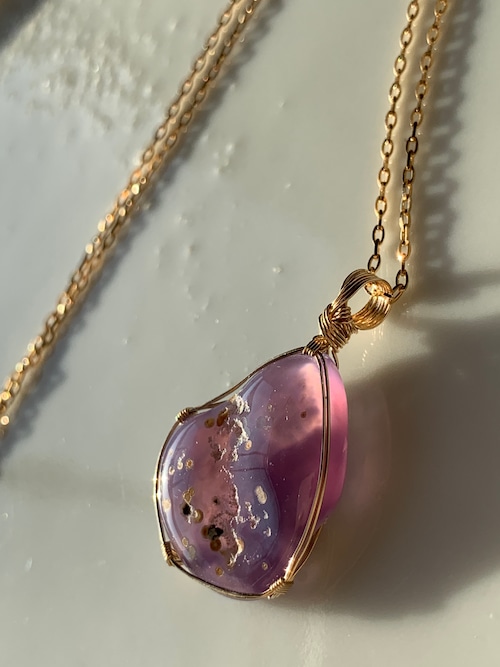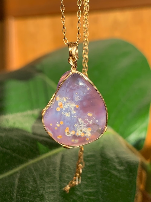 モコモコしたアゲートらしい形、模様を生かして研磨されたナチュラルな形と、ぶどう味のグミのようななんとも言えないプルッとした質感が可愛らしい、インドネシア産のパープルアゲートを女神巻き®︎ペンダントトップに仕立てました。