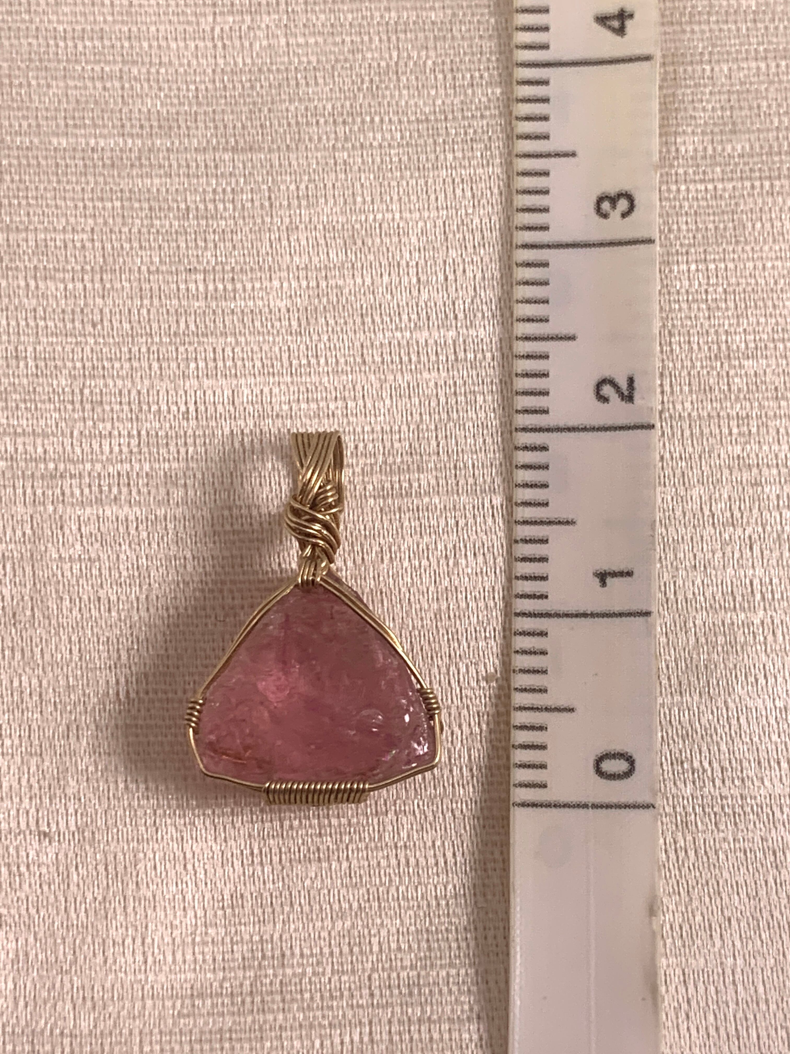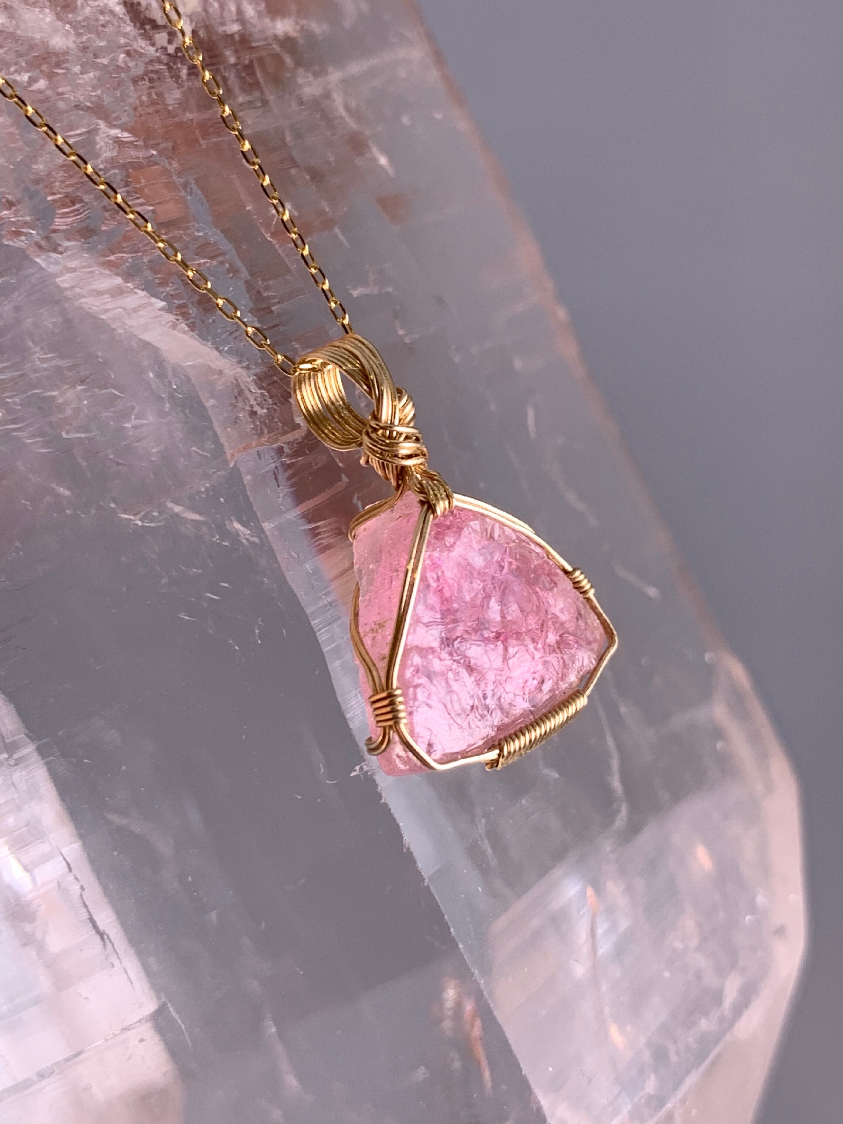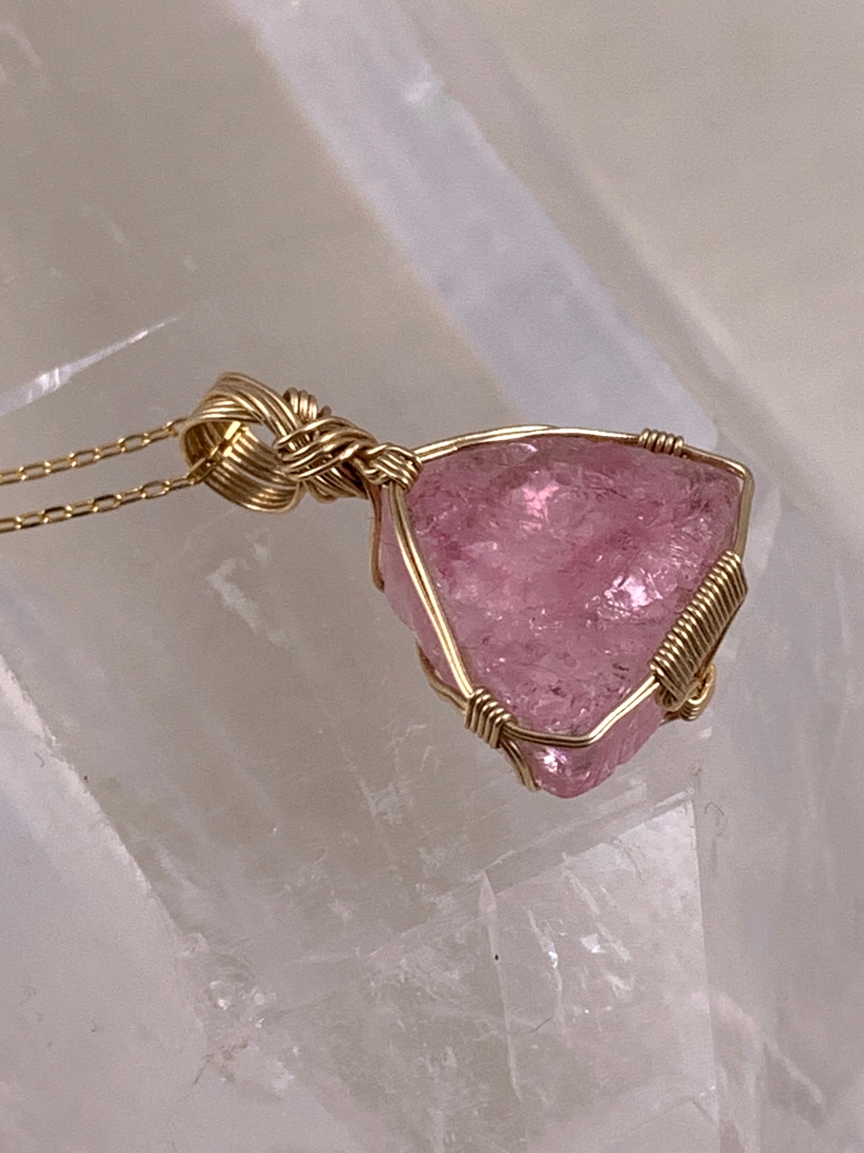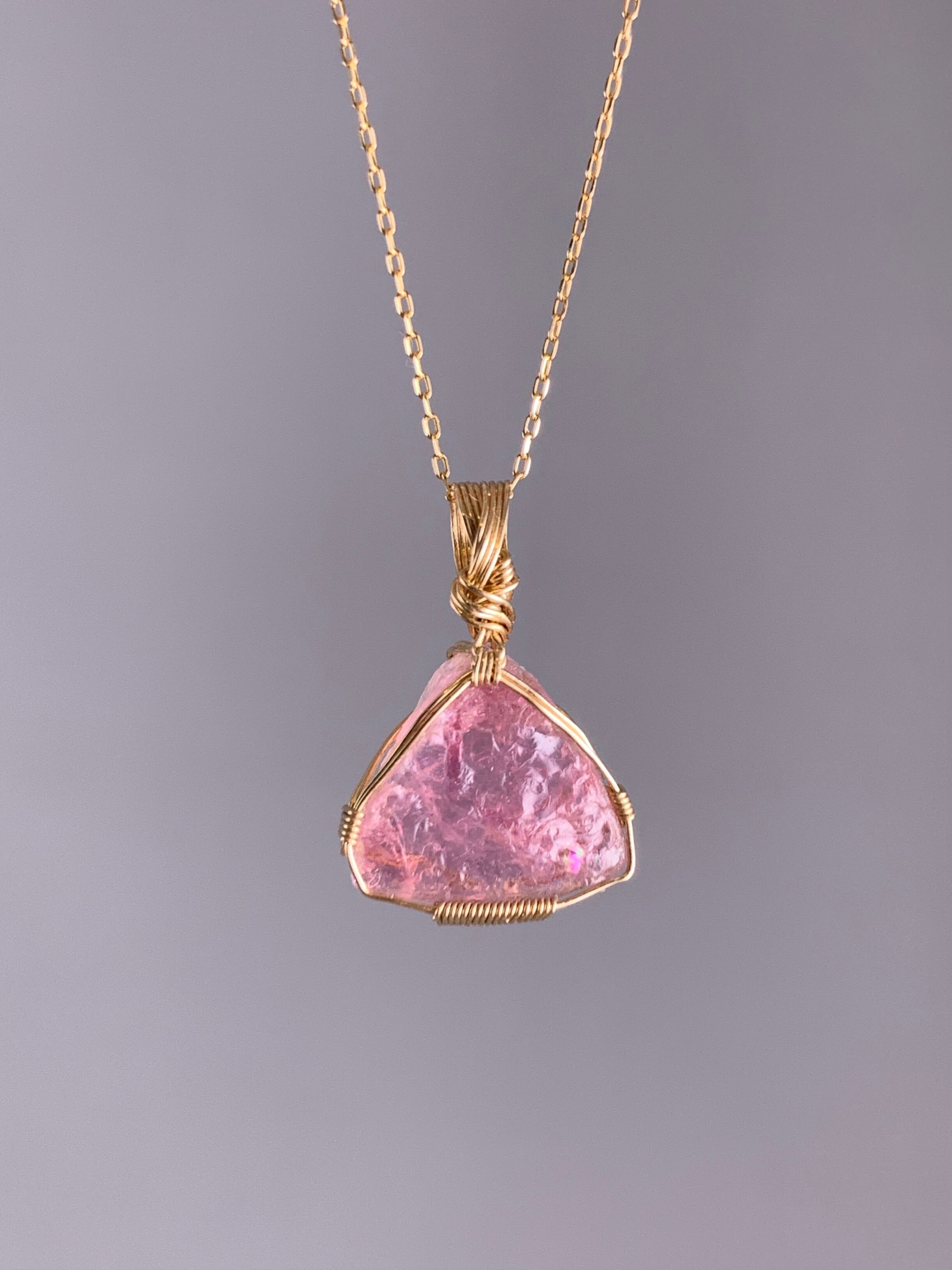 淡いパステルピンクと三角形が可愛らしいトルマリンの原石を、シンプルな女神巻きペンダントトップに仕立てました。