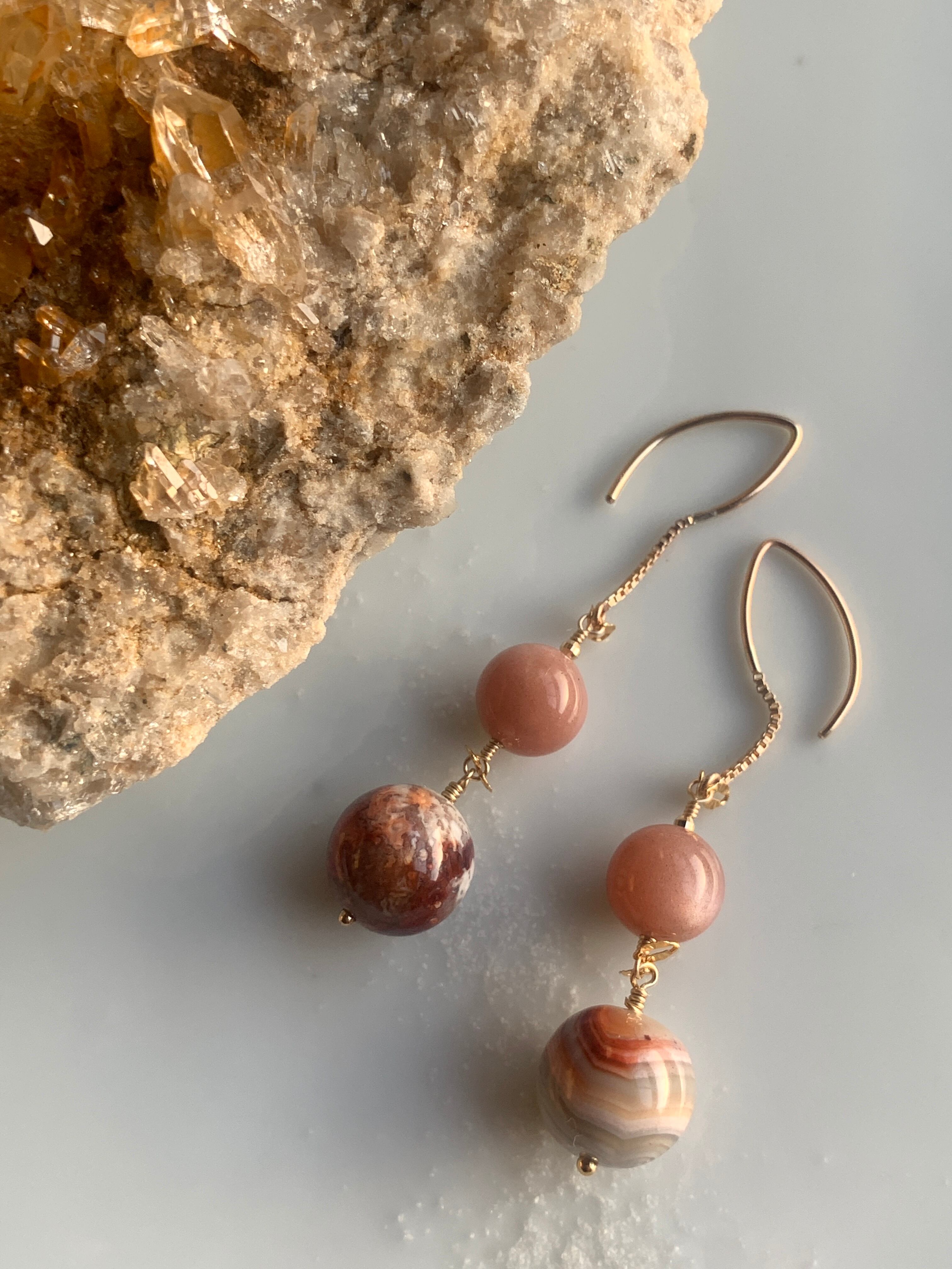 オレンジ系のカラーのムーンストーンと、同系色のラグナレースアゲートを組み合わせたシンプルなデザインピアスです。同時にお作りしたいくつかのピアスと合わせて星のテーマで名付けたので【Mars】火星のイメージでしたがもう少し優しい雰囲気、お花のような可愛らしさやナチュラルな雰囲気のあるピアスです。