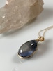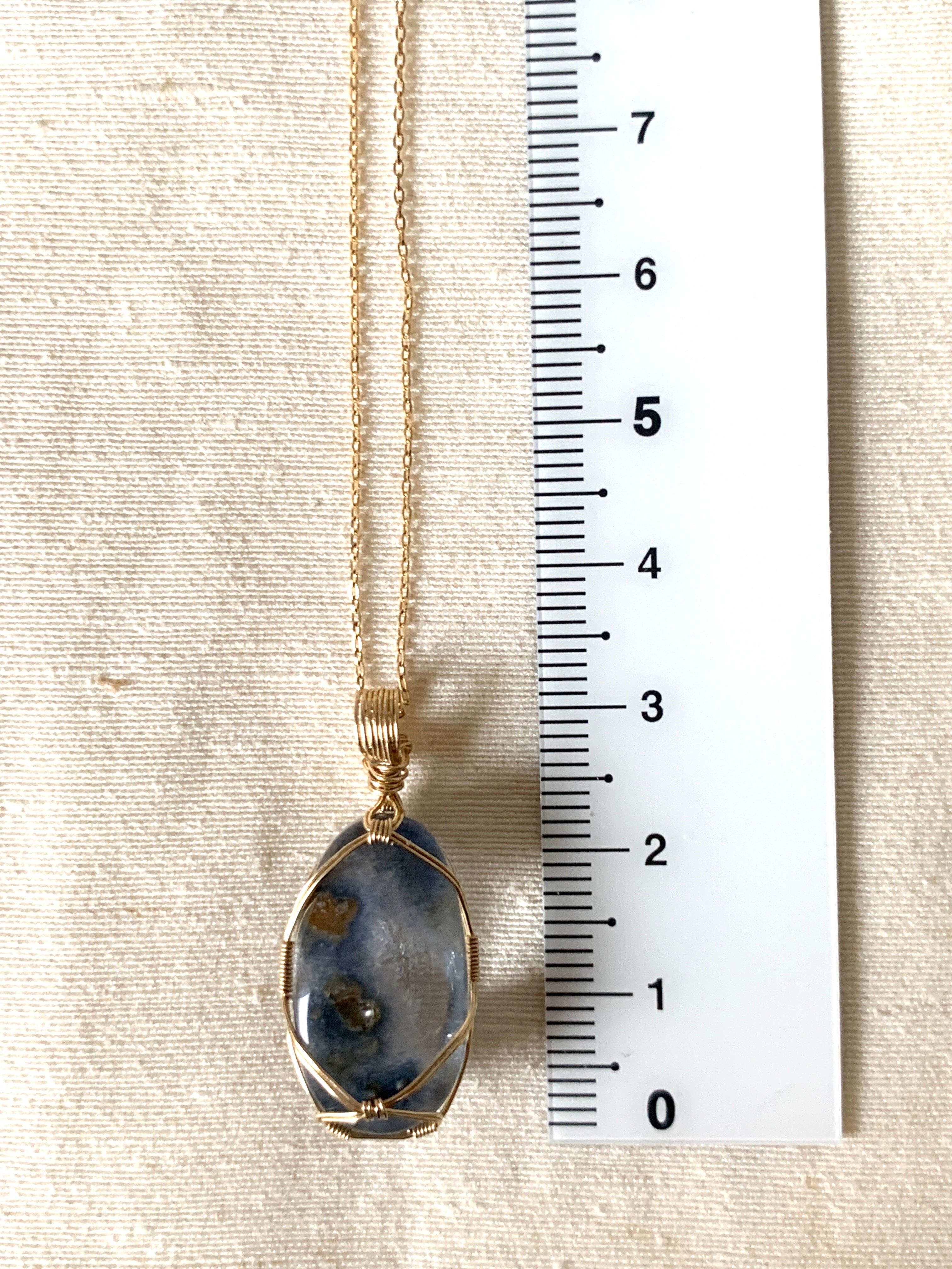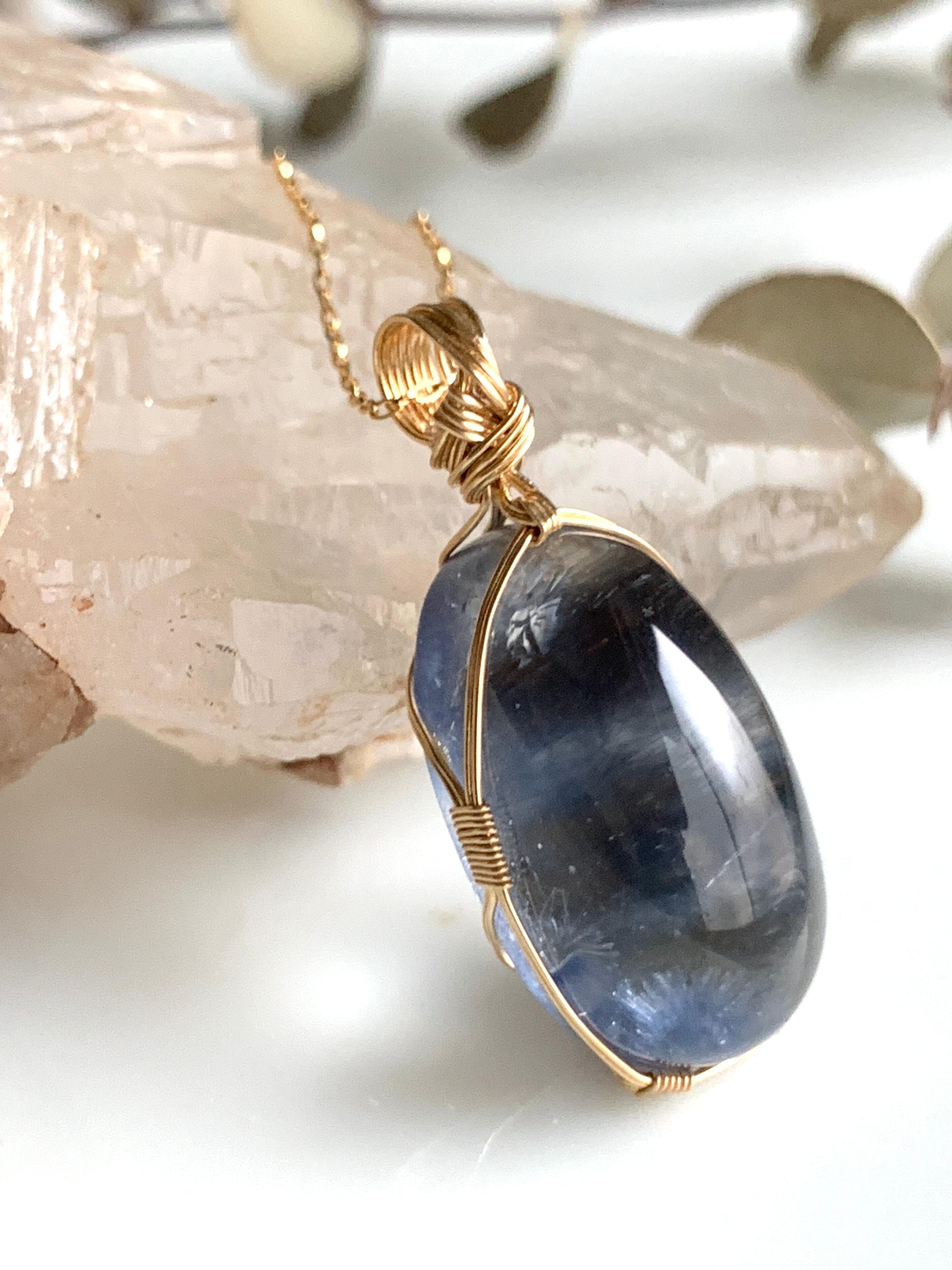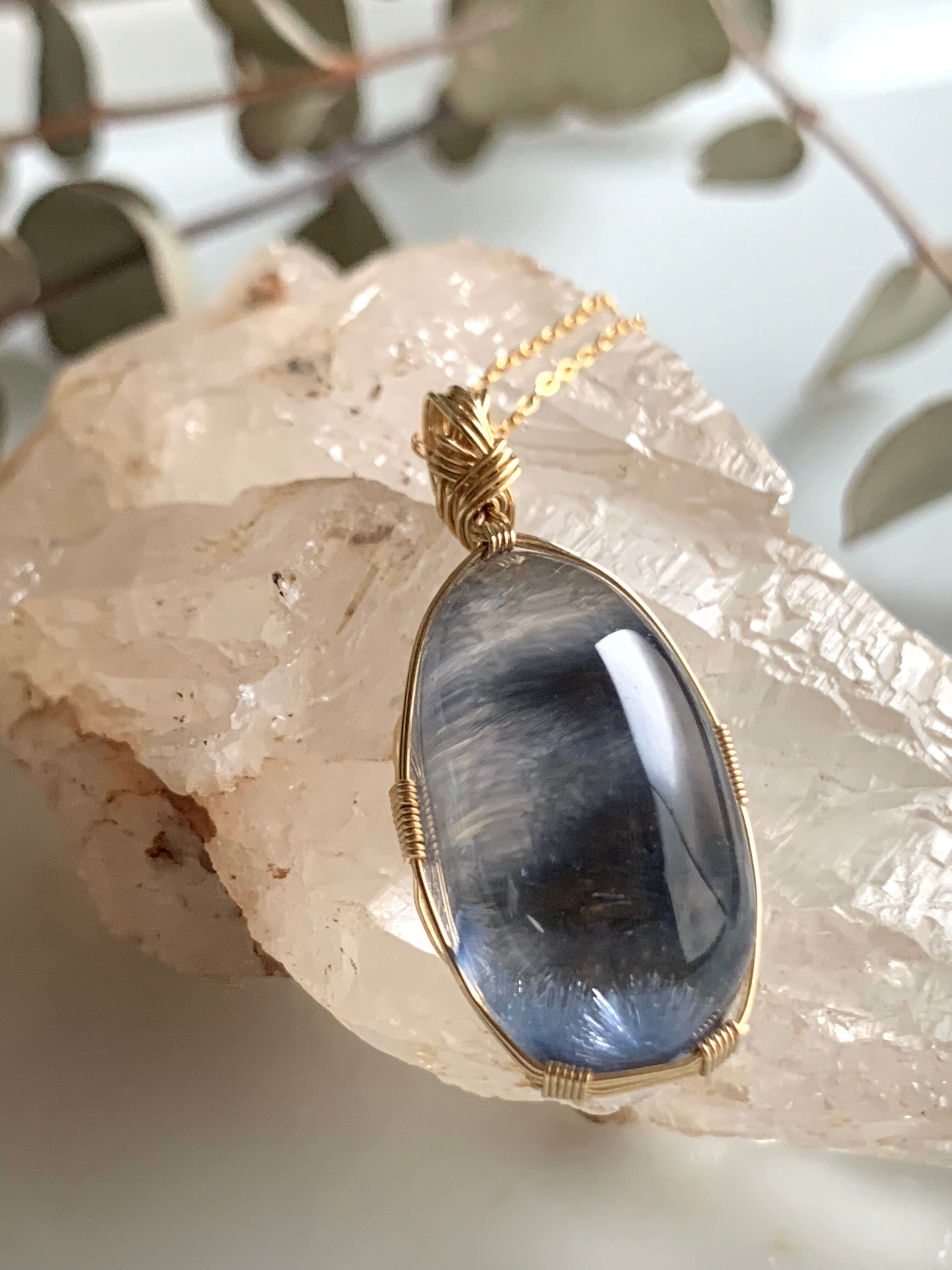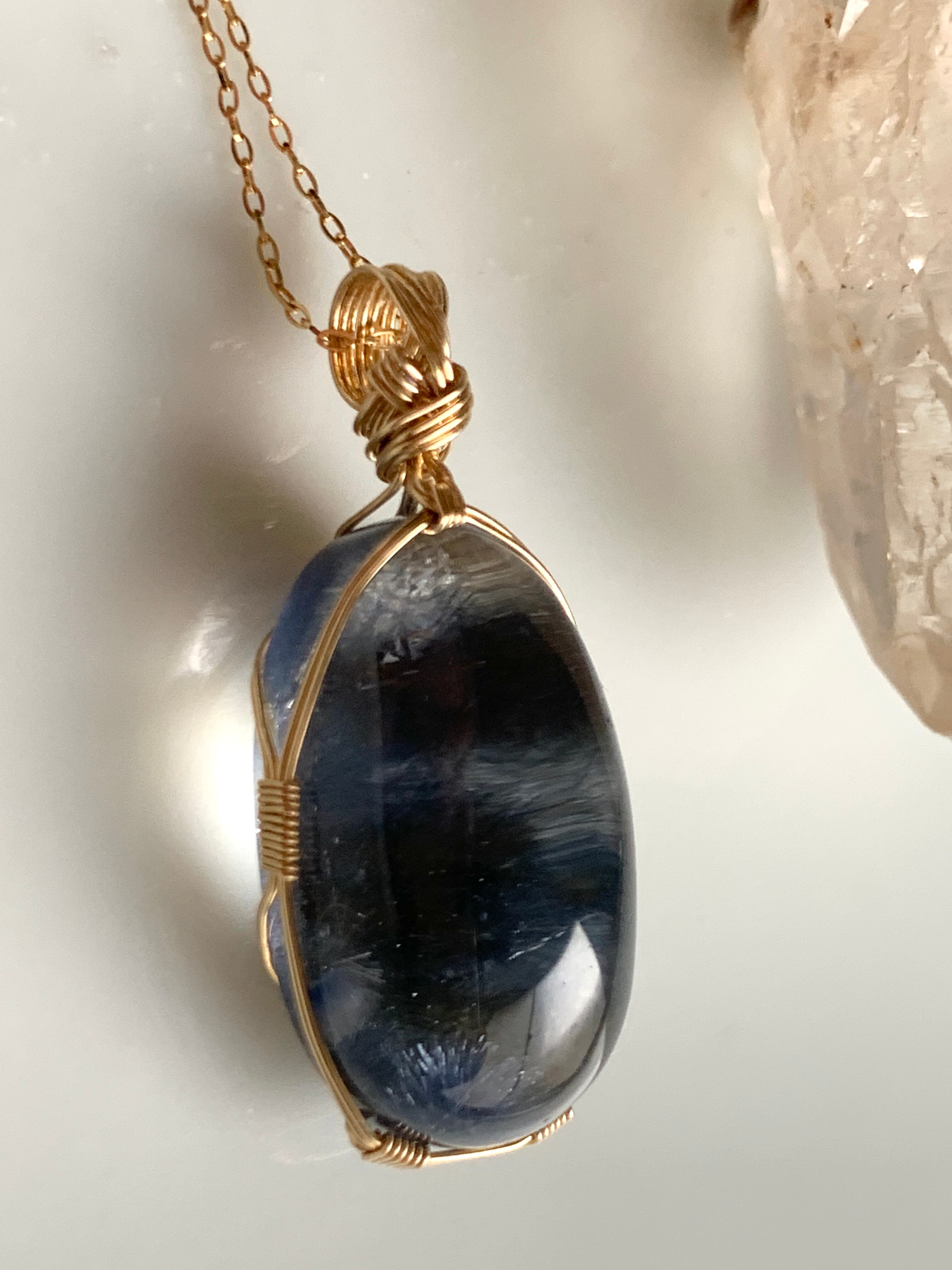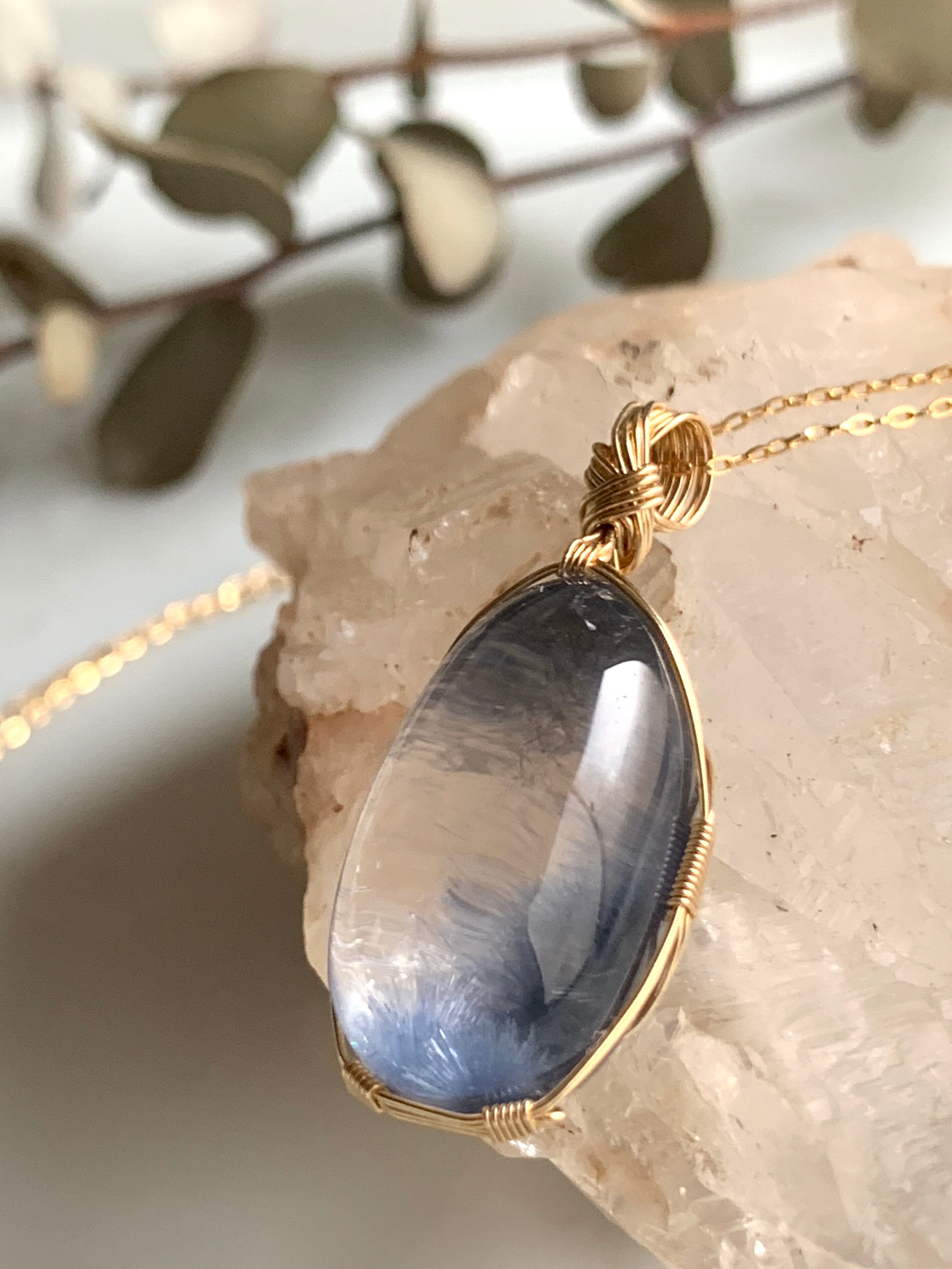 水晶の中に含まれた青色のデュモルチェライトという鉱物のインクルージョンにより、深い藍色に染まったように見える美しい「デュモルチェライトインクォーツ」を女神巻き®︎ペンダントトップに仕立てました。
