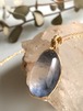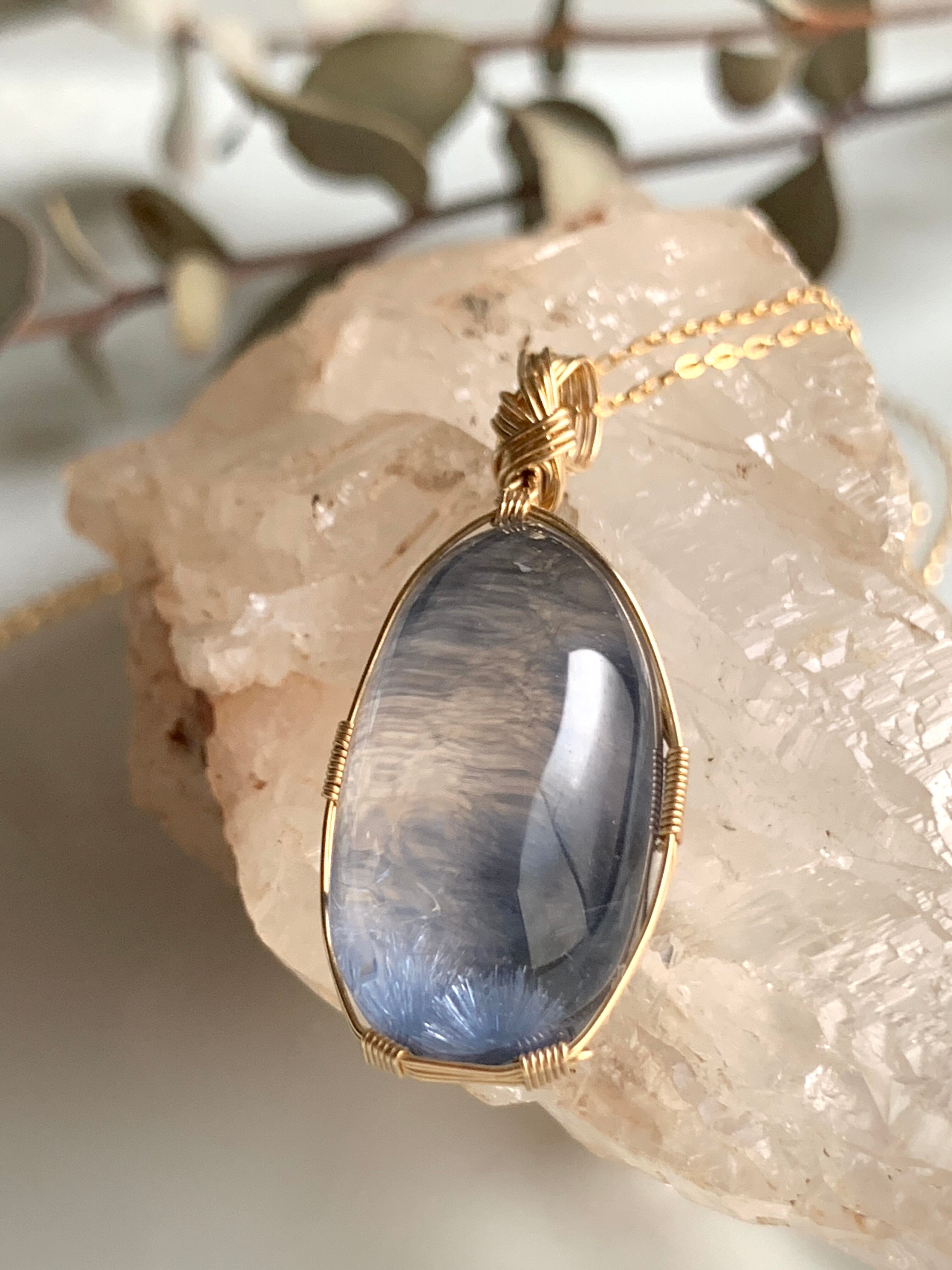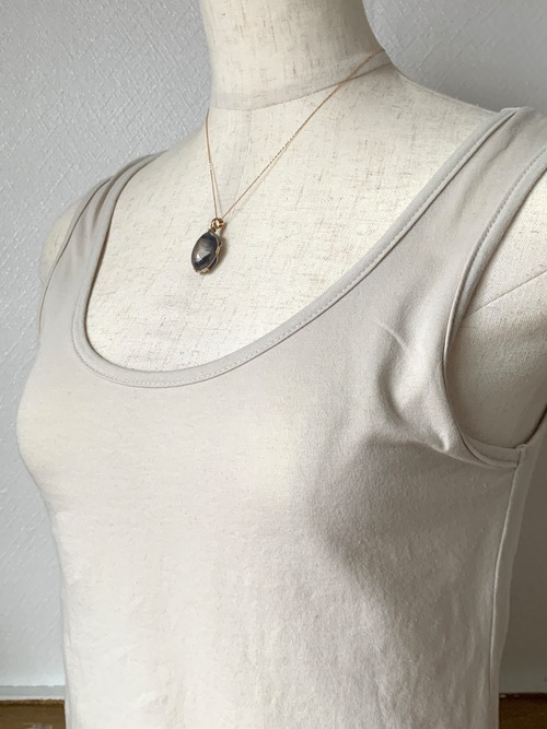中をよく覗き込んでみるとキラキラと細かく光を反射するお花のようなデュモルチェライトの結晶も見られる、とても美しく雰囲気あるピースです。縦長のコロリと丸みのある形もスタイリッシュながら親しみを持てる形状で胸元にしっくり馴染みます。