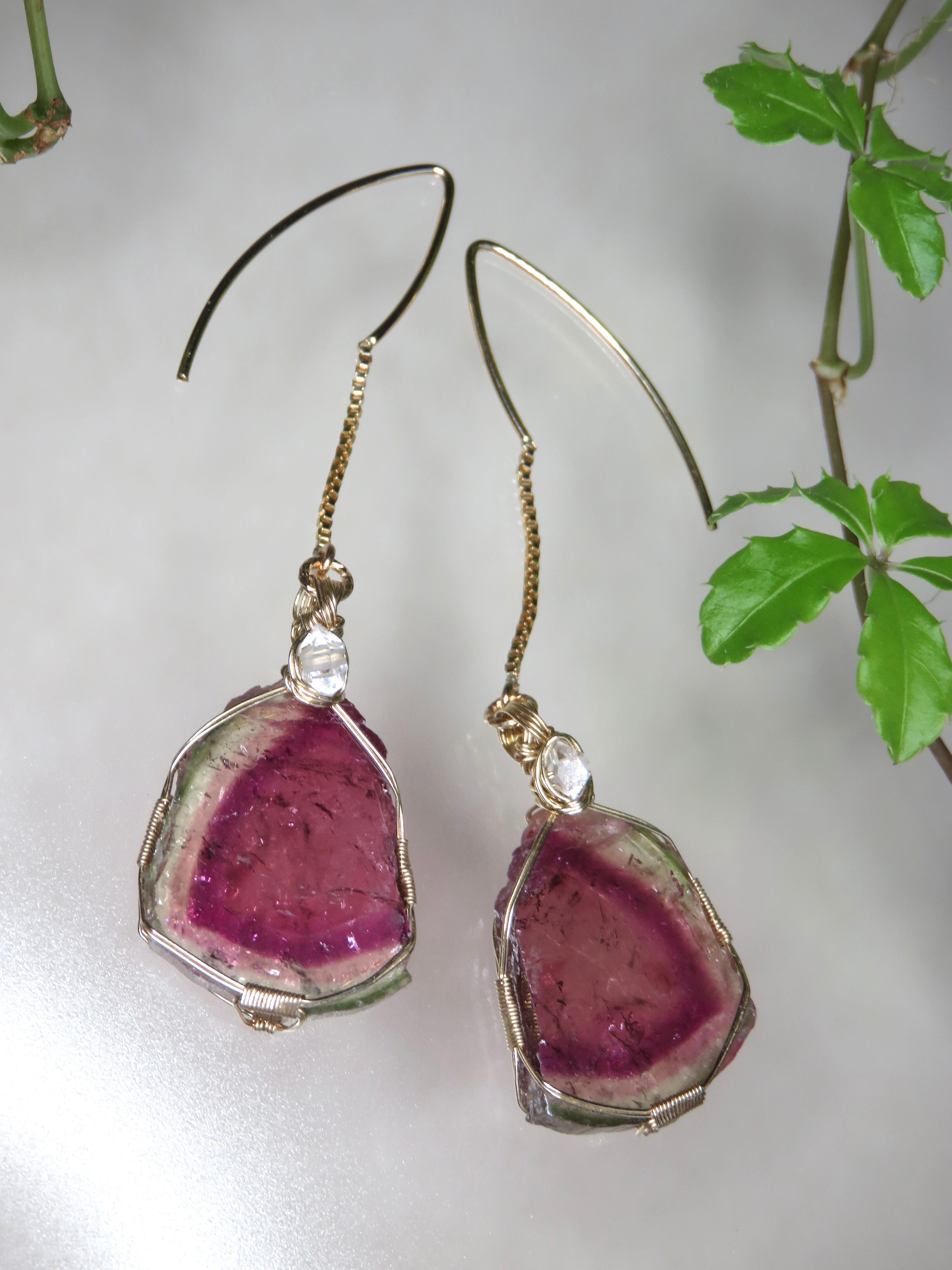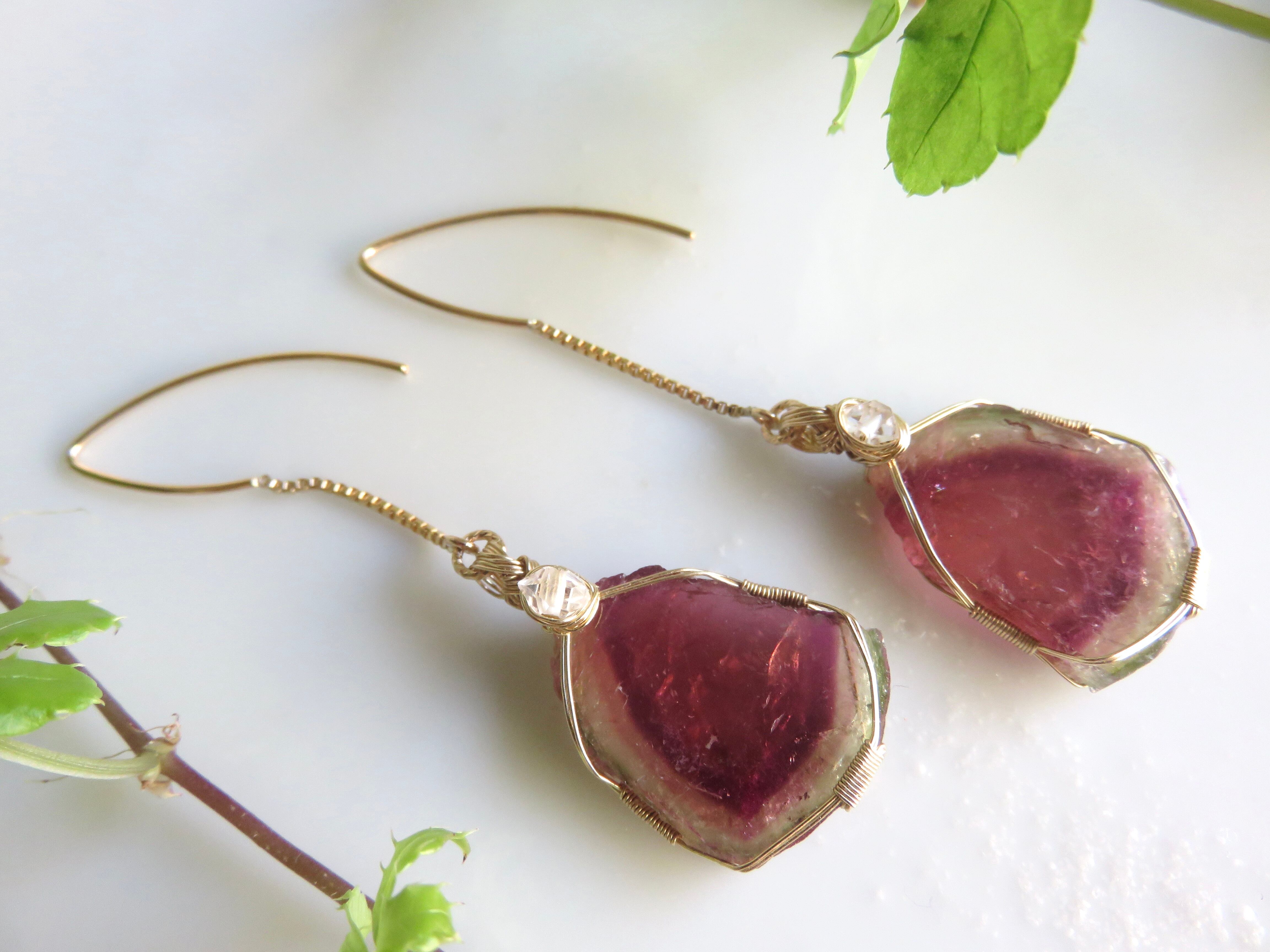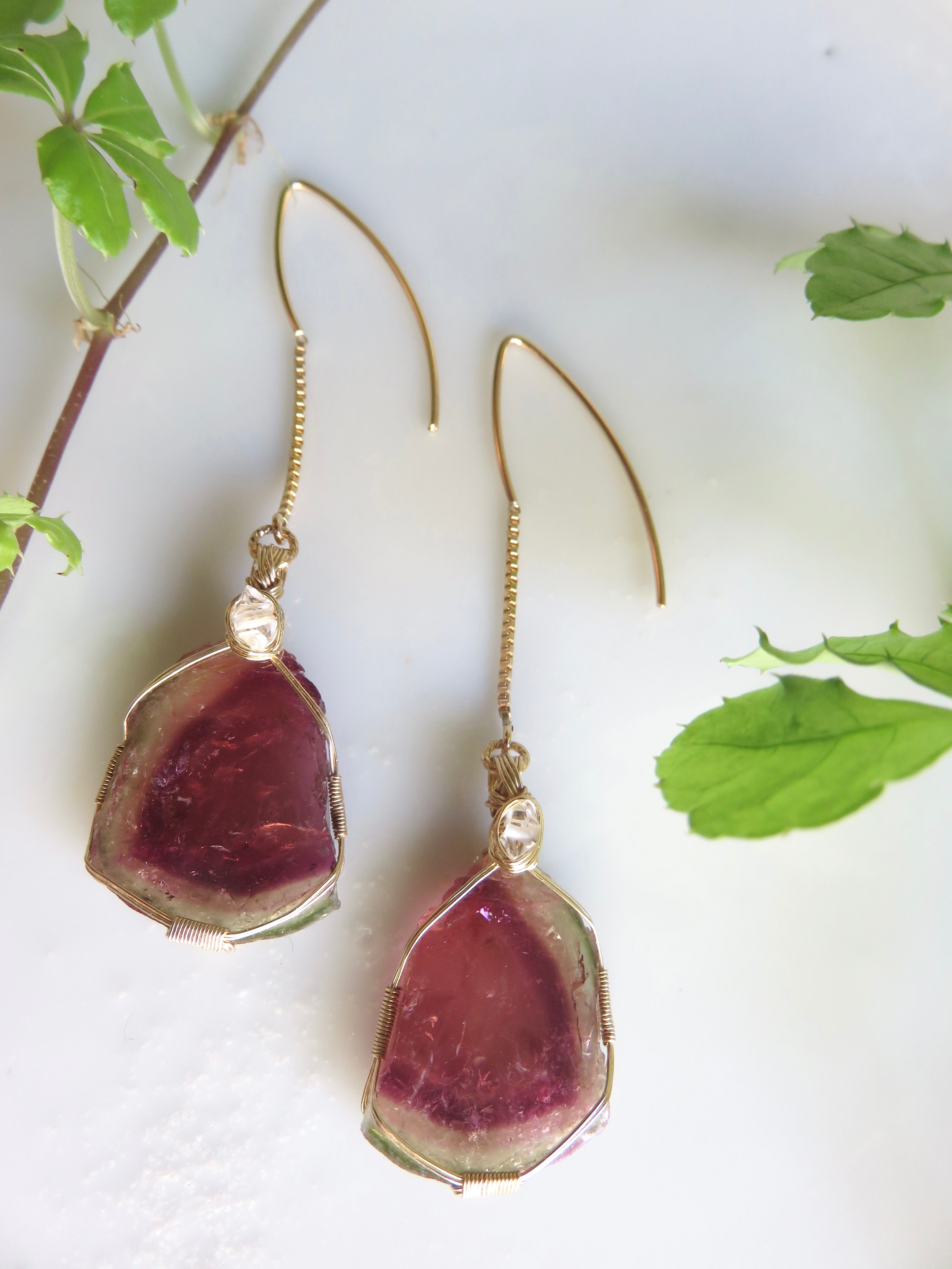 こちらのブラジル産の大きなウォーターメロンのペアのスライスは、もともと同じ結晶をカットしたものと思われるそっくりの双子のピース。一粒でも十分主役になるゴージャスなウォーターメロンを、贅沢にペアで使用したピアスに仕立てました。