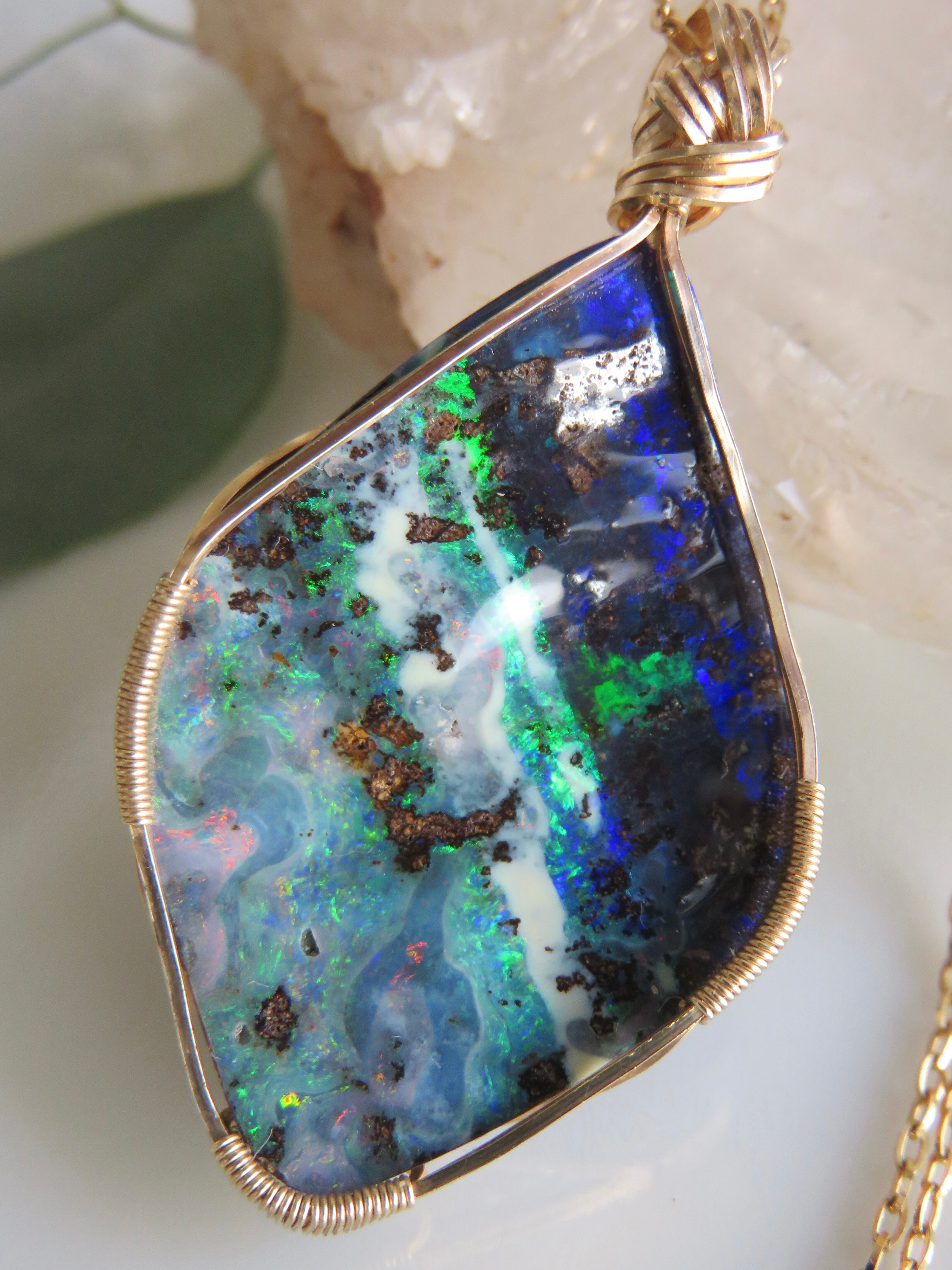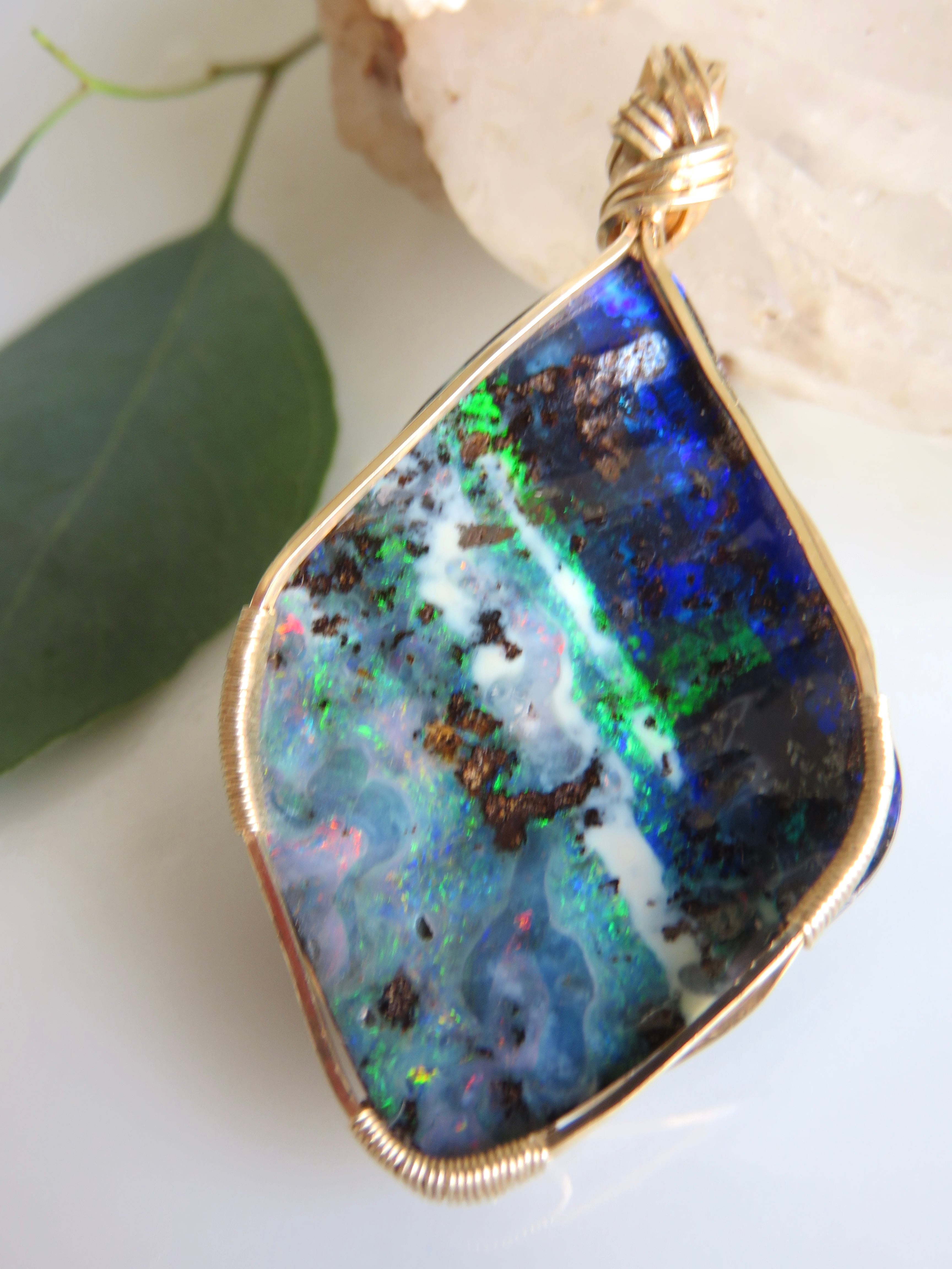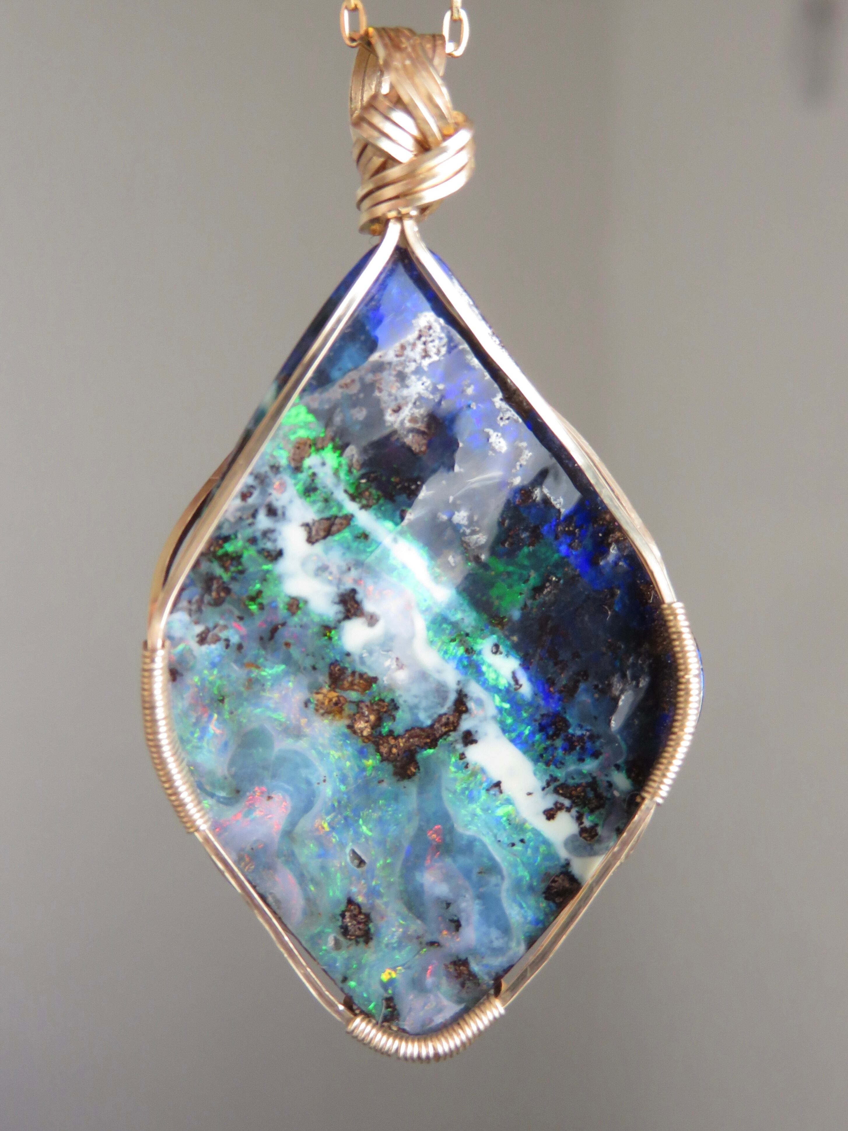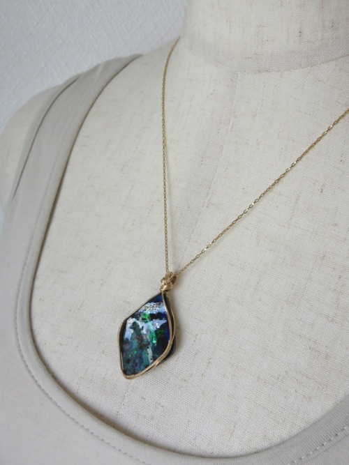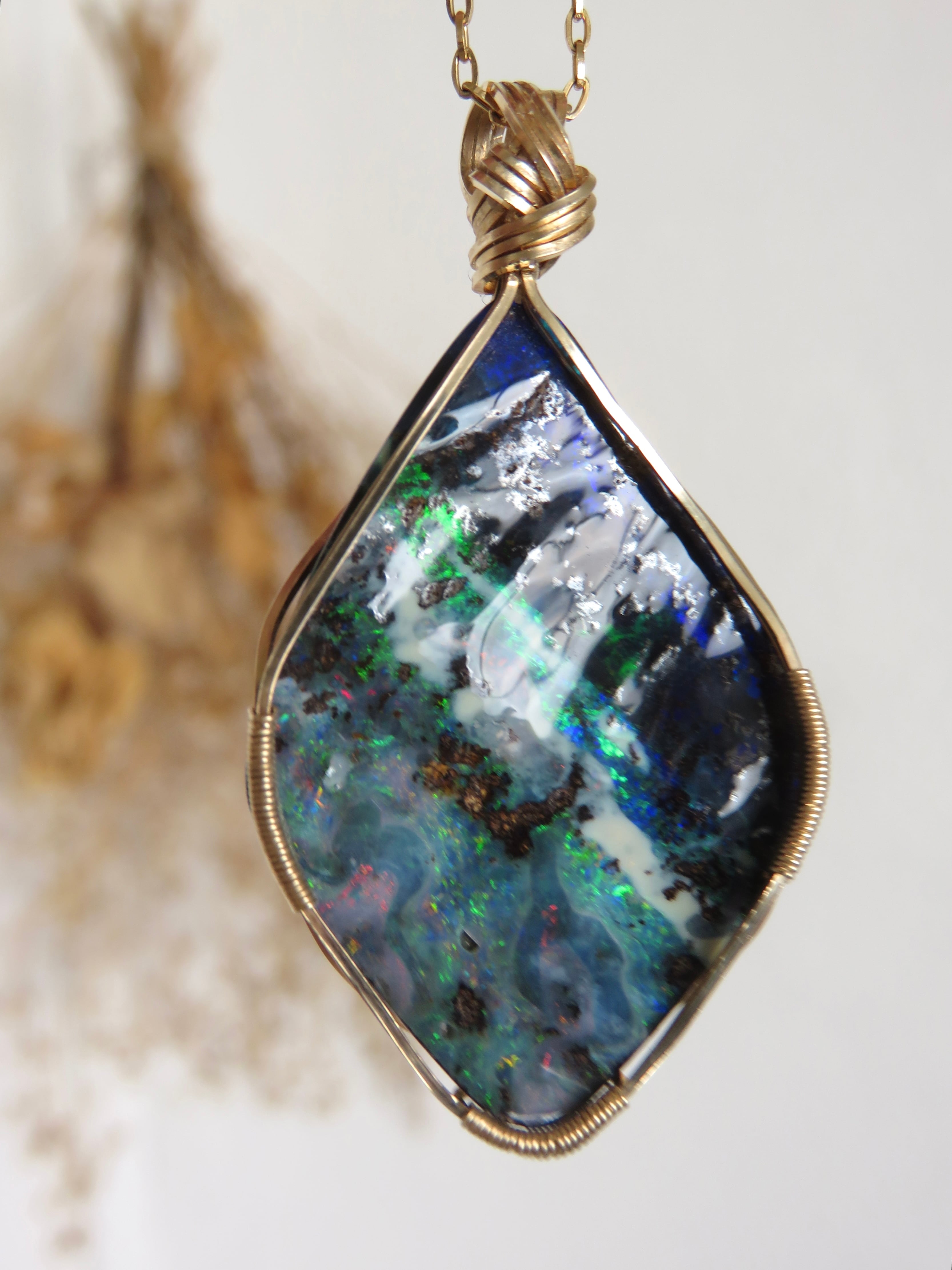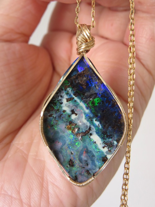 大粒で特別な美しさのオーストラリア産のボルダーオパール(23.1ct)を女神巻き®︎ペンダントトップに仕立てました。