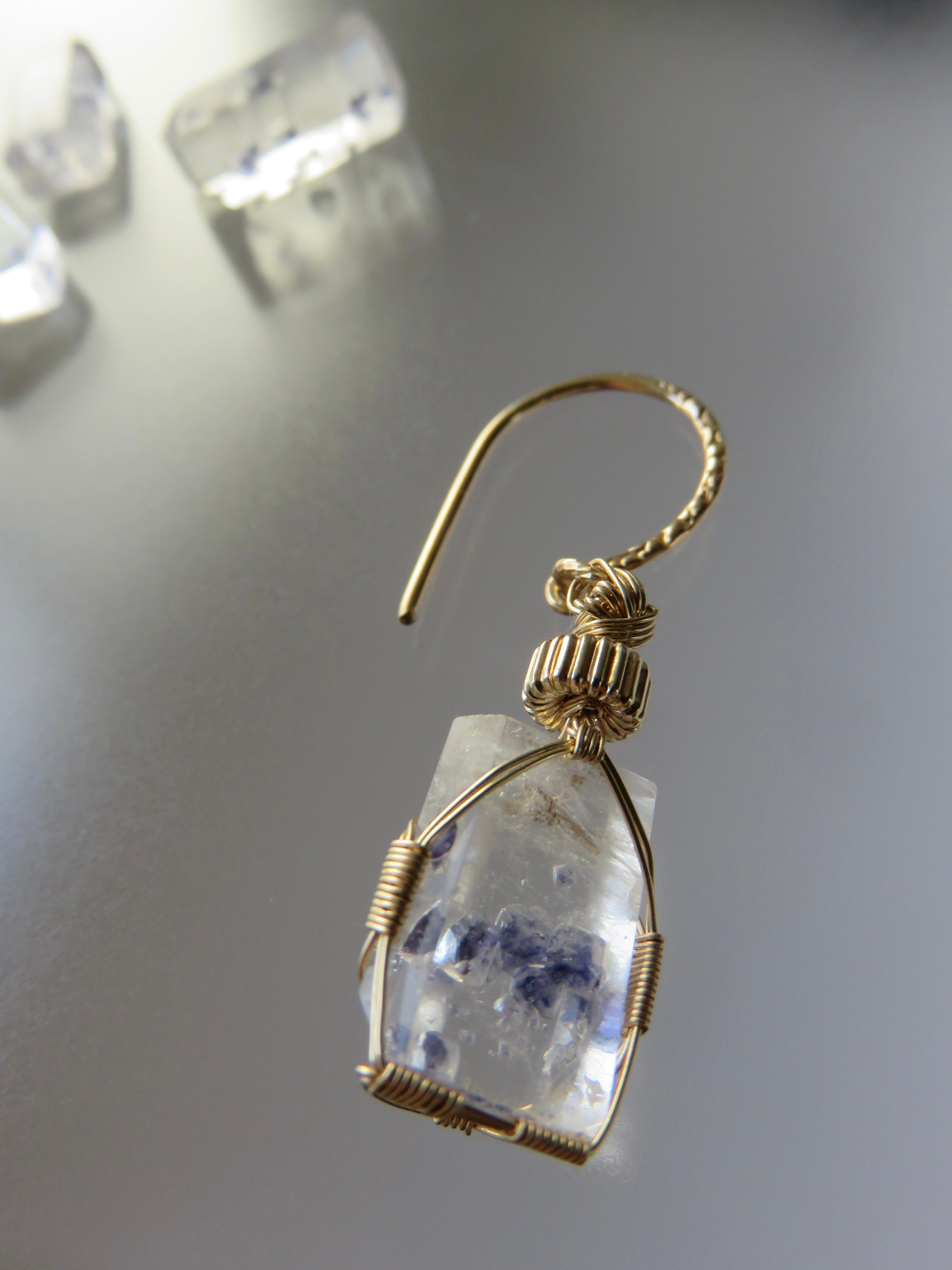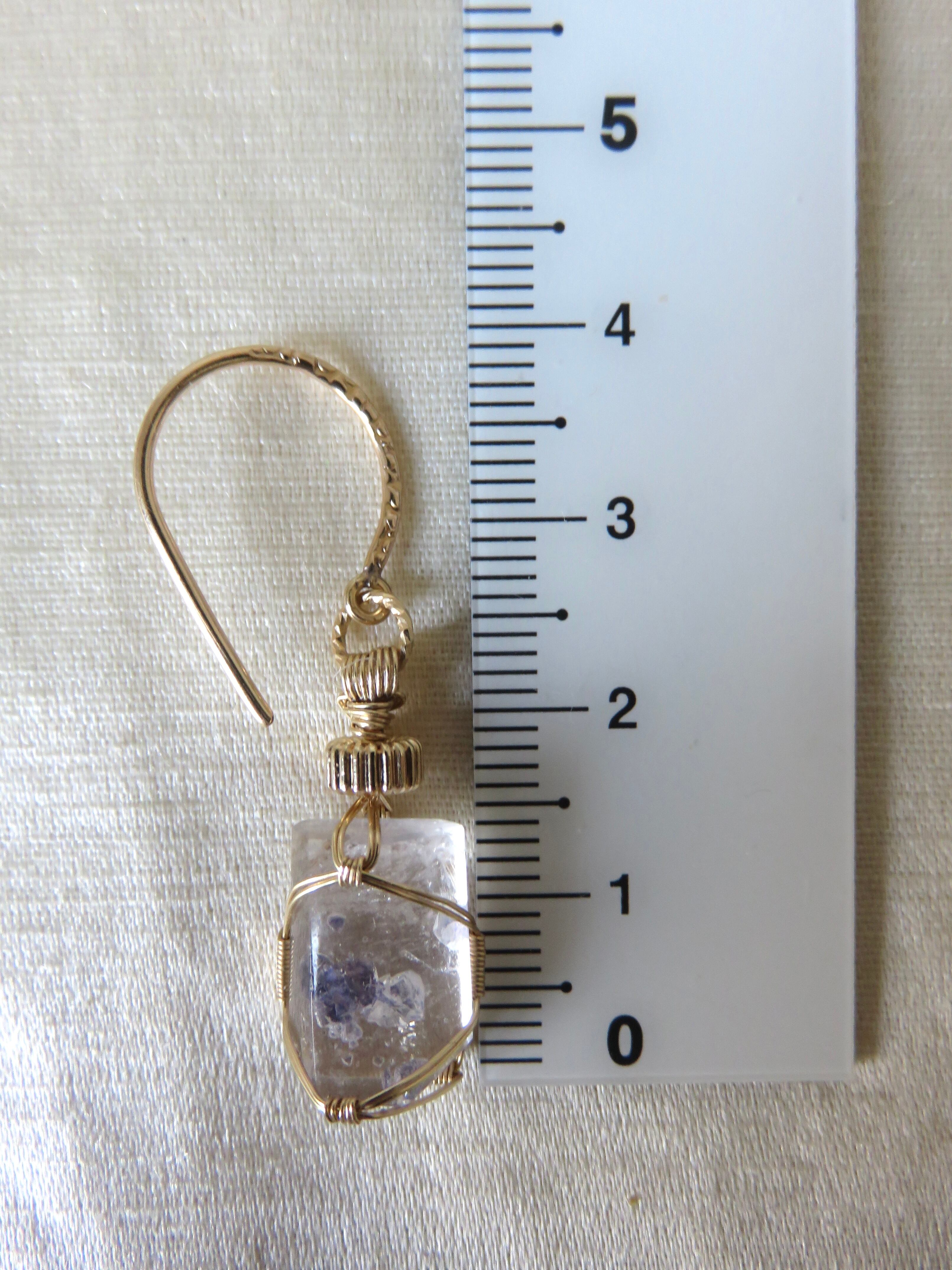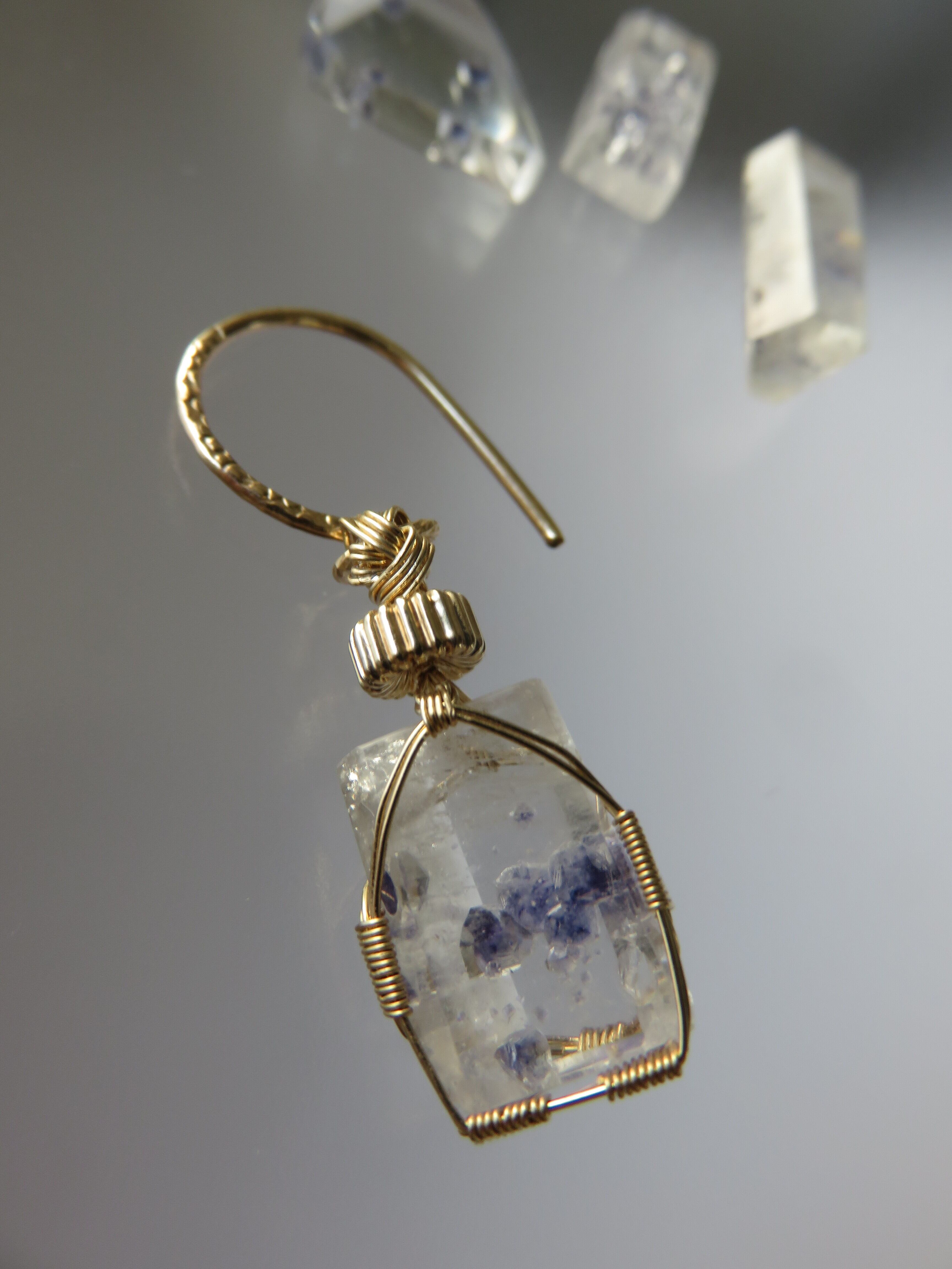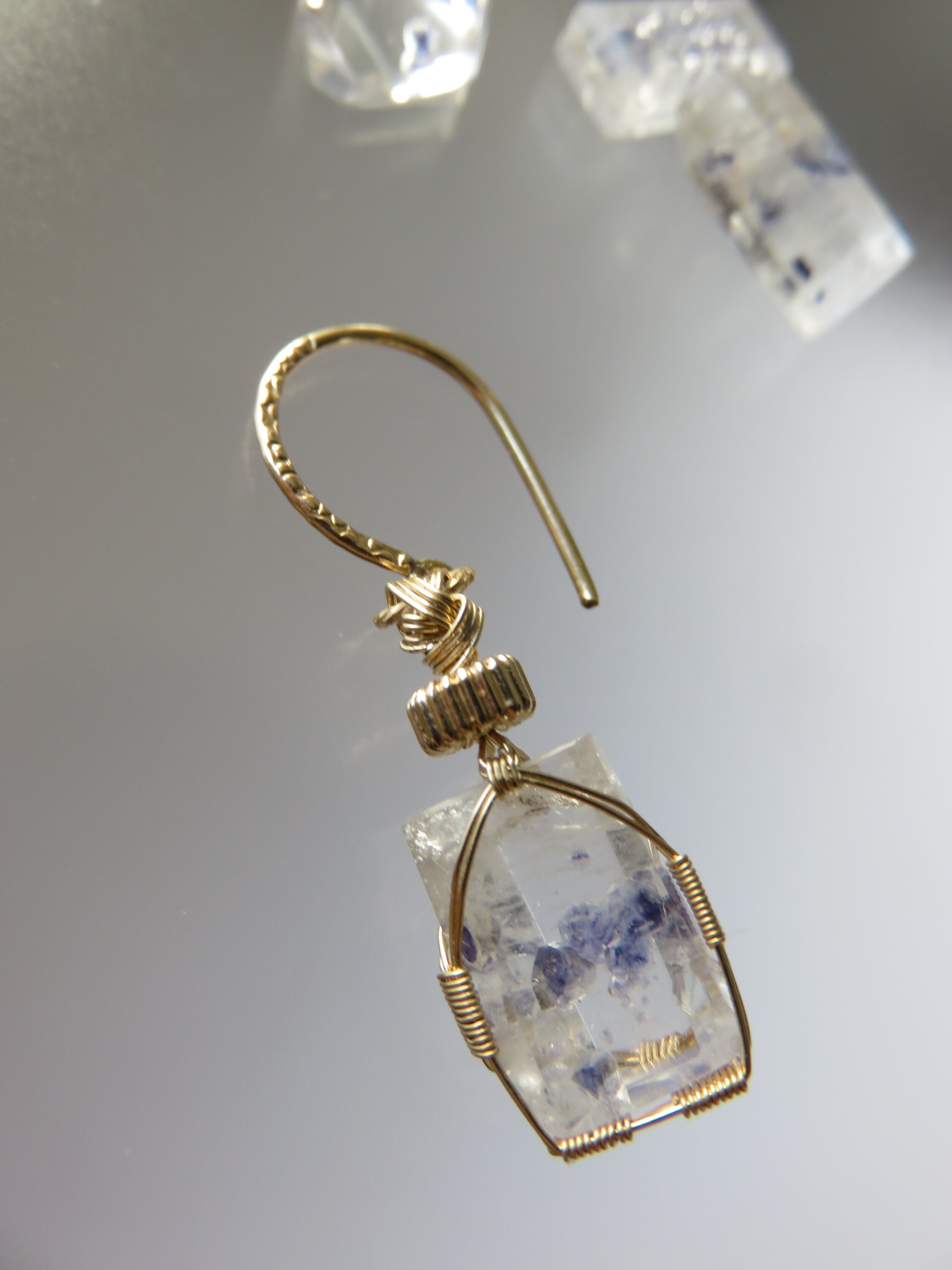 まるで氷柱の中にふわふわと浮かぶ飛行石の結晶が閉じ込められたような…美しいフローライトインクォーツを女神巻き®︎で仕立てて片耳ピアスにしました。