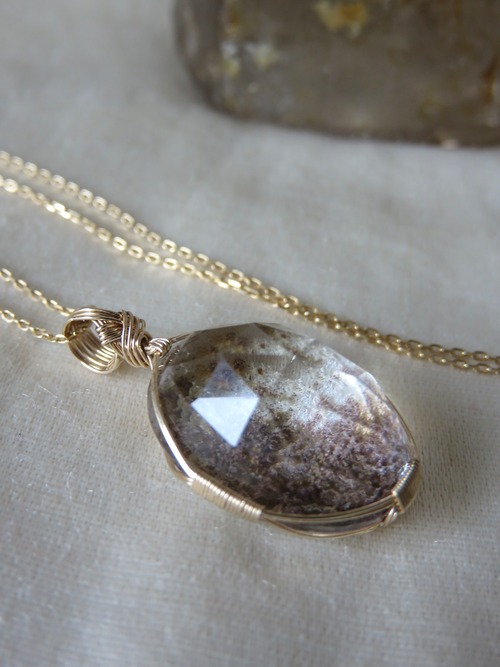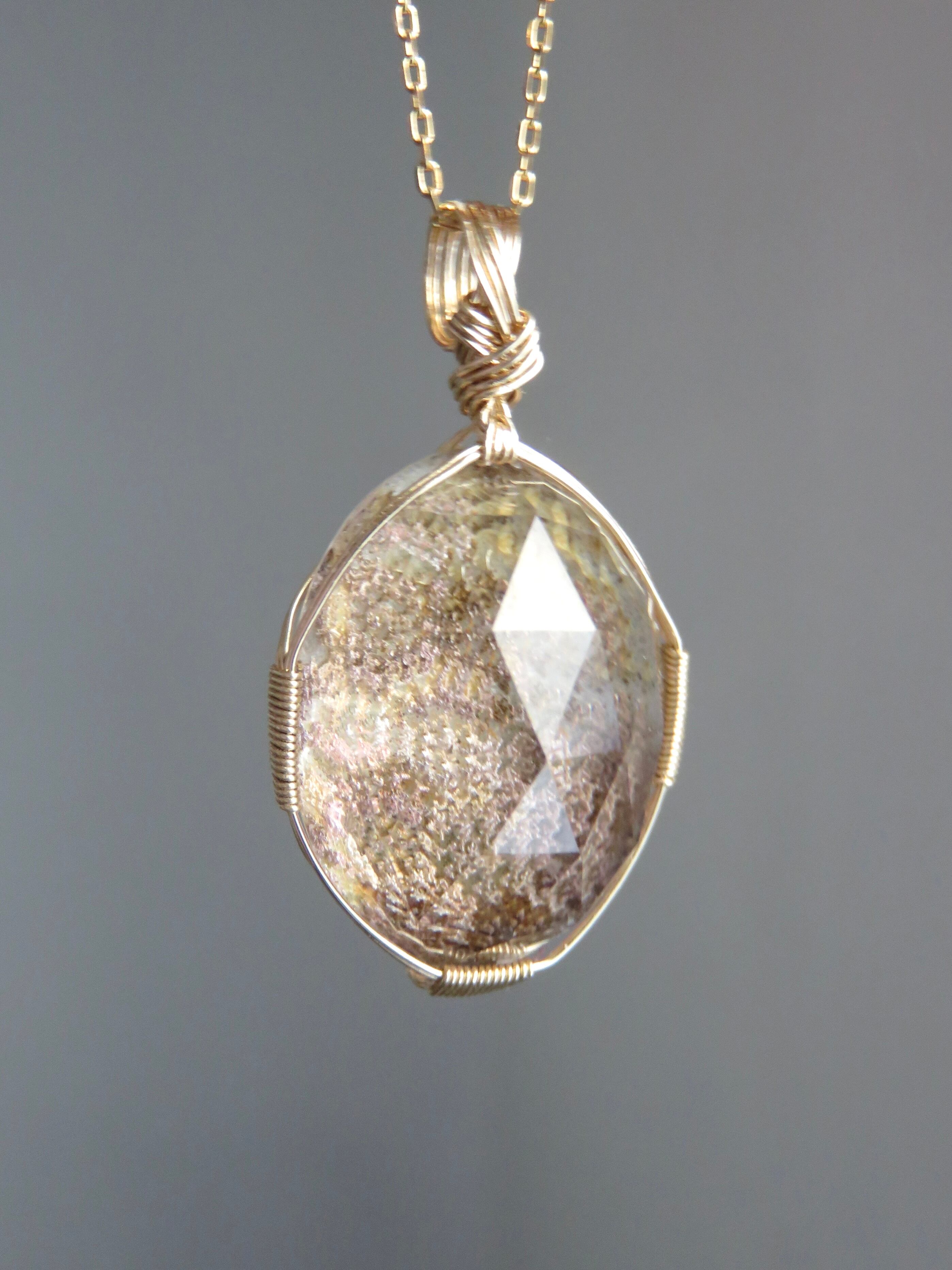 キラキラのローズカットが施されたガーデンクォーツを女神巻きペンダントトップに仕立てました。